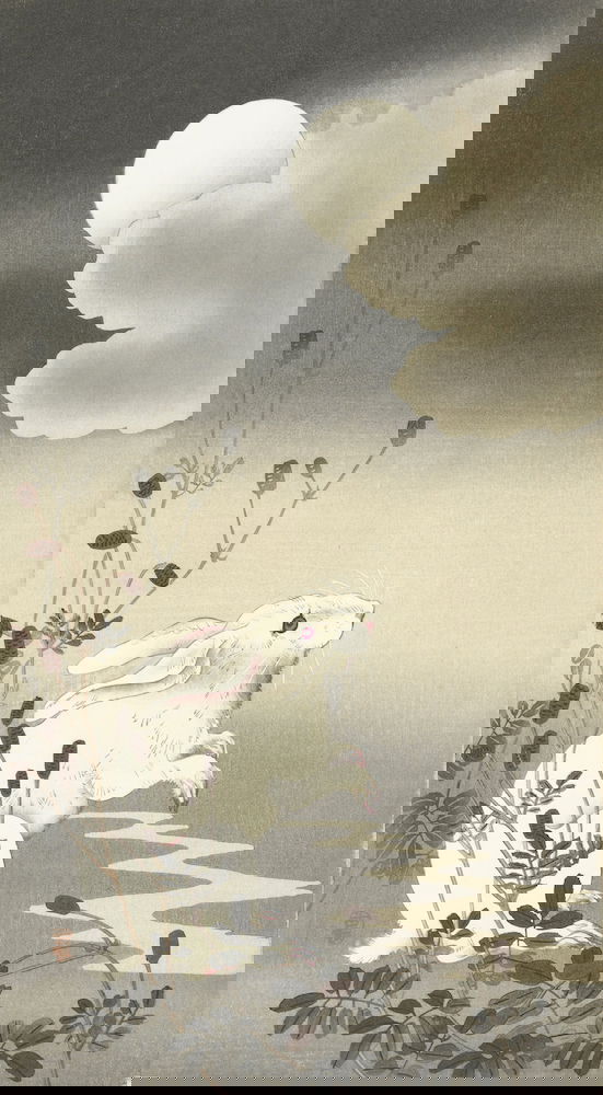 White rabbit, sitting on its hind legs, beneath the glow of a full moon partly hidden by clouds.