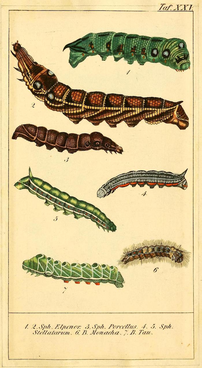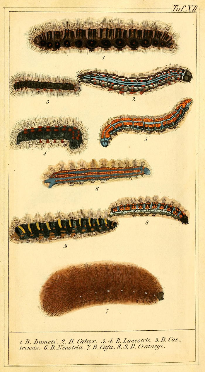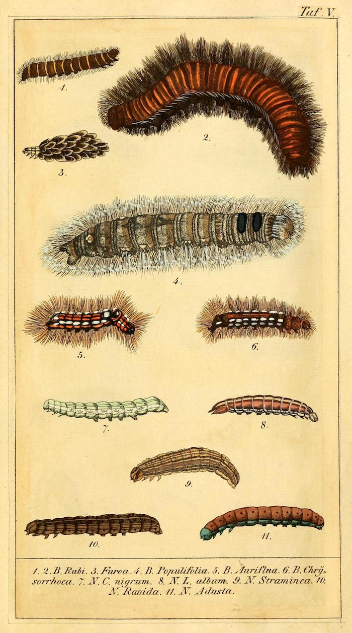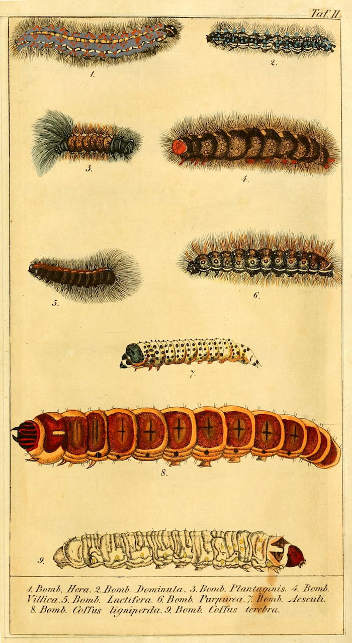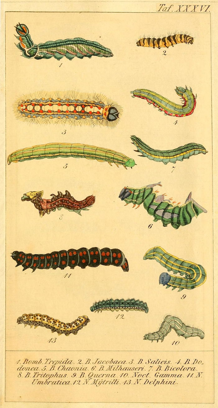 These wonderful illustrations come from Chronologischer Raupenkalender, oder, Naturgeschichte der europäischen Raupen (1837), an entomological volume by Christian Friedrich Vogel outlining which caterpillars appear each month, as well as details on how to keep caterpillars and catch the butterflies into which they will transform. An added quirk of the book will be more immediately obvious to German speakers — Vogel means "bird", the caterpillar's main predator.