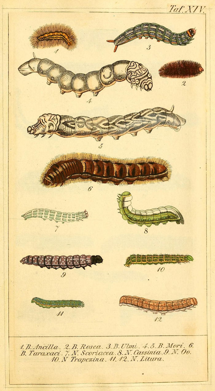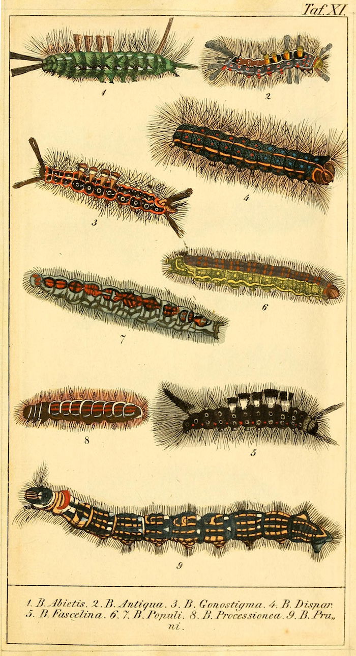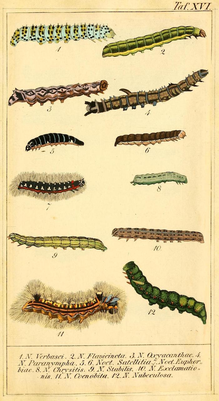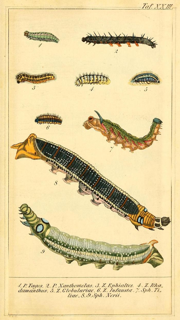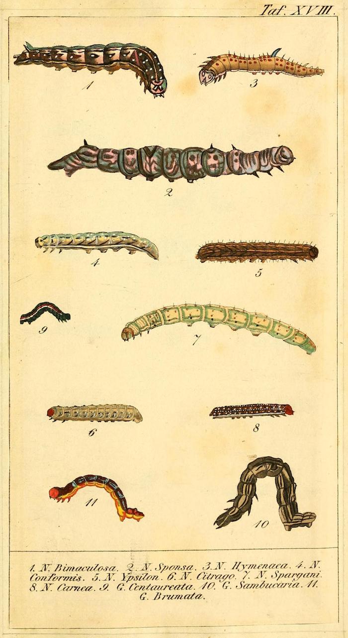 These wonderful illustrations come from Chronologischer Raupenkalender, oder, Naturgeschichte der europäischen Raupen (1837), an entomological volume by Christian Friedrich Vogel outlining which caterpillars appear each month, as well as details on how to keep caterpillars and catch the butterflies into which they will transform. An added quirk of the book will be more immediately obvious to German speakers — Vogel means "bird", the caterpillar's main predator.