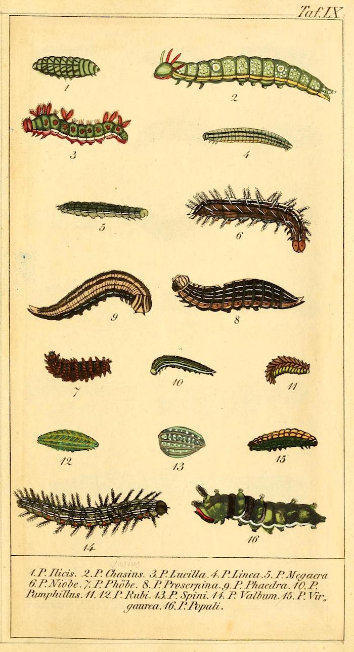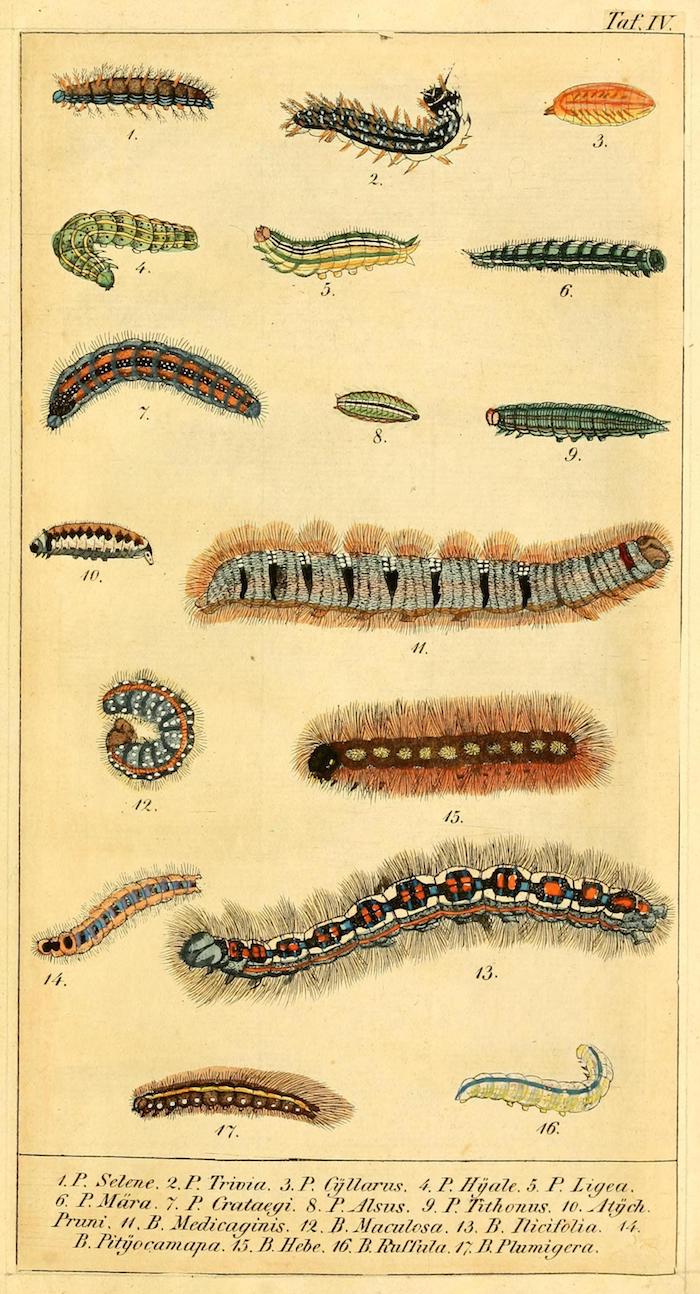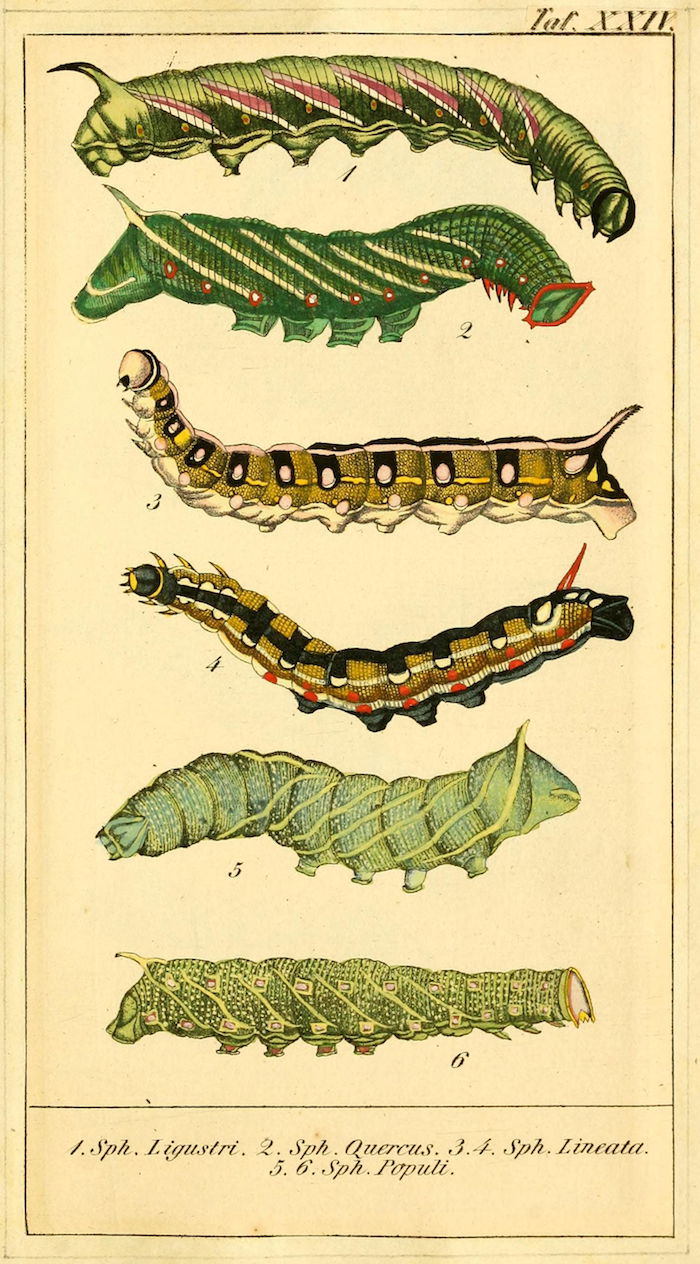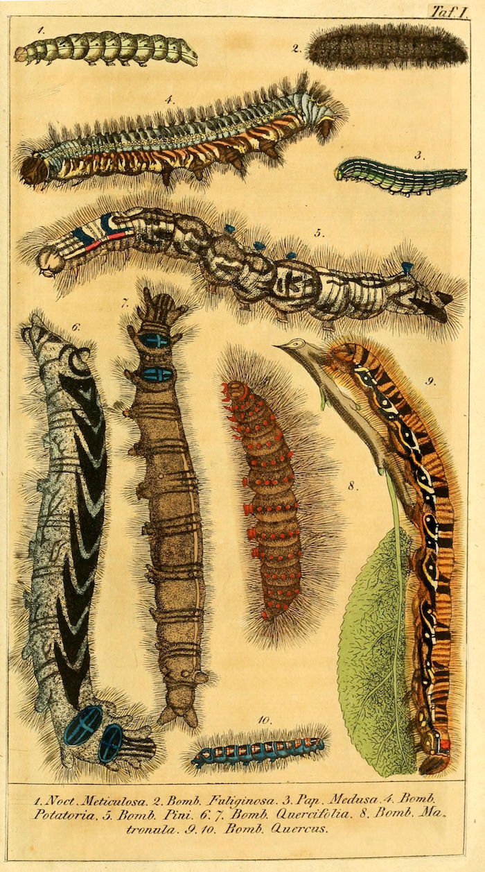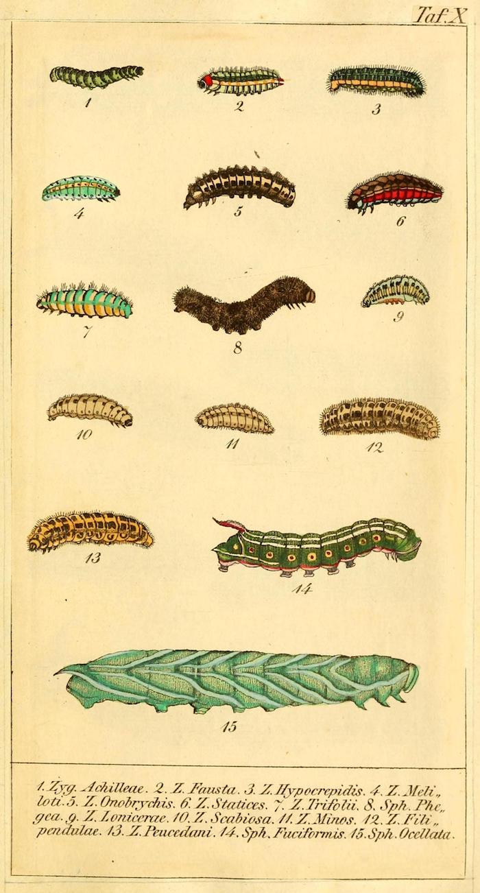 These wonderful illustrations come from Chronologischer Raupenkalender, oder, Naturgeschichte der europäischen Raupen (1837), an entomological volume by Christian Friedrich Vogel outlining which caterpillars appear each month, as well as details on how to keep caterpillars and catch the butterflies into which they will transform. An added quirk of the book will be more immediately obvious to German speakers — Vogel means "bird", the caterpillar's main predator.