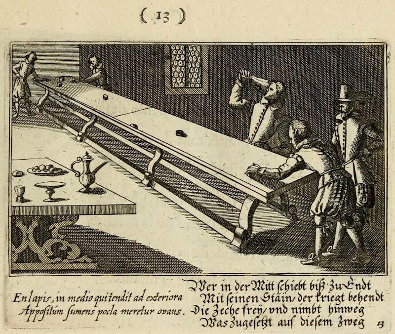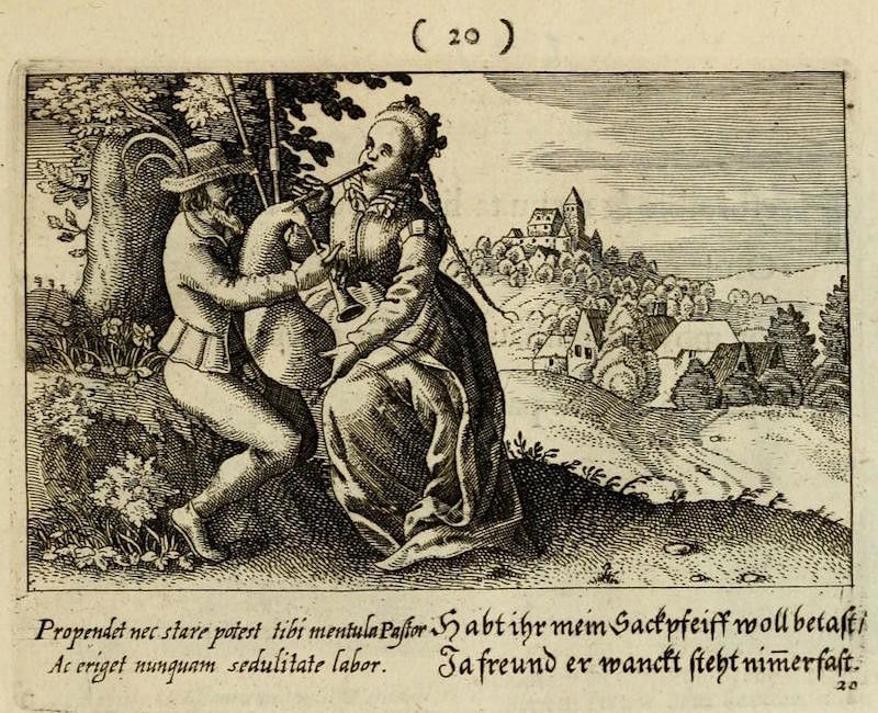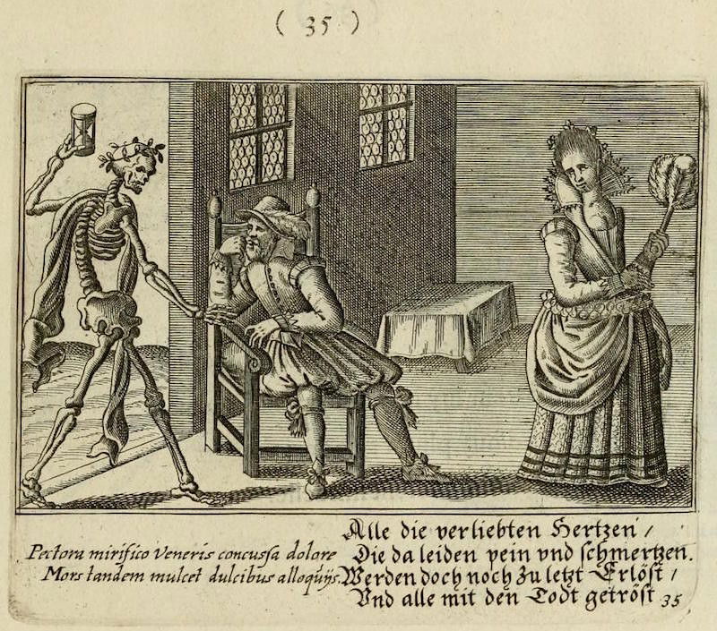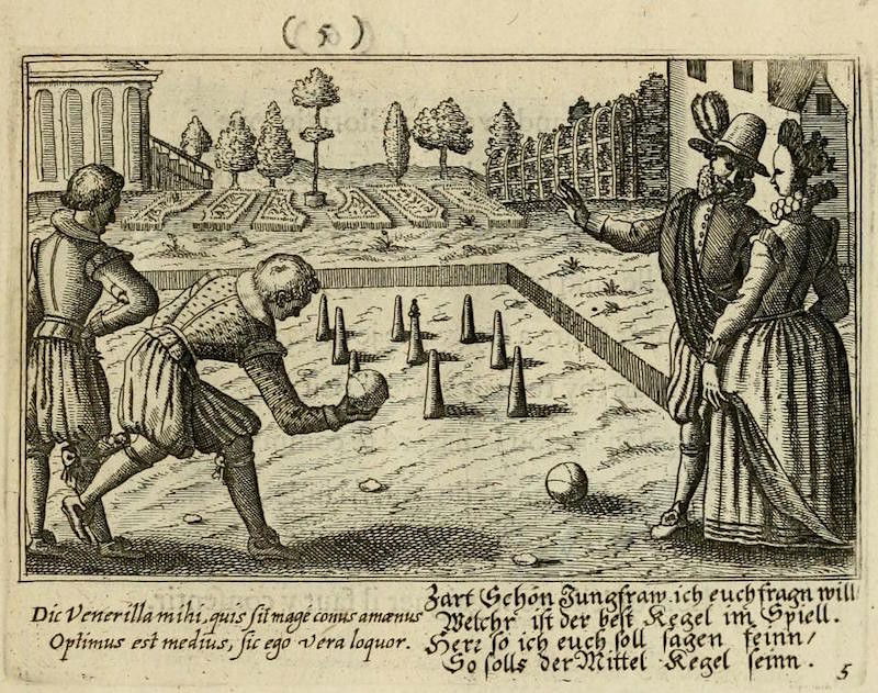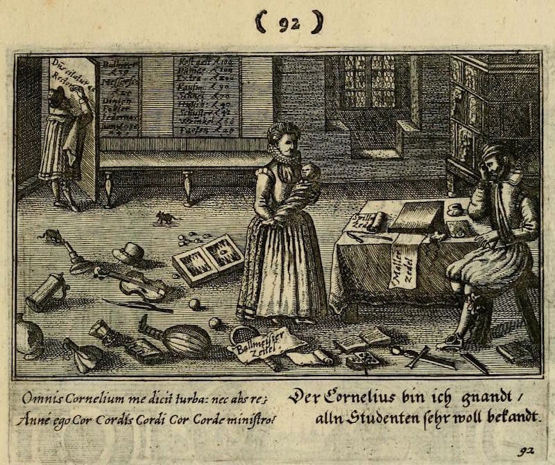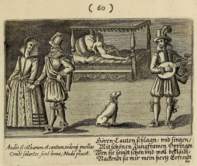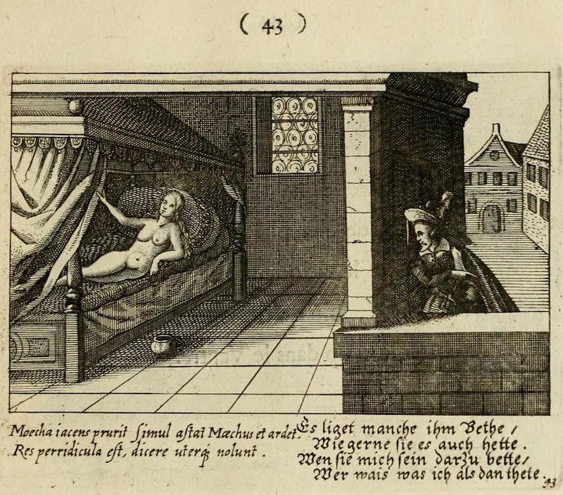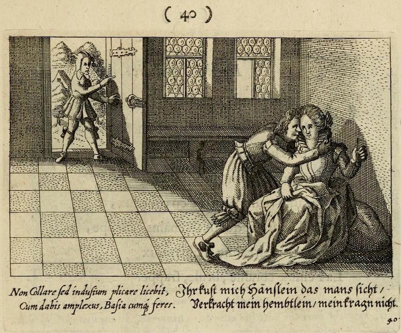 With its full title translating as "The centre of love: discovered through various emblems, gallant and facetious", this delightfully illustrated emblem book is an exploration of all corners of seventeenth-century courtship and love. The wonderful set of copper engravings are by Peter Rollos (active 1619-1639), and were previously published around 1630 in Berlin (see our highlights below). For this later Parisian edition — published "chez Cupidon" — a preface has been added and additional text in French.