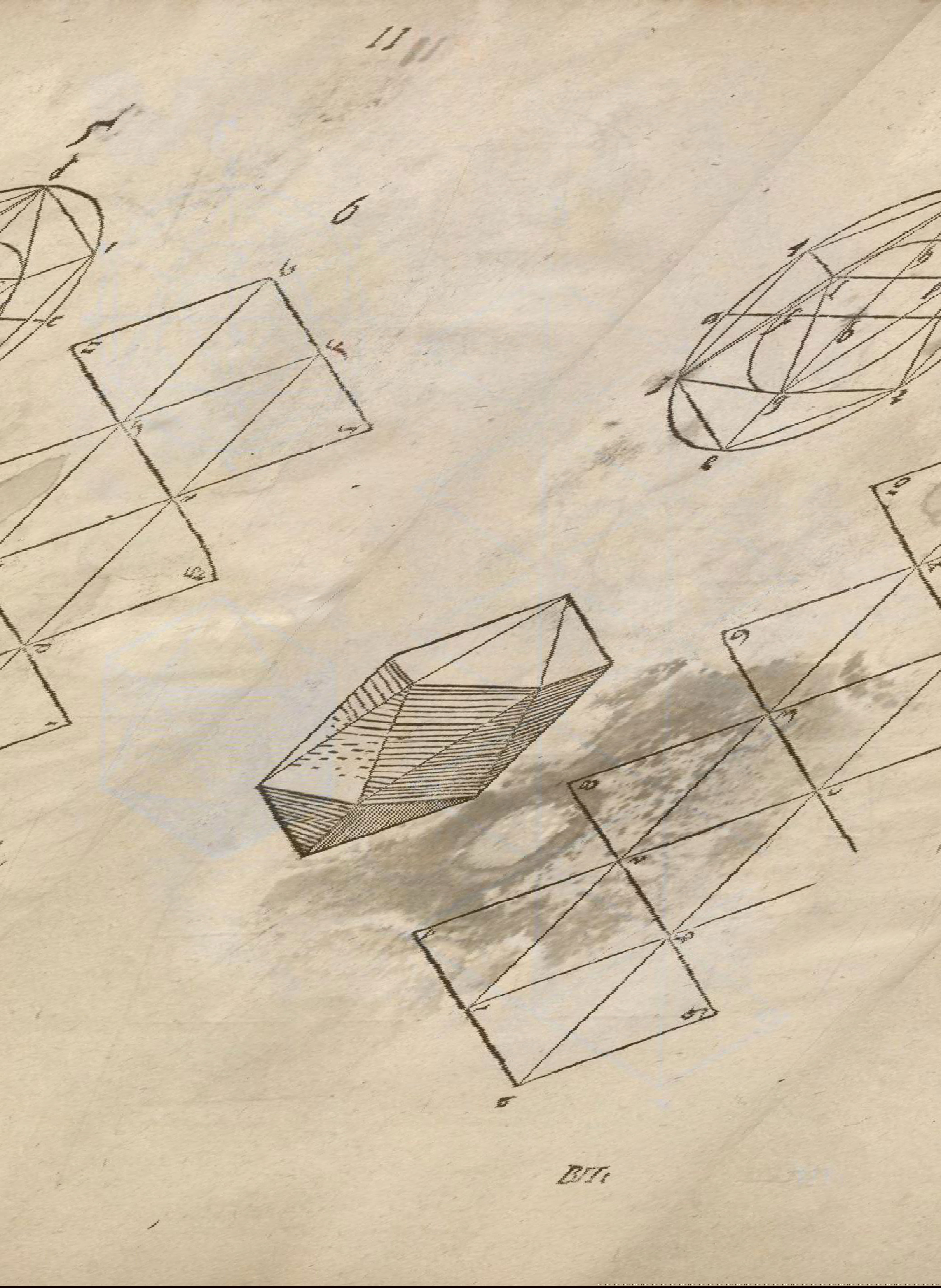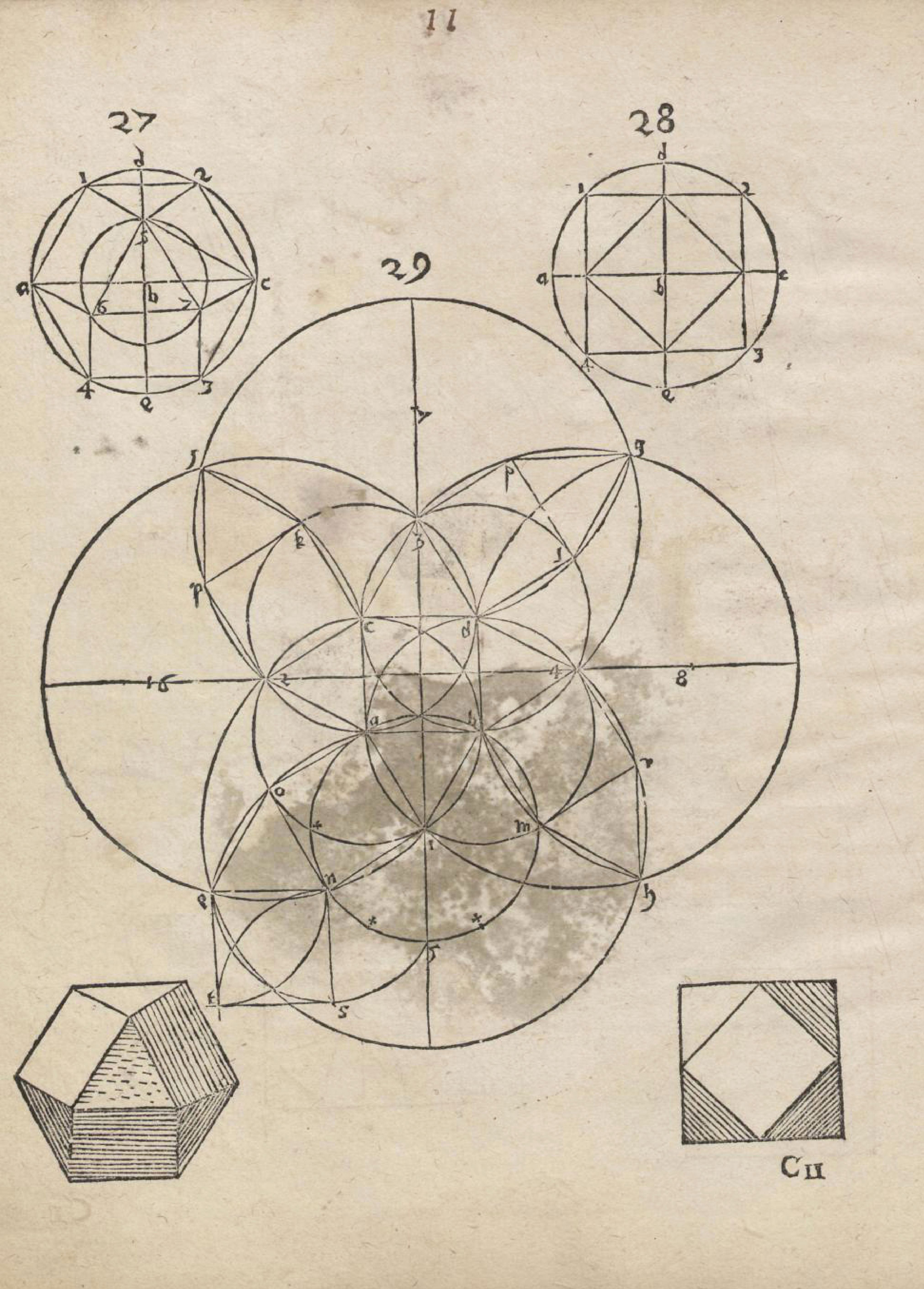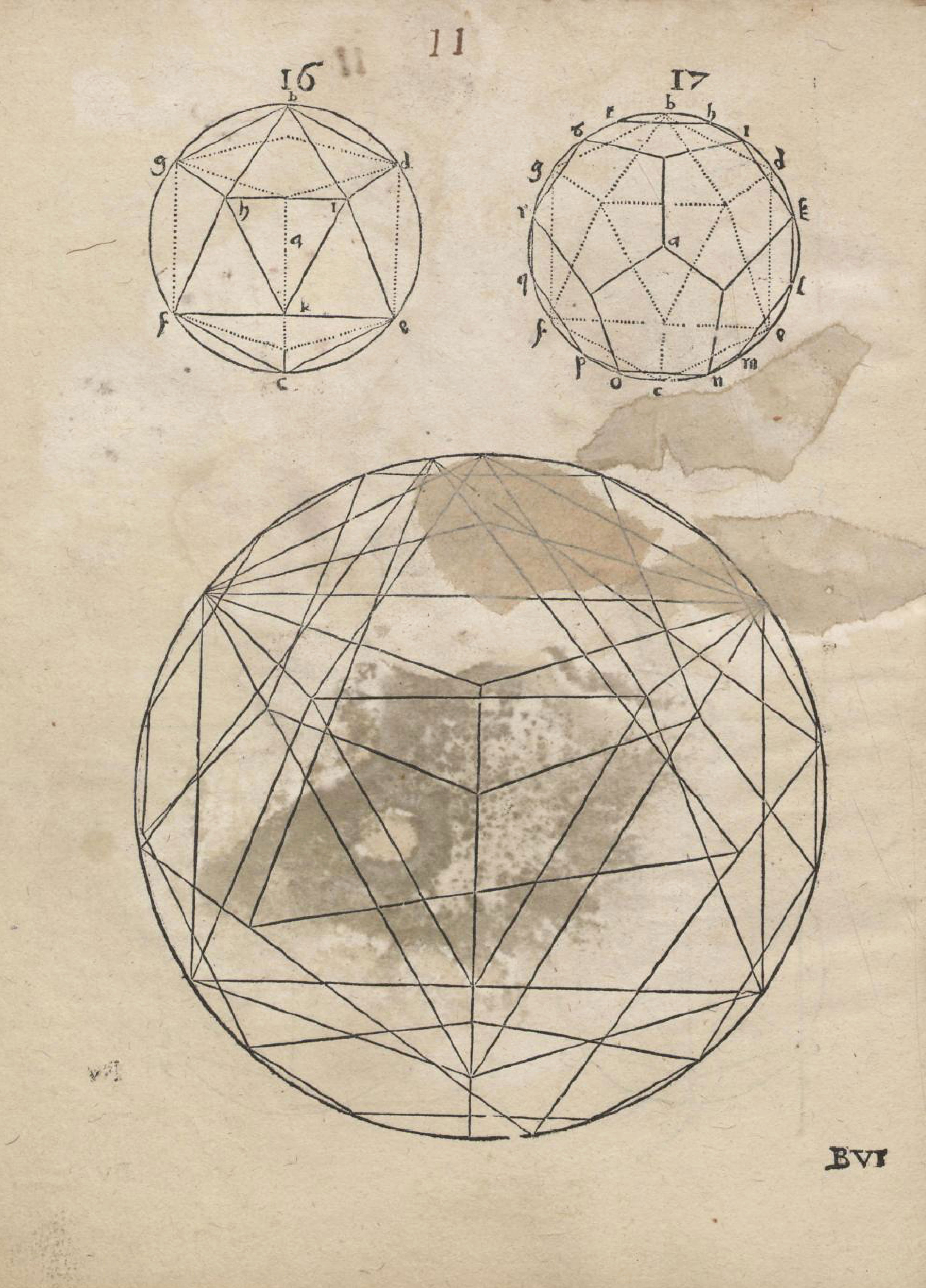 One theory about wormholes — those speculative cosmological structures that tunnel between distant points in the universe — holds that spacetime can be folded like a piece of paper, bringing the near and far into proximity. Examining the manuscript pages from Augustin Hirschvogel’s Geometria (1543), collected below, we are thrust into an analogous encounter with early solid geometry; suddenly the distant past is thrown up before our eyes on screen, and we glimpse another form of interdimensional folding, one much less hypothetical.