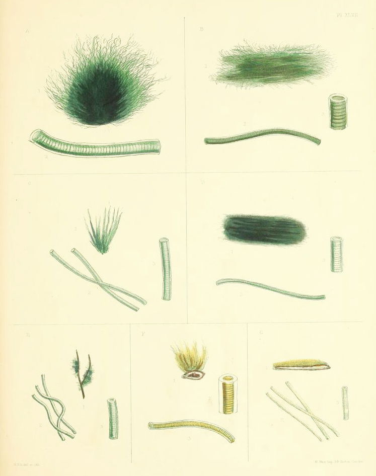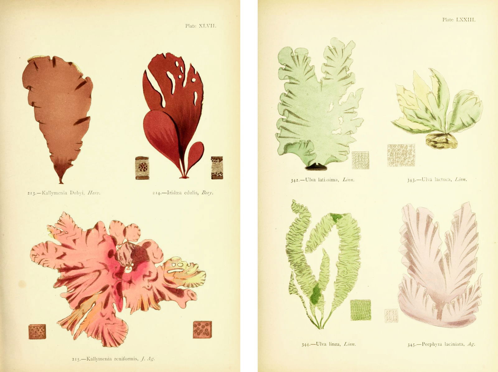 Seaweed from Charles F. Durant’s Algae and Corallines of the Bay & Harbor of New York (1850). Left is Dasya elegans; Right, clockwise from top right: Polysiphonia nigrescens, Ceramium diaphanum, Bryopsis plumosa, and Laminaria saccharina.