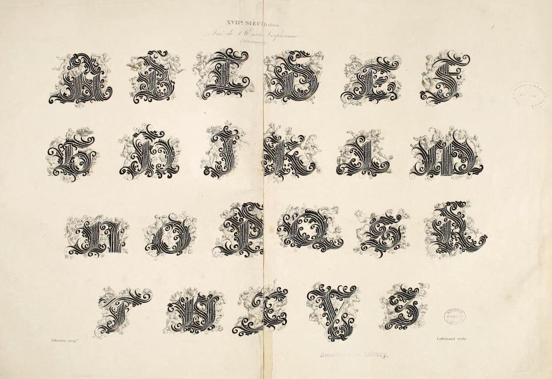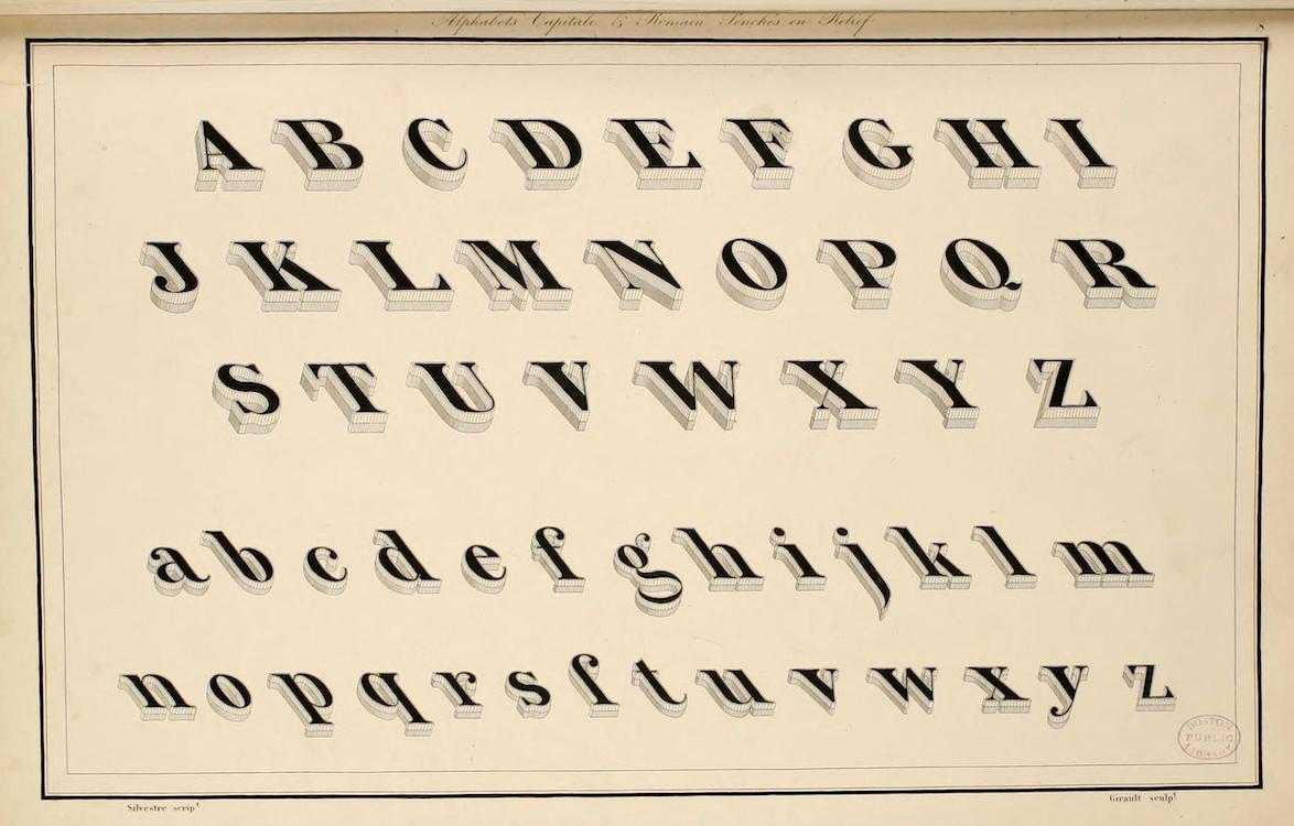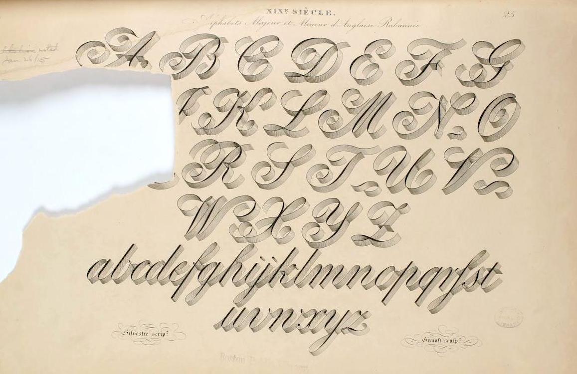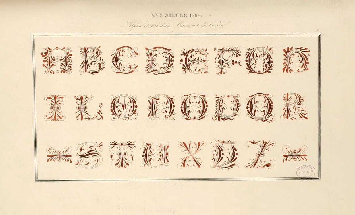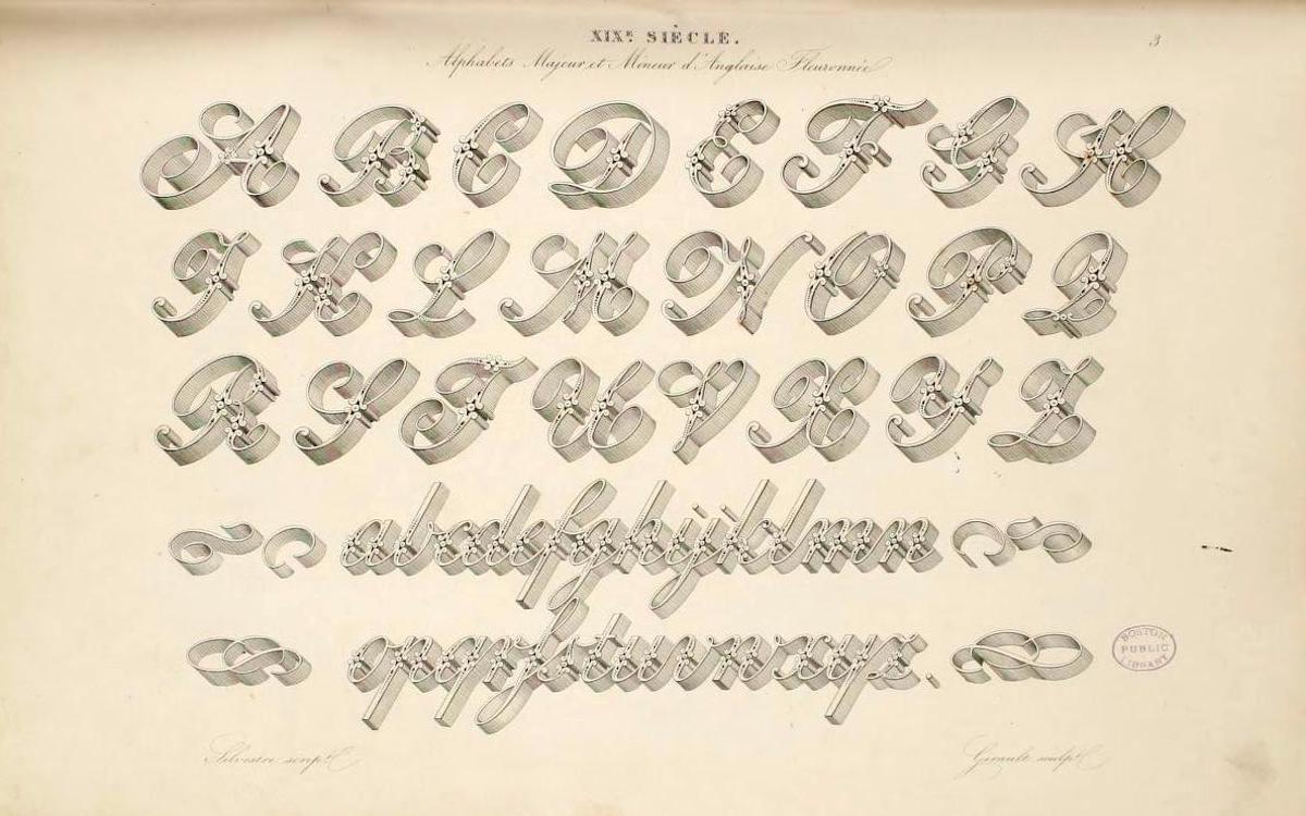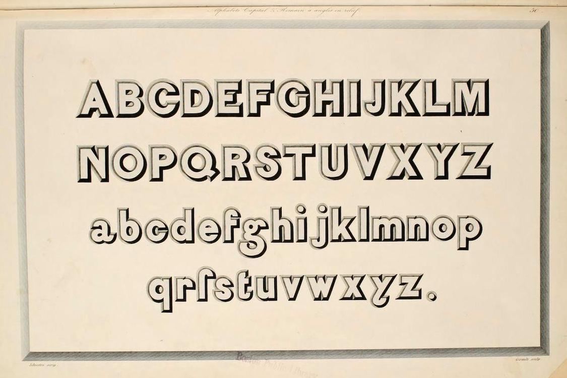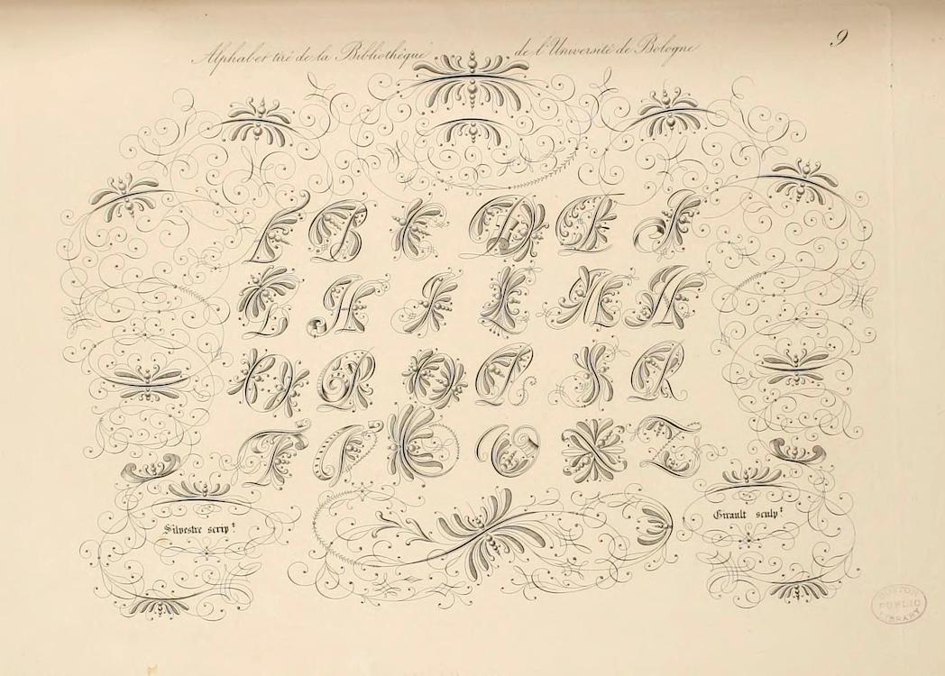 This “alphabet album”, a beautiful book of calligraphy and typographic engraving, was assembled by Joseph-Balthazar Silvestre (1791–1869), a paleographer, calligrapher, and miniaturist painter born in Avignon who later taught the sons of King Louis-Philippe I (1773–1850) how to form their letters.