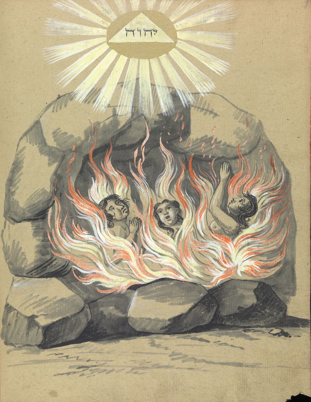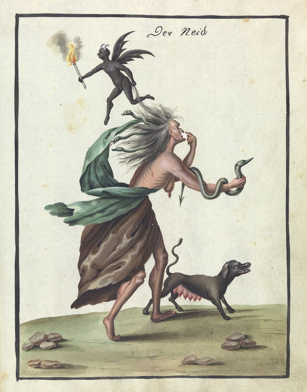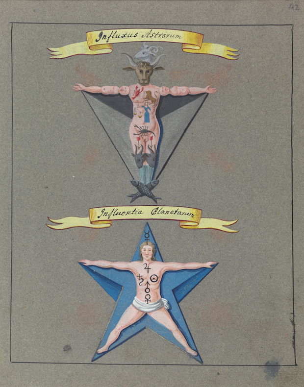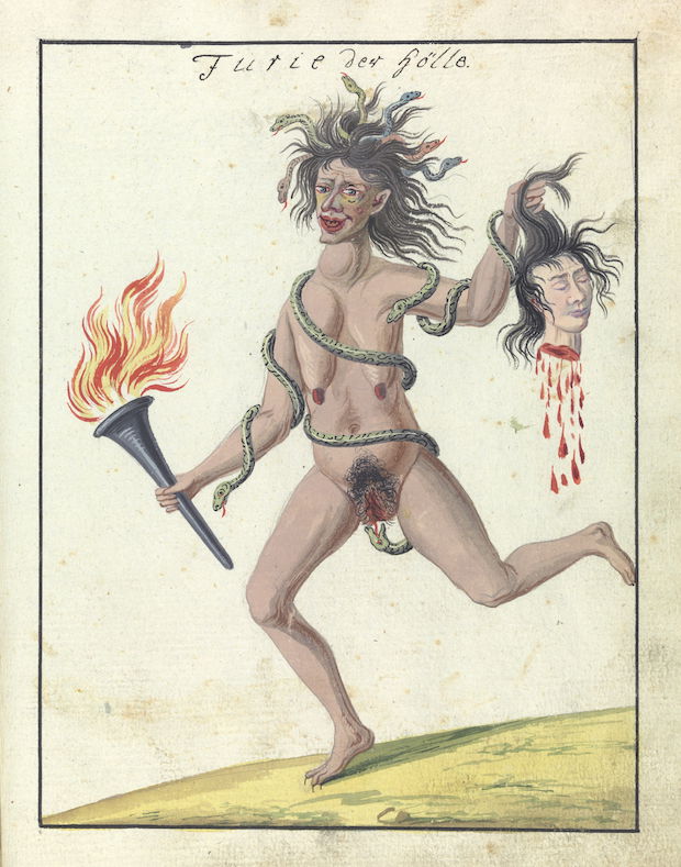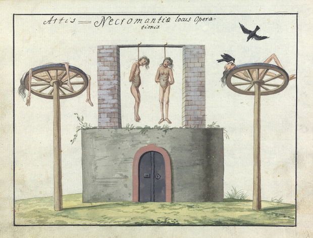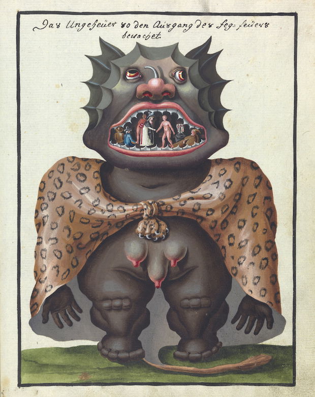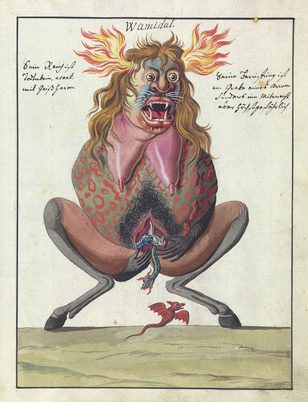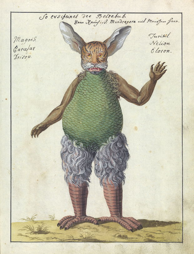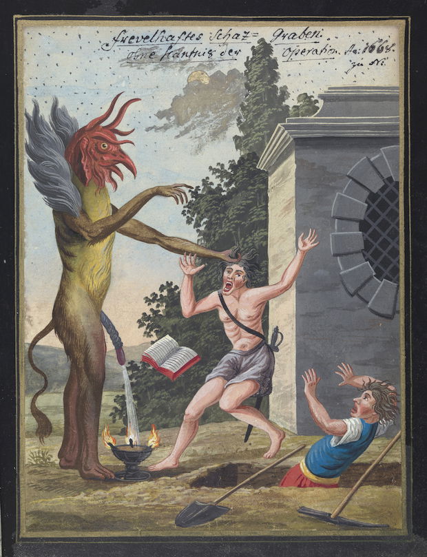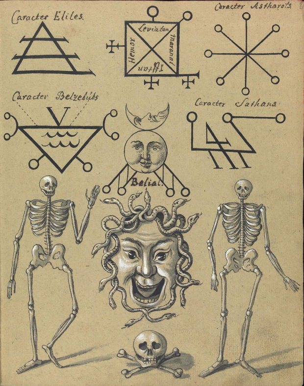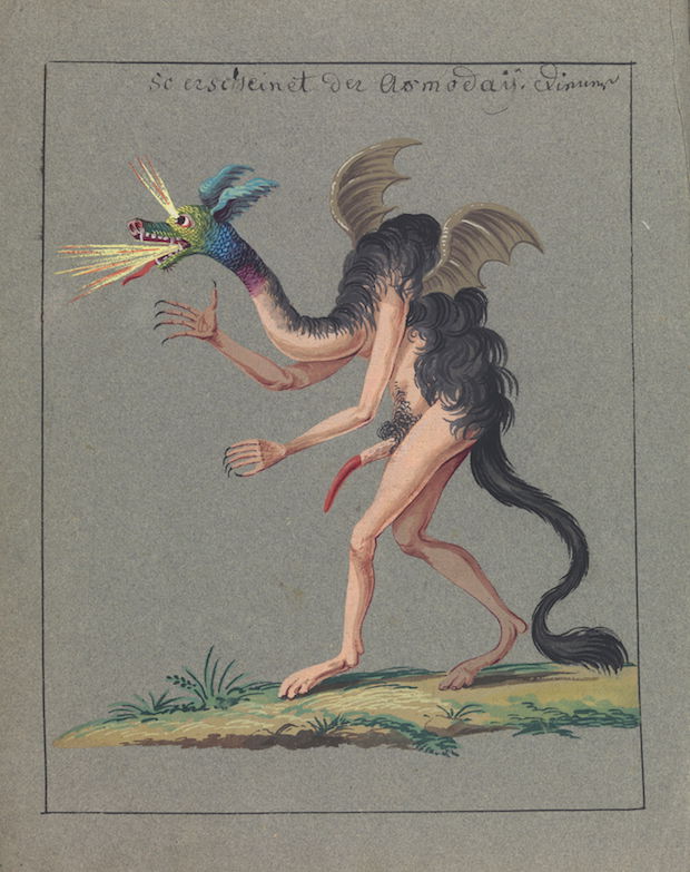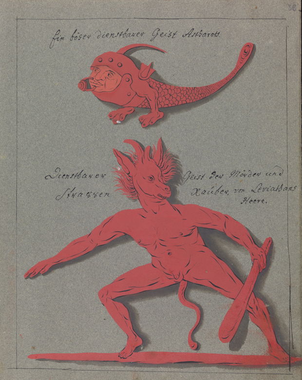A selection of pages from an eighteenth-century demonology book comprised of more than thirty exquisite watercolours showing various demon figures, as well as magic and cabbalistic signs. The full Latin title of Compendium rarissimum totius Artis Magicae sistematisatae per celeberrimos Artis hujus Magistros, roughly translates to "A rare summary of the entire Magical Art by the most famous Masters of this Art". With a title page adorned with skeletons and the warning of Noli me tangere (Do not touch me), one quickly gets a sense of the dark oddities lurking inside its pages. The bulk of the illustrations depict a varied bestiary of grotesque demonic creatures up to all sorts of appropriately demonic activities, such as chewing down on severed legs, spitting fire and snakes…