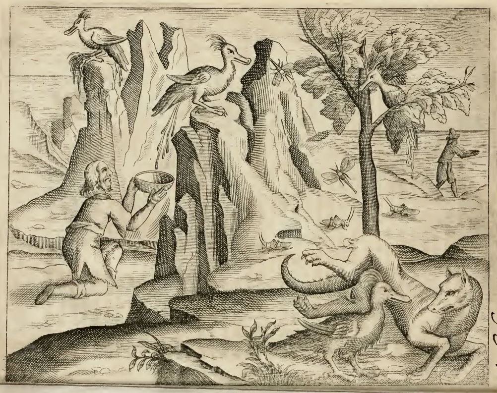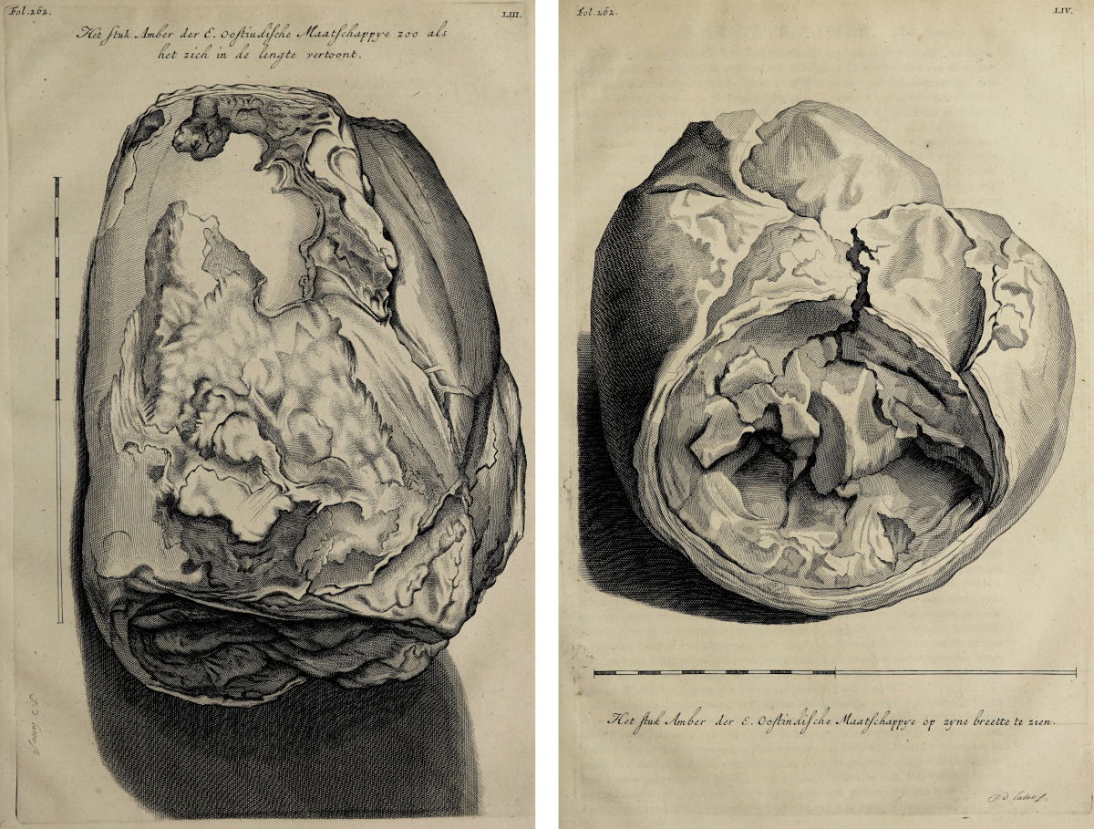 The excrement of an East Indian bird, which was once believed to be ambergris, is collected in a bowl. An illustration from Justus Fidus Klobius's Ambræ historiam (1666).