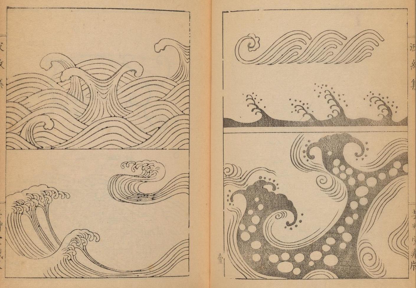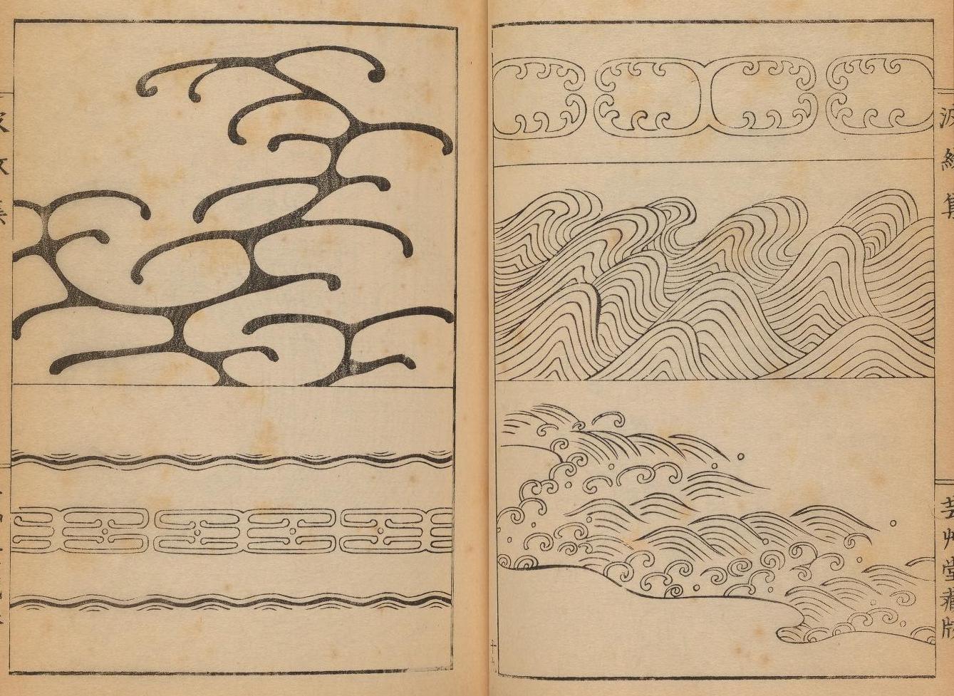 The three volumes above bring together a wonderful selection of wave and ripple designs produced by the Japanese artist Mori Yuzan, about whom not a lot is known, apart from that he hailed from Kyoto, worked in the Nihonga style, and died in 1917. The works would have acted as a kind of go-to guide for Japanese craftsmen looking to adorn their wares with wave and ripple patterns. The designs would have found their way onto swords (both blades and handles) and associated paraphernalia (known as "sword furniture"), as well as lacquerware, Netsuke, religious objects, and a host of other items. Peruse the pages above and also see some of our favourites below, including the excellent triple-page composite image (from volume 3) featured near the…