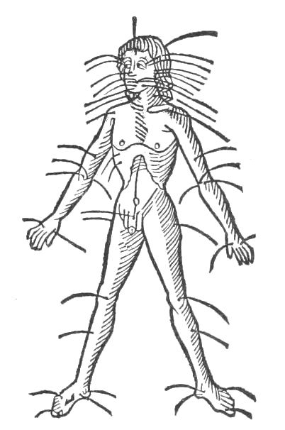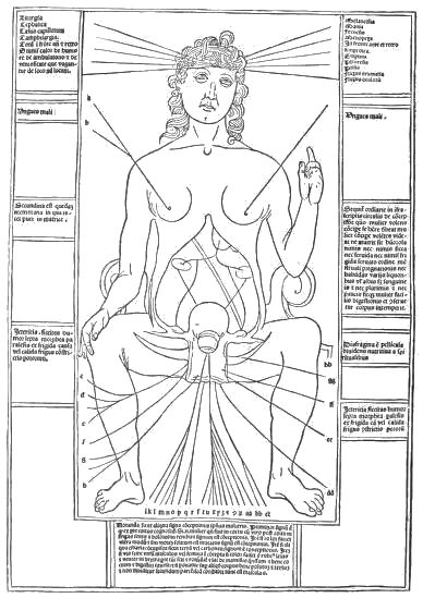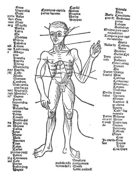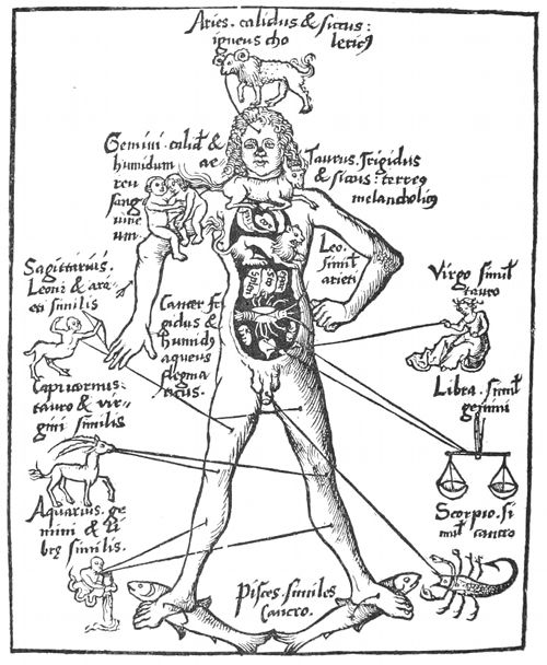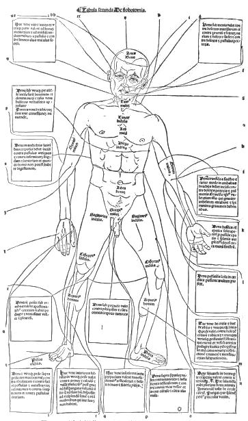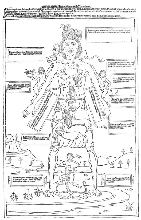 The following images are all taken from Tradition und Naturbeobachtung in den Illustrationen Medizinischer Handschriften und Frühdrucke vornehmlich des 15. Jahrhunderts (1907) by Karl Sudhoff - a book on the topic of medical illustrations in manuscripts and early printed books (primarily) of the 15th century. Included amongst the depictions are a few of the Zodiac Man (or homo signorum), a common figure in late medieval depictions of the body who had every part of his body linked with an astrological sign. See the book to learn from where each image has been sourced by Sudhoff, and if you speak German, to learn more about them.