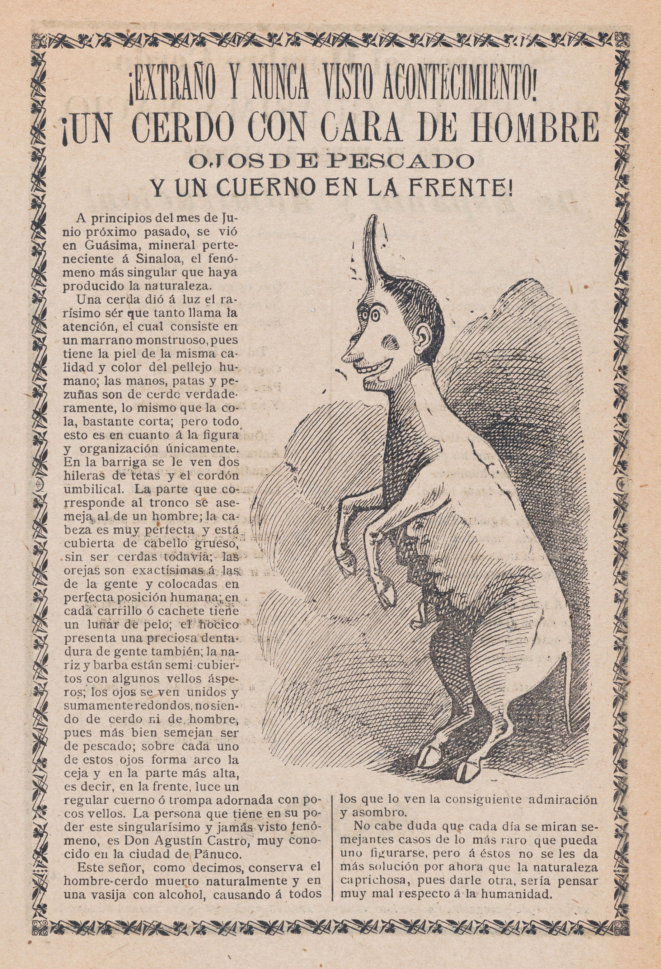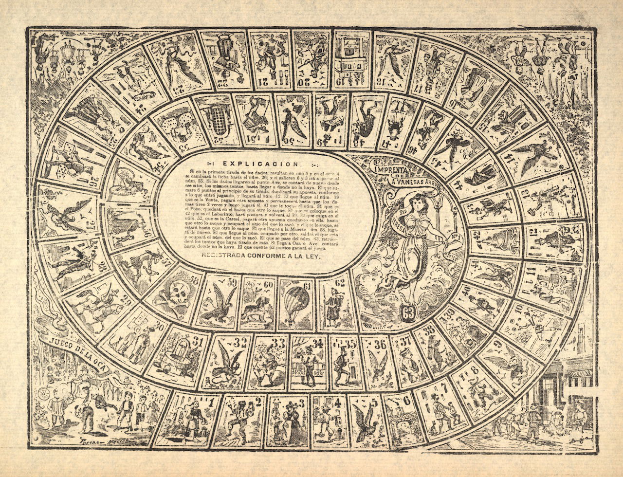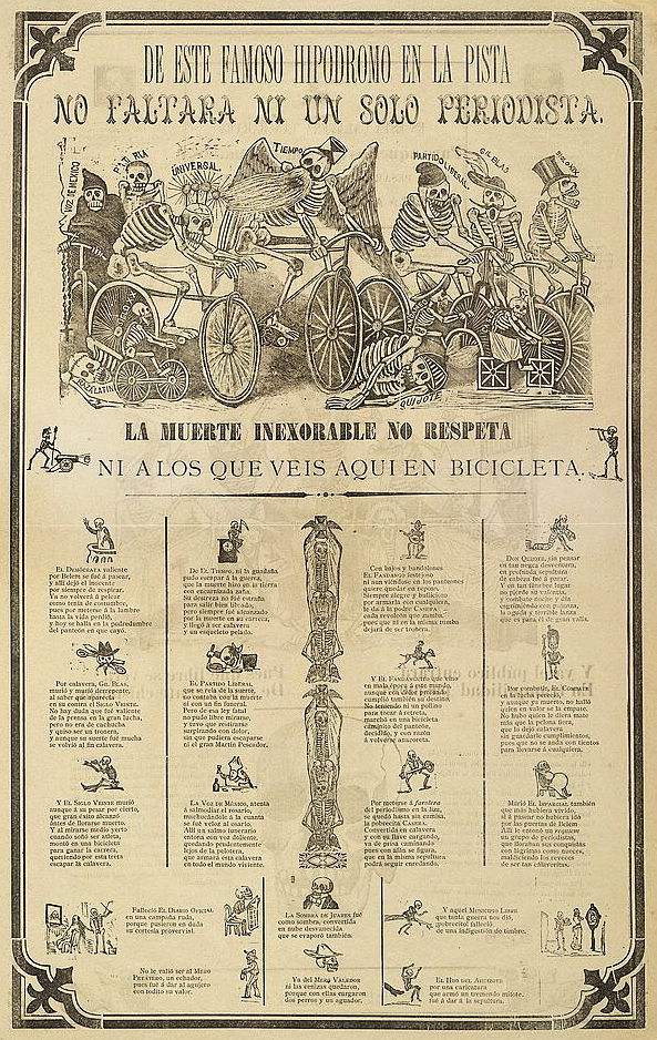 “From this famous hippodrome on the racetrack, not even a single journalist is missing. Death is inexorable and doesn't even respect those that you see here on bicycle” - broadside showing showing calaveras bicycling, with identifying labels, 'Voz de México,' 'Patria,' 'Universal,' 'Tiempo,' 'Partido Liberal,' 'Gil Blas,' names of popular newspapers, and 'Siglo XIX,' and 'Siglo XX.' They trample additional calaveras, labeled 'Razalatin' and 'Quijote.' (ca.1898-1902) -