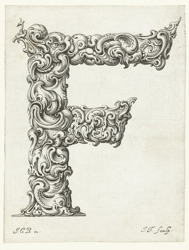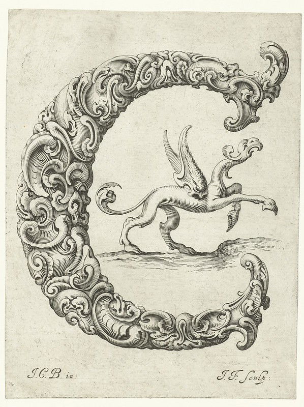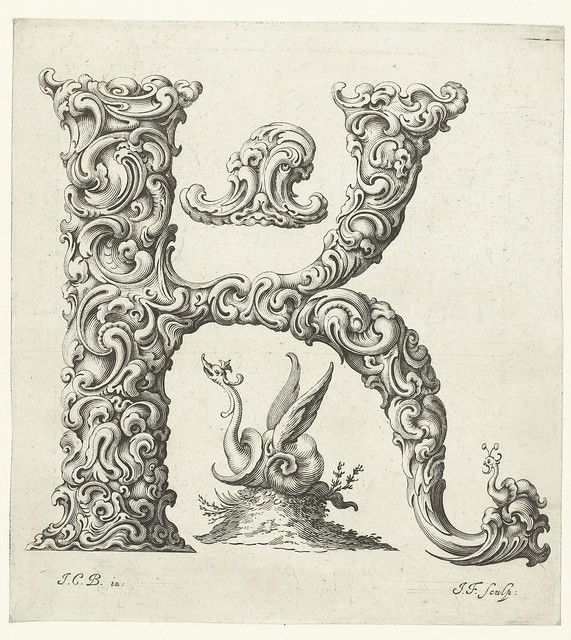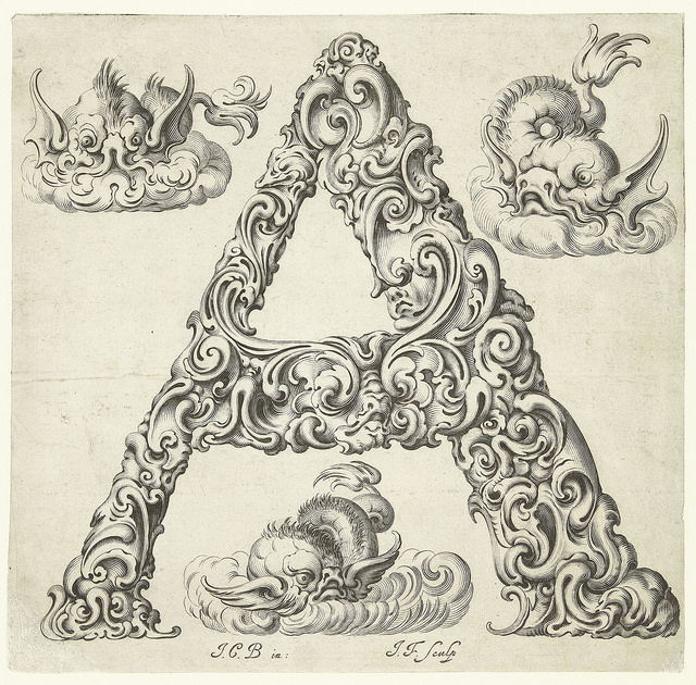 A series of stunning prints - titled Libellus Novus Elementorum Latinorum - designed by the Polish goldsmith Jan Christian Bierpfaff (1600-ca.1690) and engraved by fellow-countryman Jeremias Falck (1610–1677). According to BibliOdyssey blog, where we first learnt of the images, Bierpfaff worked as an apprentice at the Mackensen family of metalworkers in Cracow, a group "who introduced the Dutch auricular ('shell or ear-like') style of ornament into the Polish gold and silver workshops". We see the influence of this auricular style in Bierpfaff's letterforms but also the unmistakable baroque stylings of the grotesque. The result is wonderfully surreal, the writhing forms hovering somewhere between the monstrous and floral.