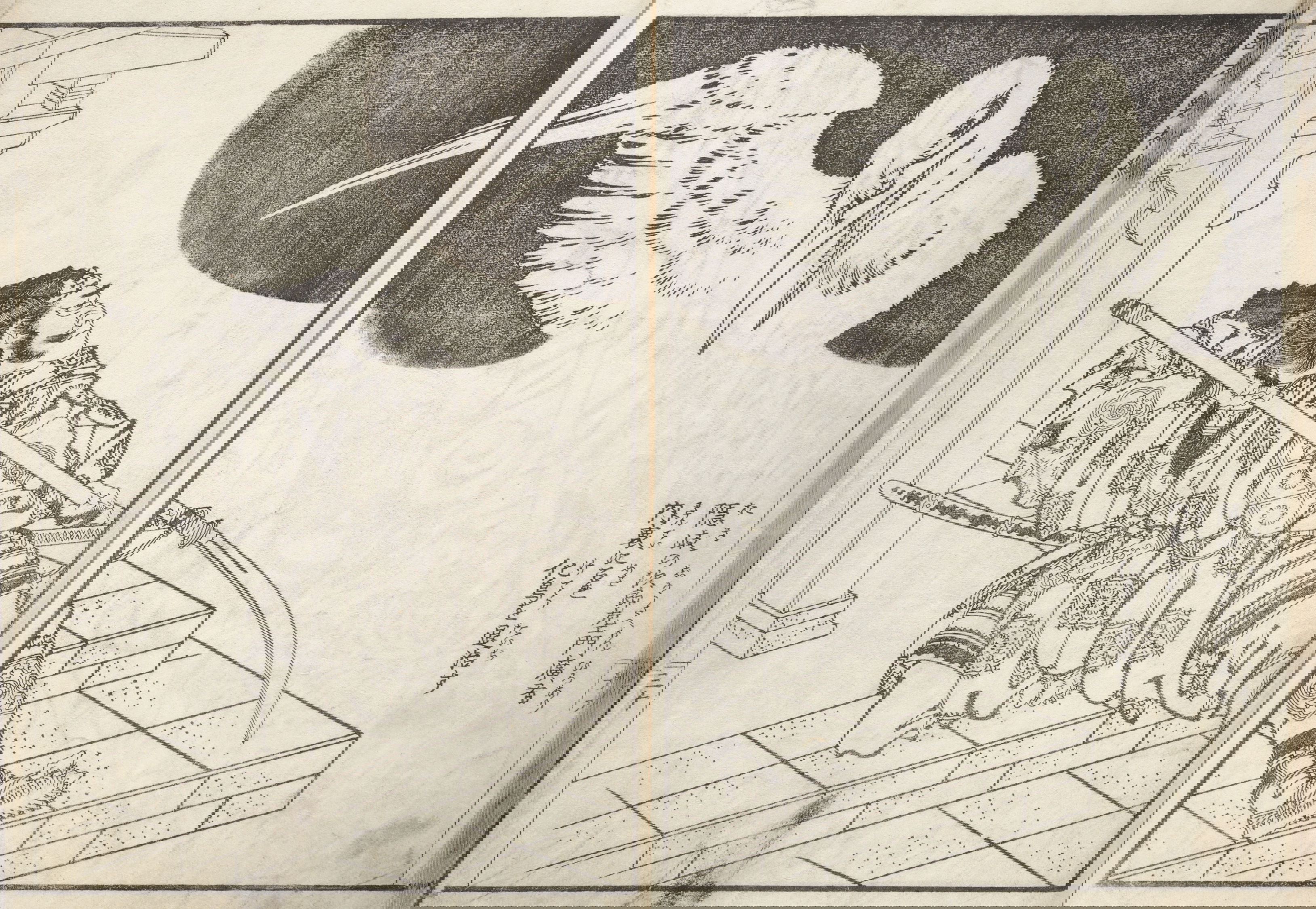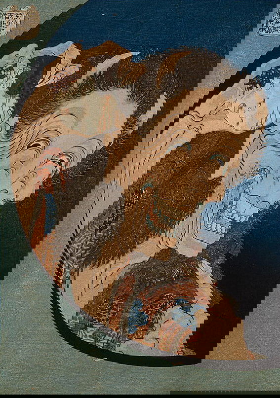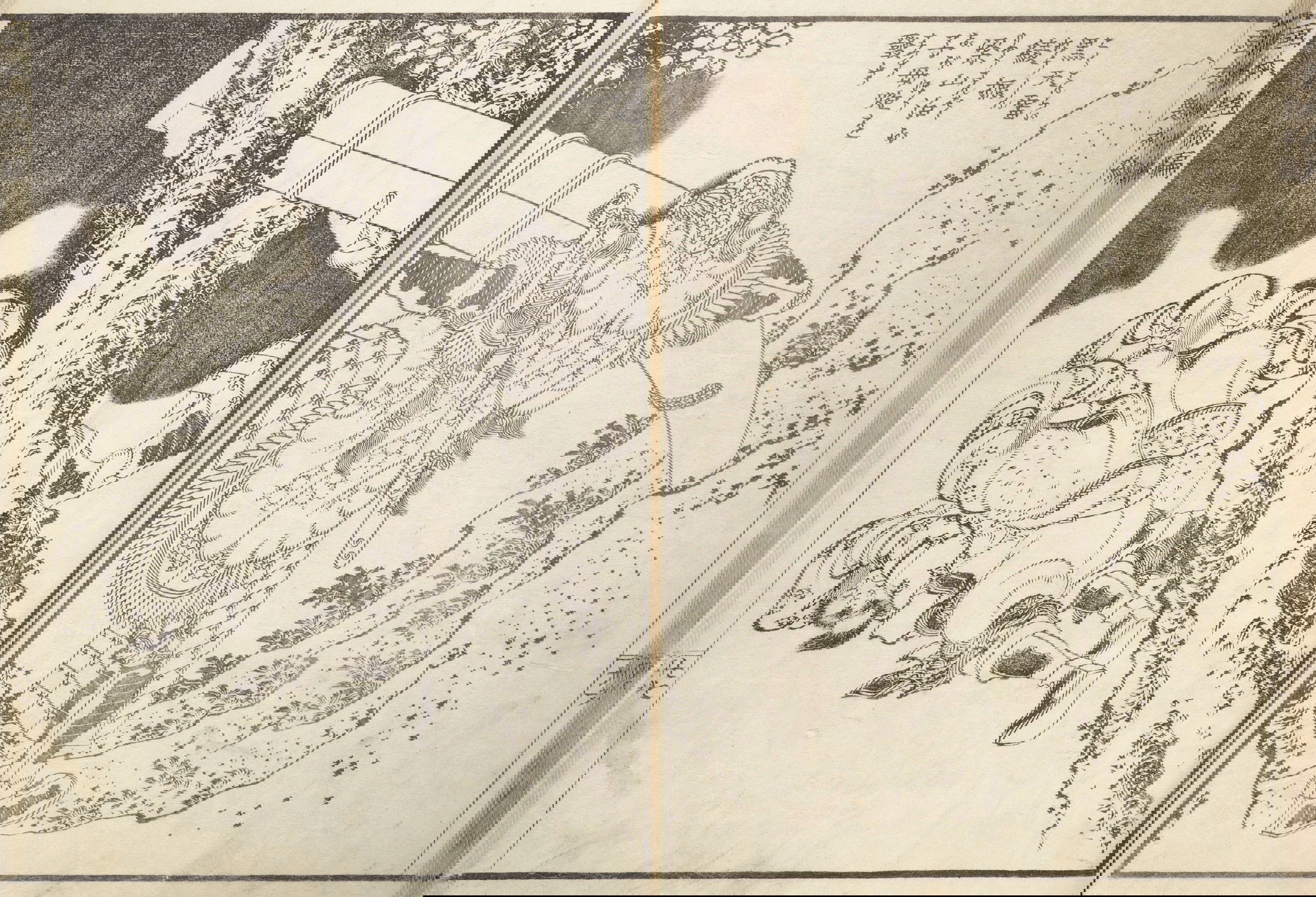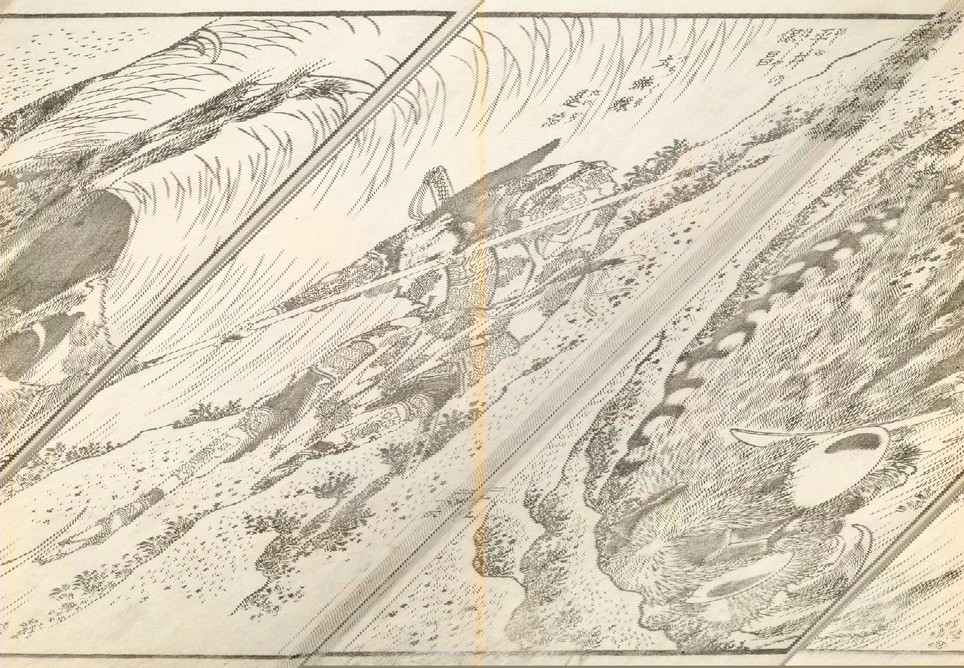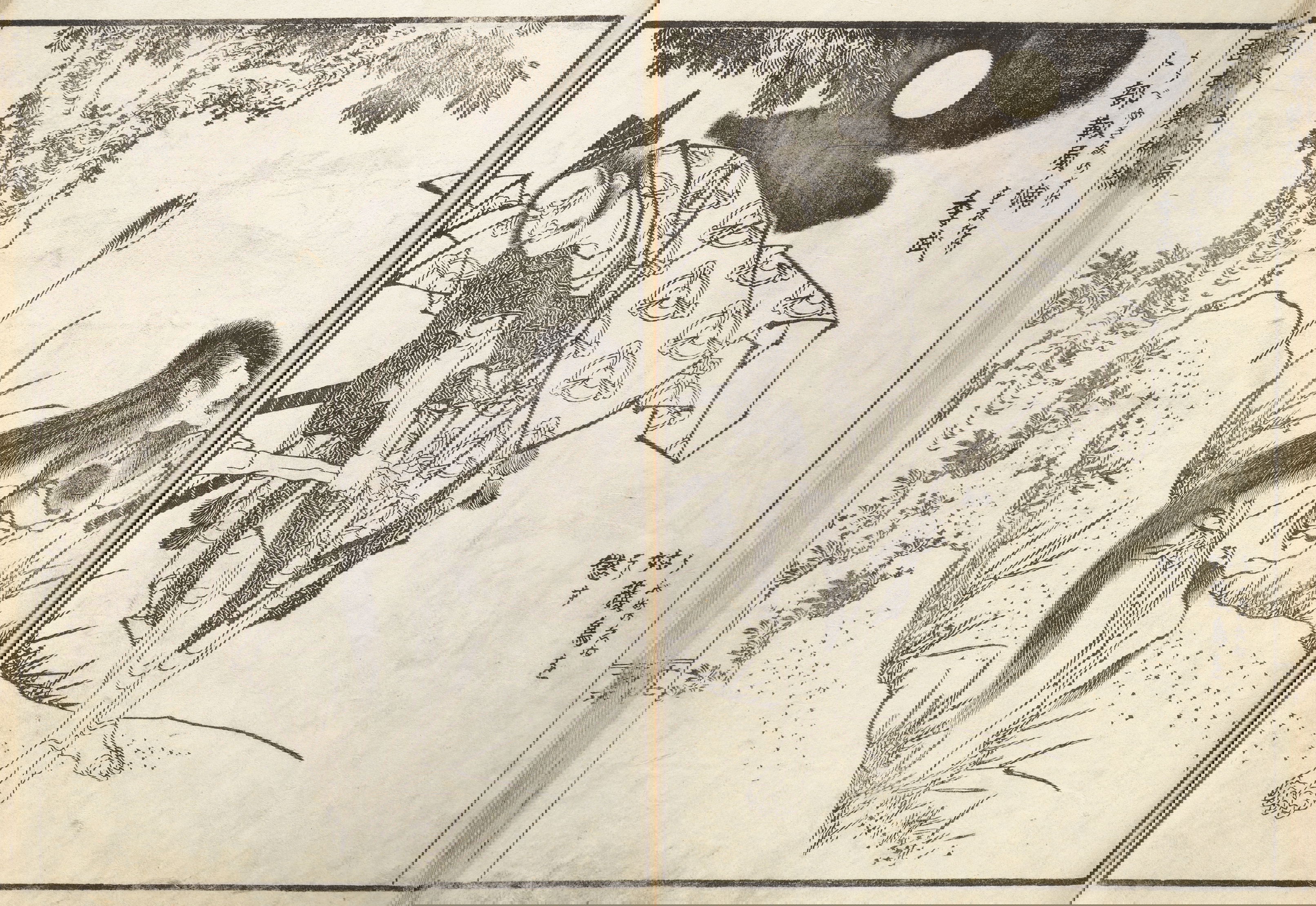 One year after this statement, seventy-six-year-old Hokusai drew a series of warrior images that included the figures above: Hirai Yasumasa (958–1036) subduing a monster spider, Tsuchigumo. Lines in the background trace the motion of the gigantic arachnid as it tumbles and its sickle-like legs flail in the air, emphasizing the movement and force in a way that resonates with the visual effects of modern manga. This image is dynamic; and yet it gives the impression of a perfectly paused still-frame — the monster’s eyes meeting our own — as the moment is immortalized.