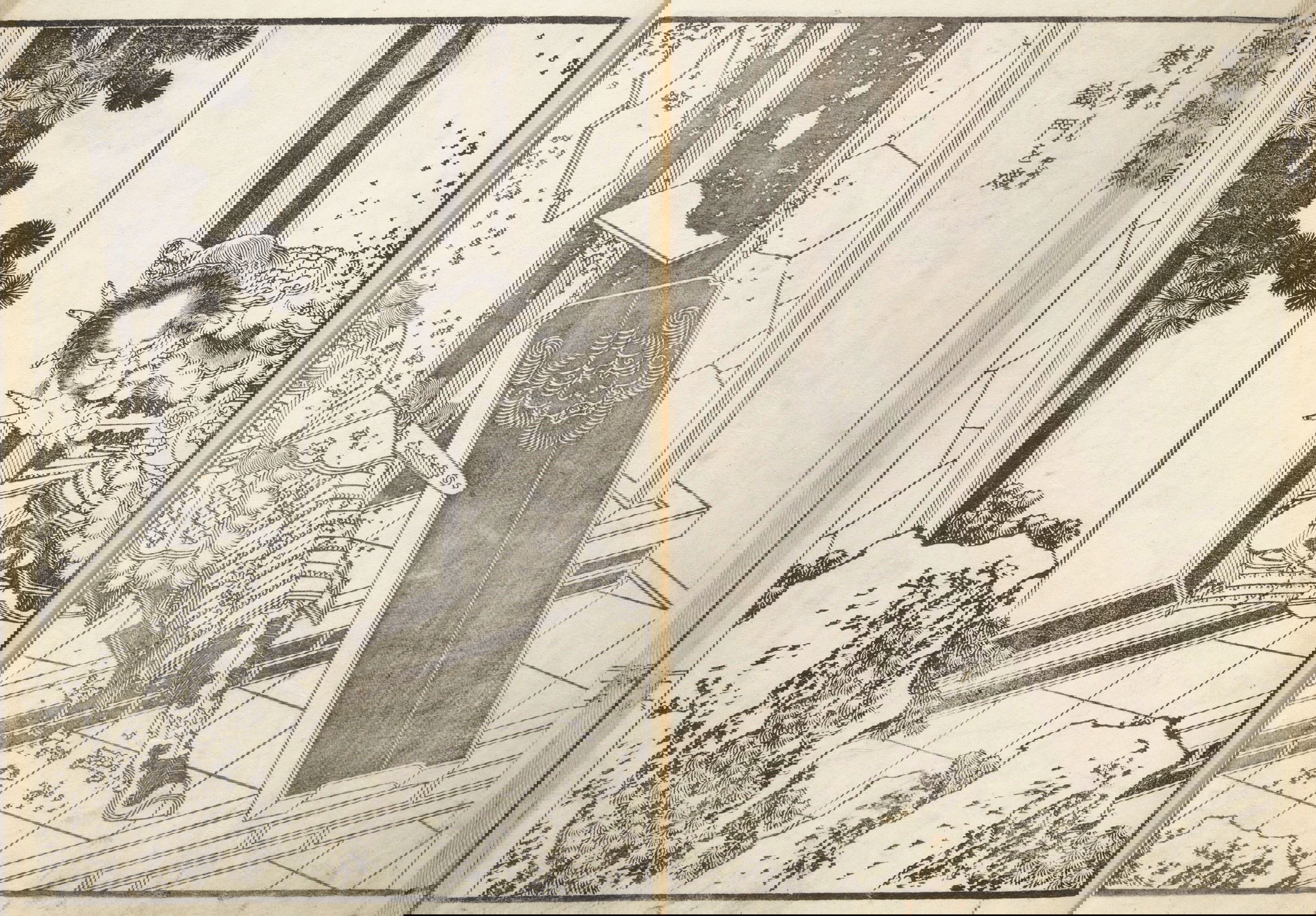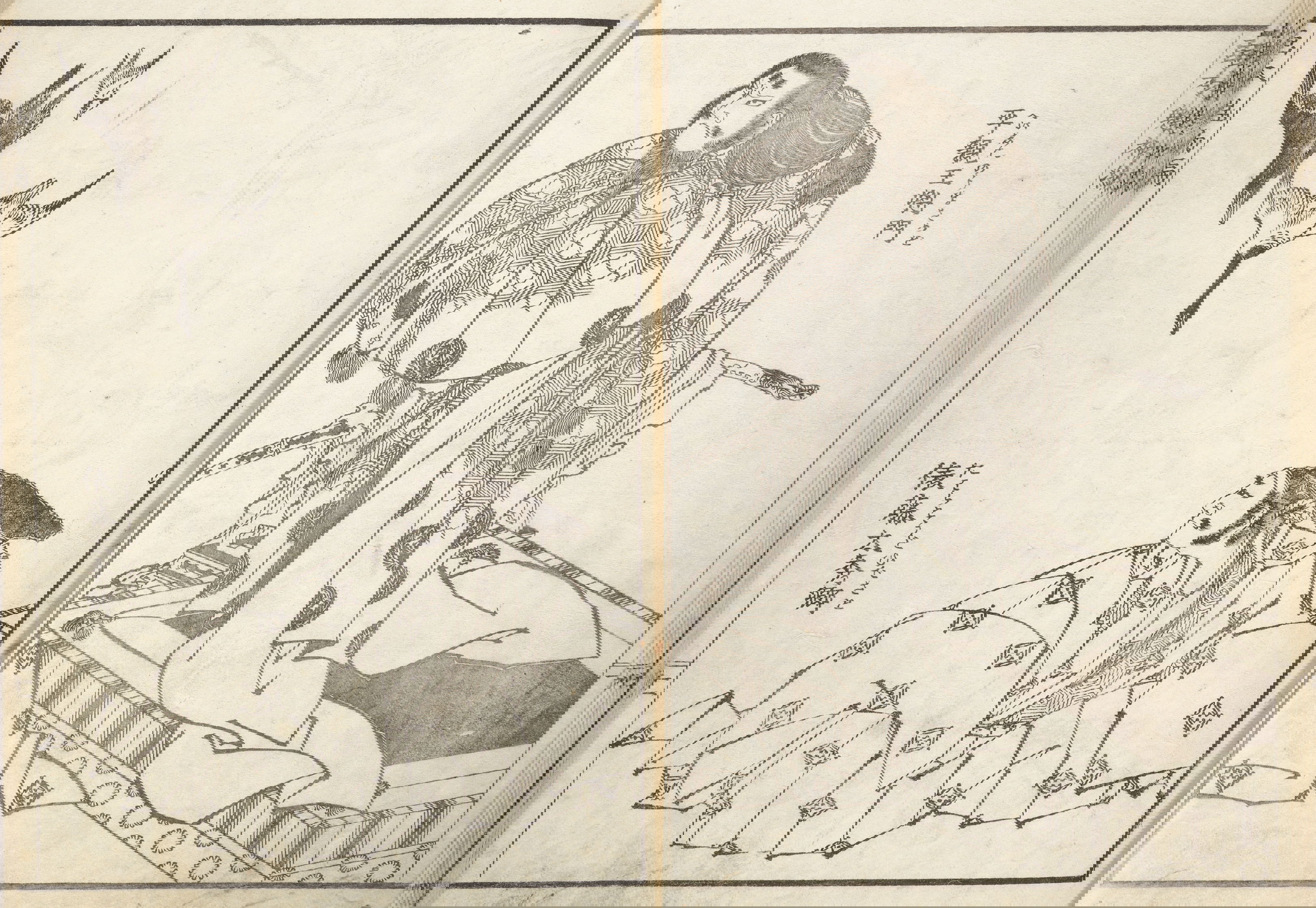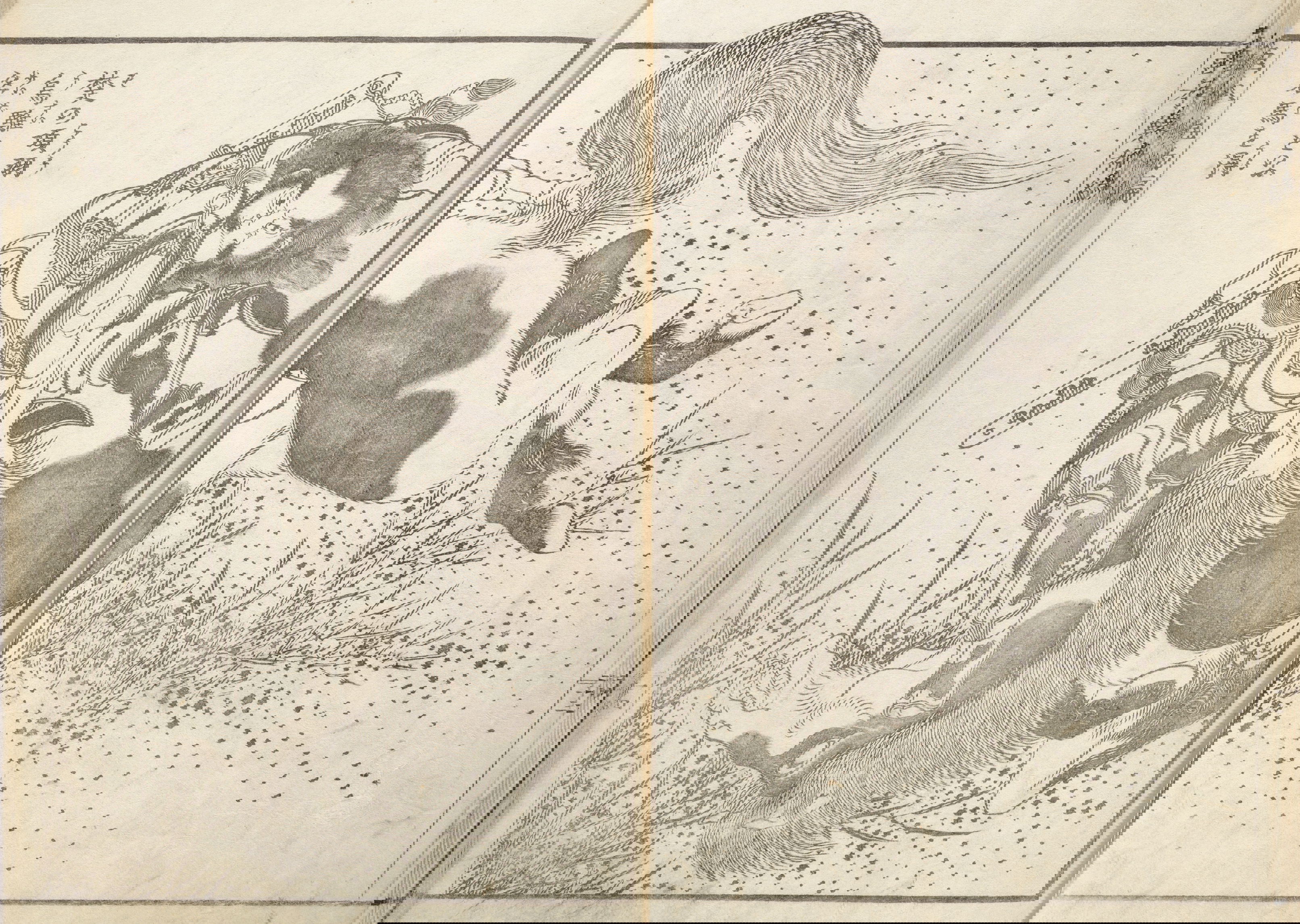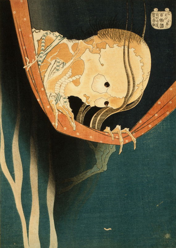 One year after this statement, seventy-six-year-old Hokusai drew a series of warrior images that included the figures above: Hirai Yasumasa (958–1036) subduing a monster spider, Tsuchigumo. Lines in the background trace the motion of the gigantic arachnid as it tumbles and its sickle-like legs flail in the air, emphasizing the movement and force in a way that resonates with the visual effects of modern manga. This image is dynamic; and yet it gives the impression of a perfectly paused still-frame — the monster’s eyes meeting our own — as the moment is immortalized.