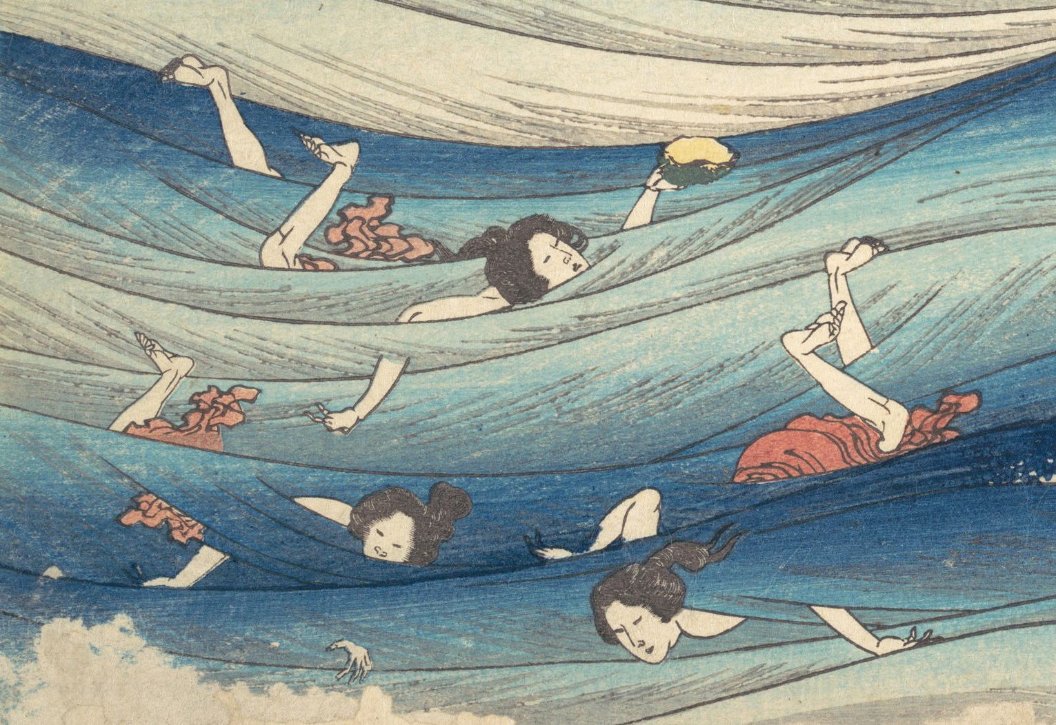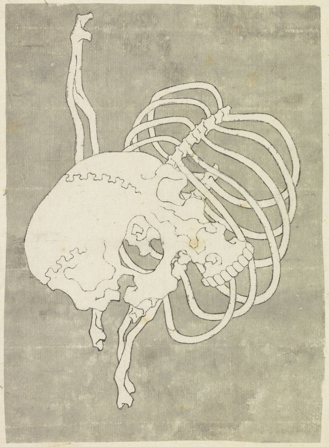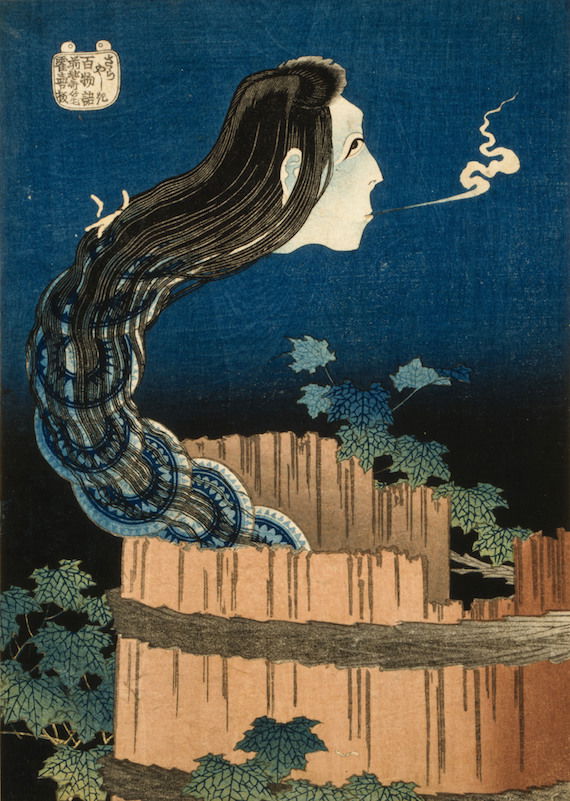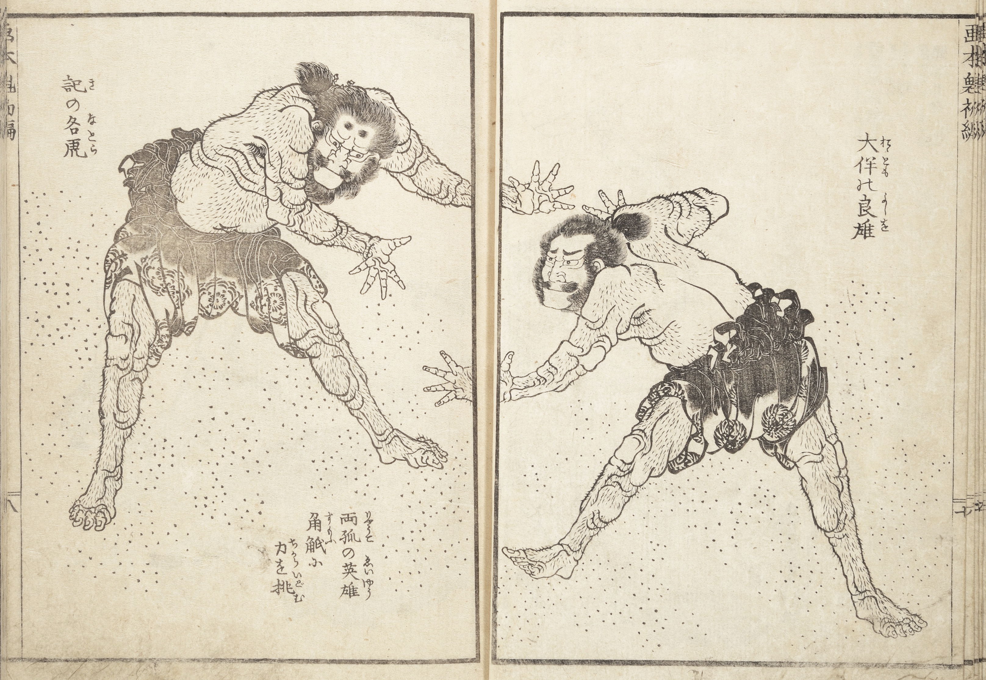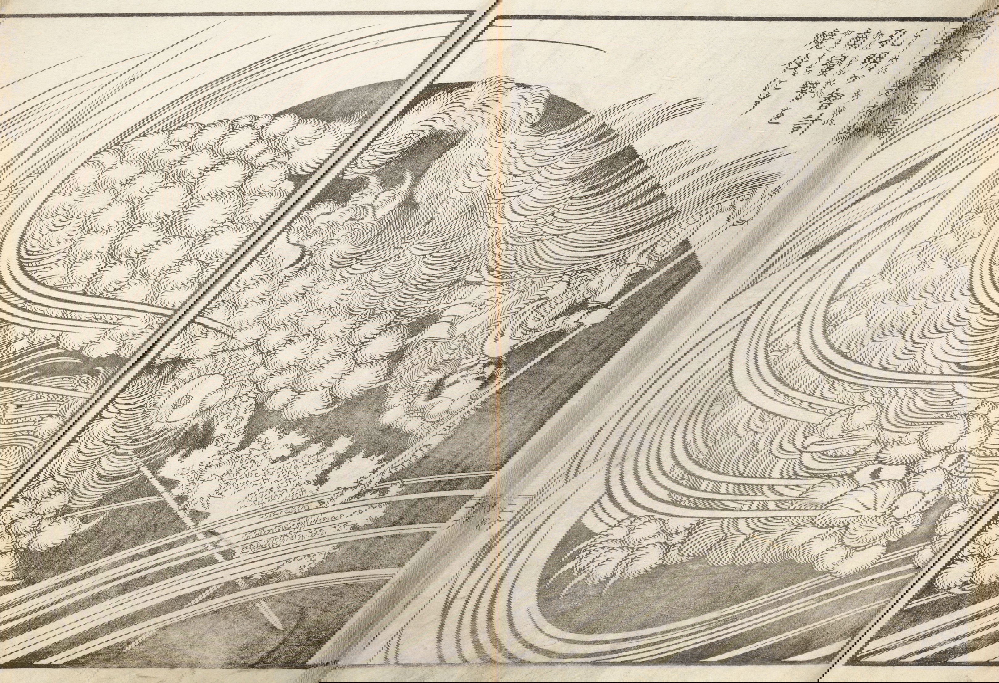 One year after this statement, seventy-six-year-old Hokusai drew a series of warrior images that included the figures above: Hirai Yasumasa (958–1036) subduing a monster spider, Tsuchigumo. Lines in the background trace the motion of the gigantic arachnid as it tumbles and its sickle-like legs flail in the air, emphasizing the movement and force in a way that resonates with the visual effects of modern manga. This image is dynamic; and yet it gives the impression of a perfectly paused still-frame — the monster’s eyes meeting our own — as the moment is immortalized.