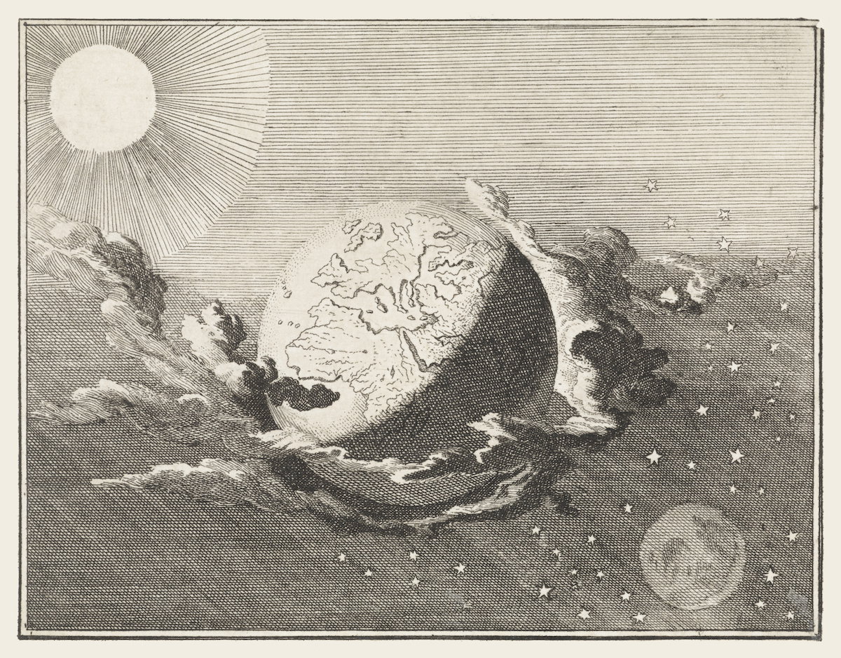 18th-century Dutch engraving of Earth from outerspace. This work originally appeared in a volume of scriptural history, perhaps illustrating the Creation scene.