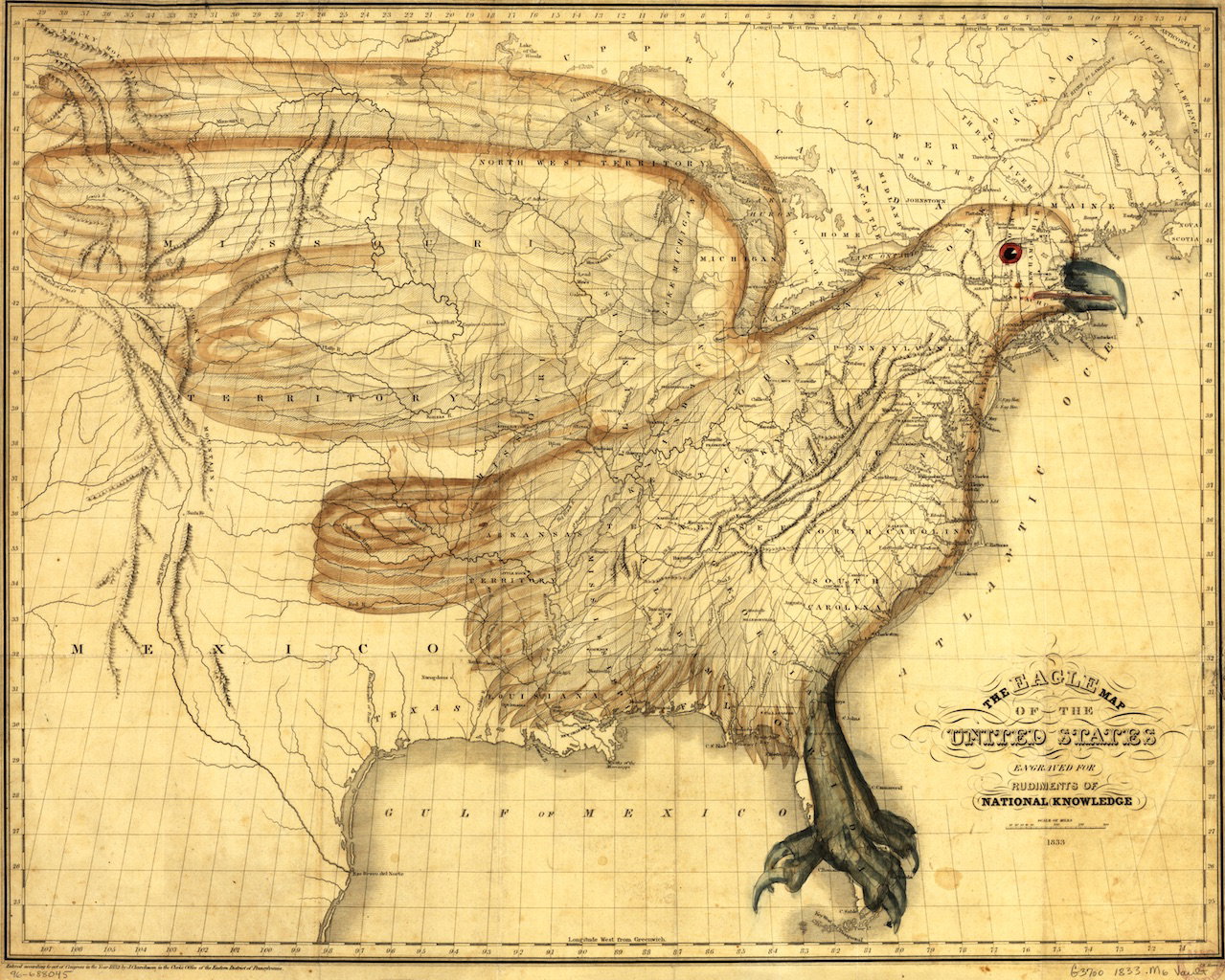 Rare and expertly executed map representing the United States (or at least the Eastern half) as an eagle, prepared by Joseph Churchman for his Rudiments of National Knowledge (1833). In the book Churchman expands on the idea of the country as an eagle, including an apology to the people of the state of Maine (who are not included in the bounds of the eagle's body), though he insists that the state rather forms the eagle's "liberty cap".
