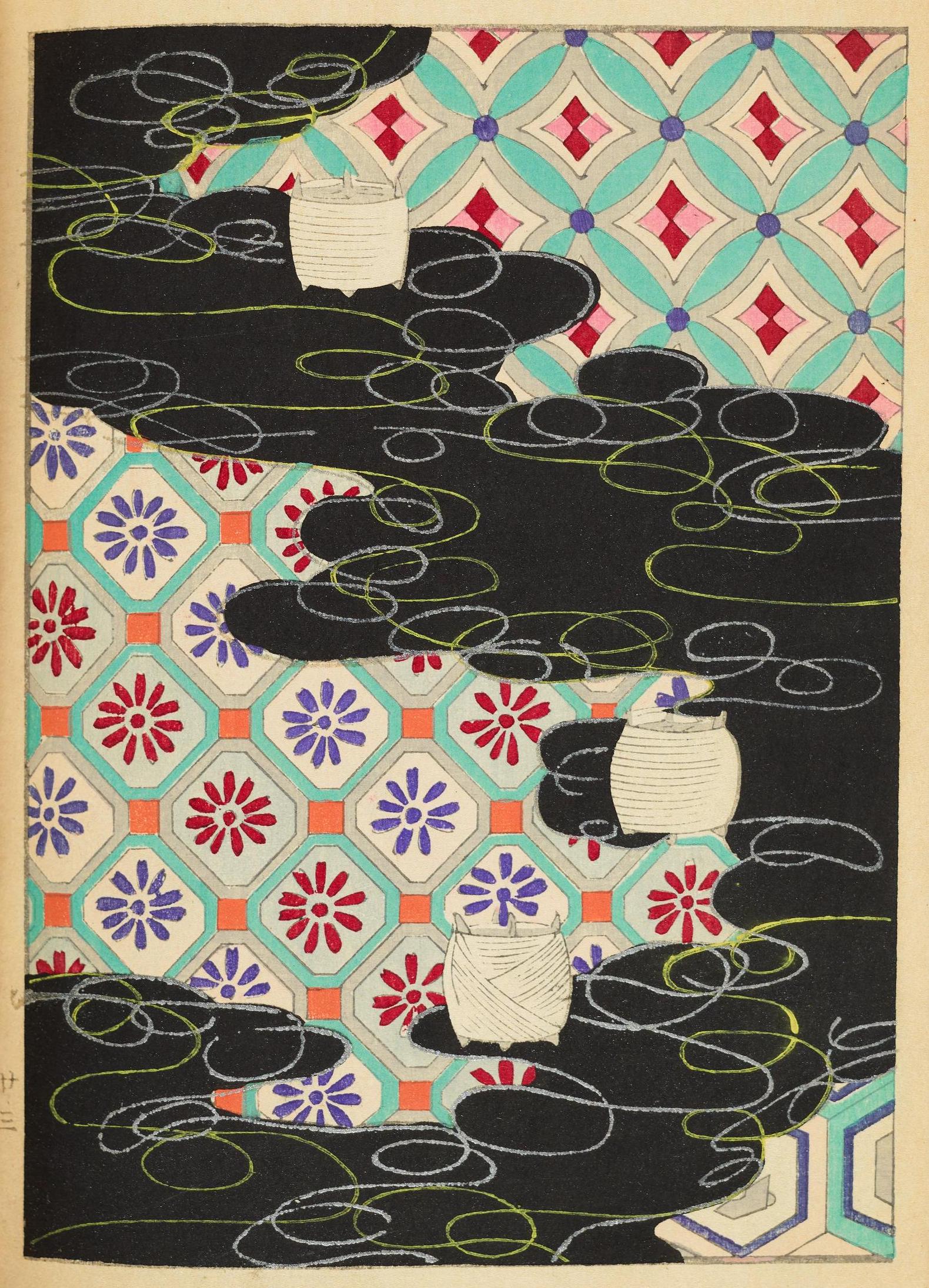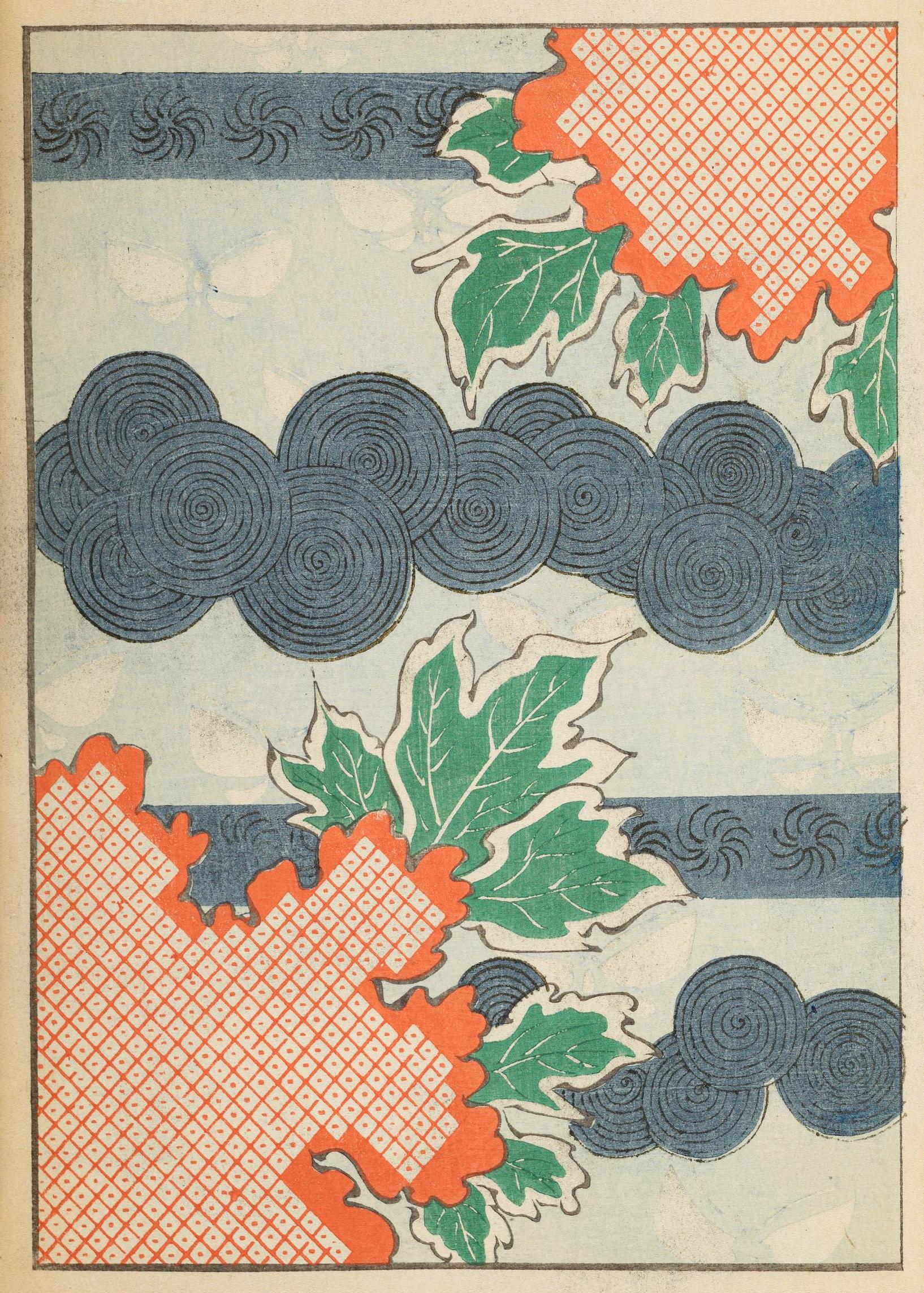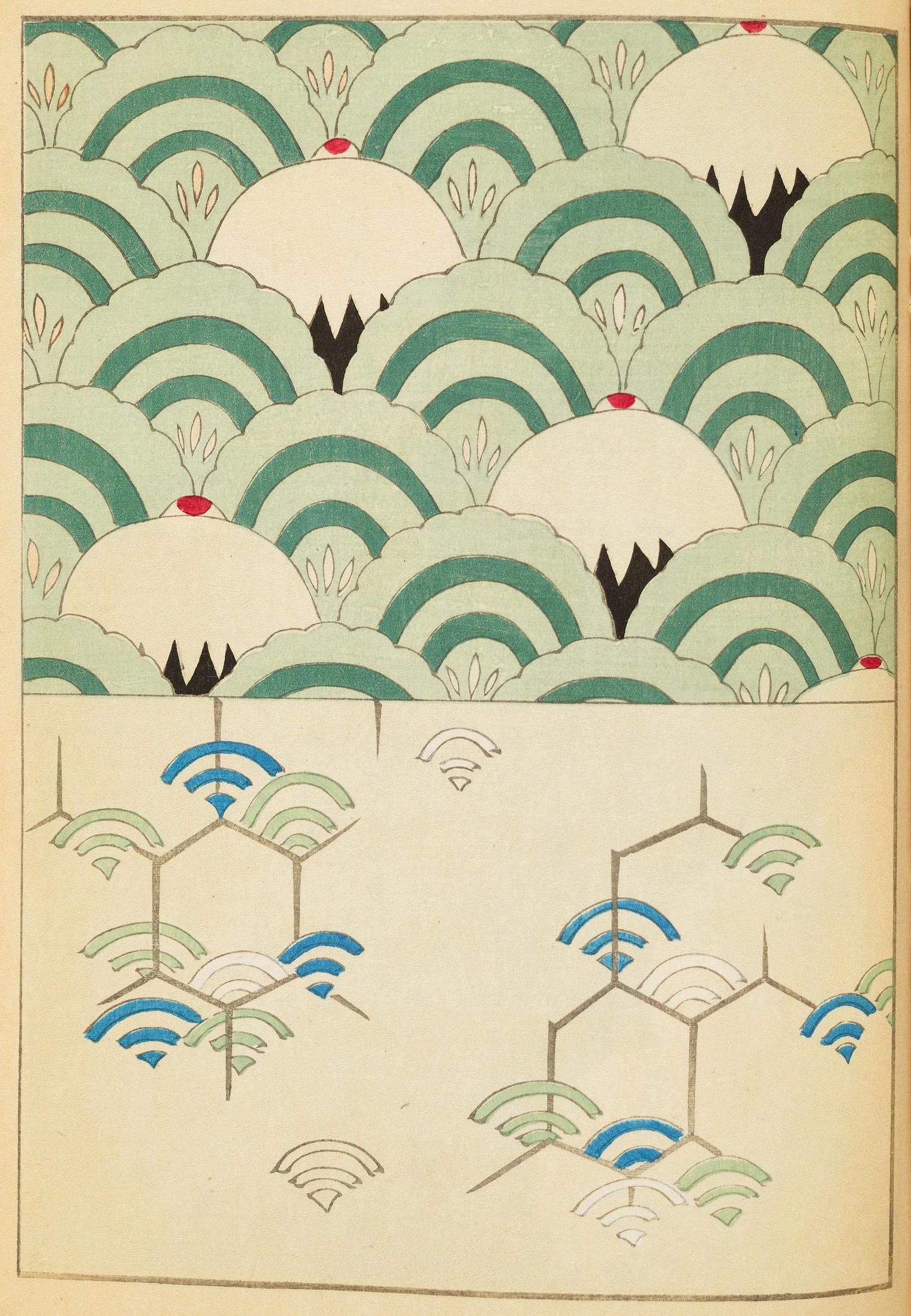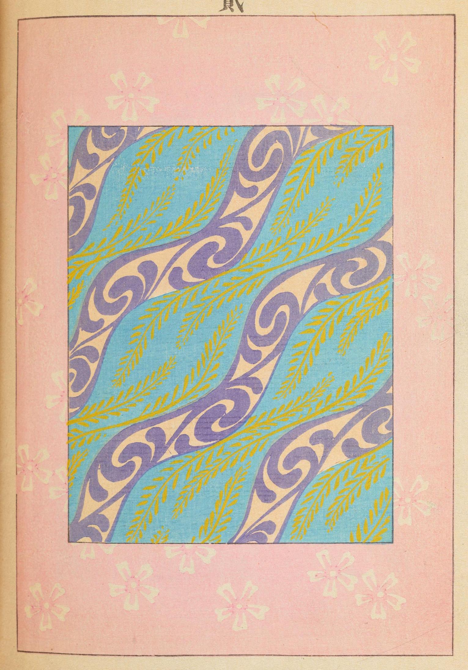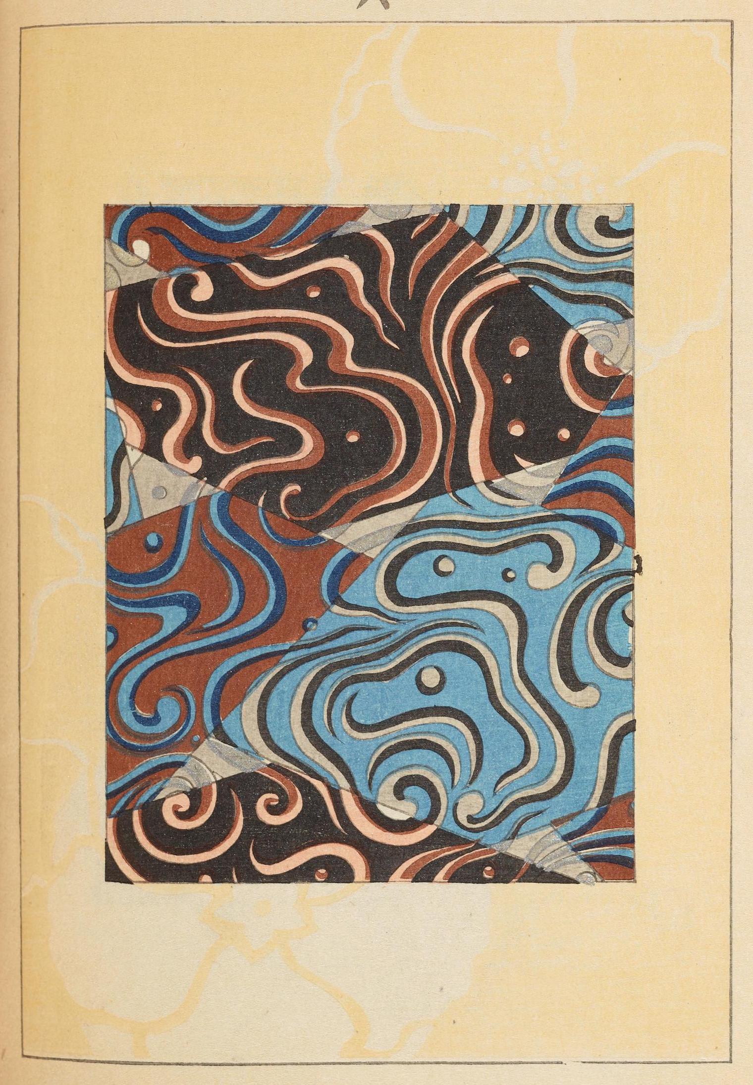 Shin-Bijutsukai (New Oceans of Art) magazine appeared during a watershed in Japanese publishing history: when pattern and design books became standalone works of art. The first Japanese pattern books — colorless woodblock manuals, known as hinagata-bon (雛形本) — were created in the 1660s, when political stability and a bullish economy fostered an expansion in fashion and a desire for voguish textiles. While growing out of this genre, the colorful and abstract designs in Shin-Bijutsukai magazine (1902–1906) reflect a convergence of historical and technological shifts in turn-of-the-century Japanese society. Notably, artists traveling abroad on government grants encountered Art Nouveau and Japonisme — the Western European fondness for a mediated, Japanese aesthetic — which they, in turn, folded back into domestic patterns: forging originality through the prism…