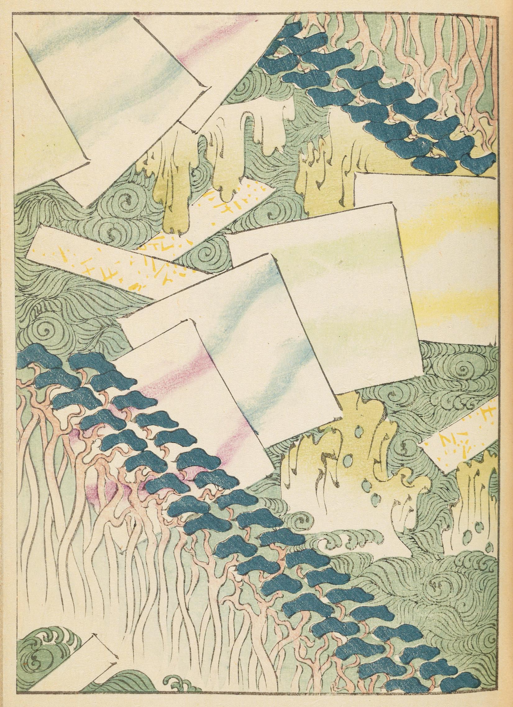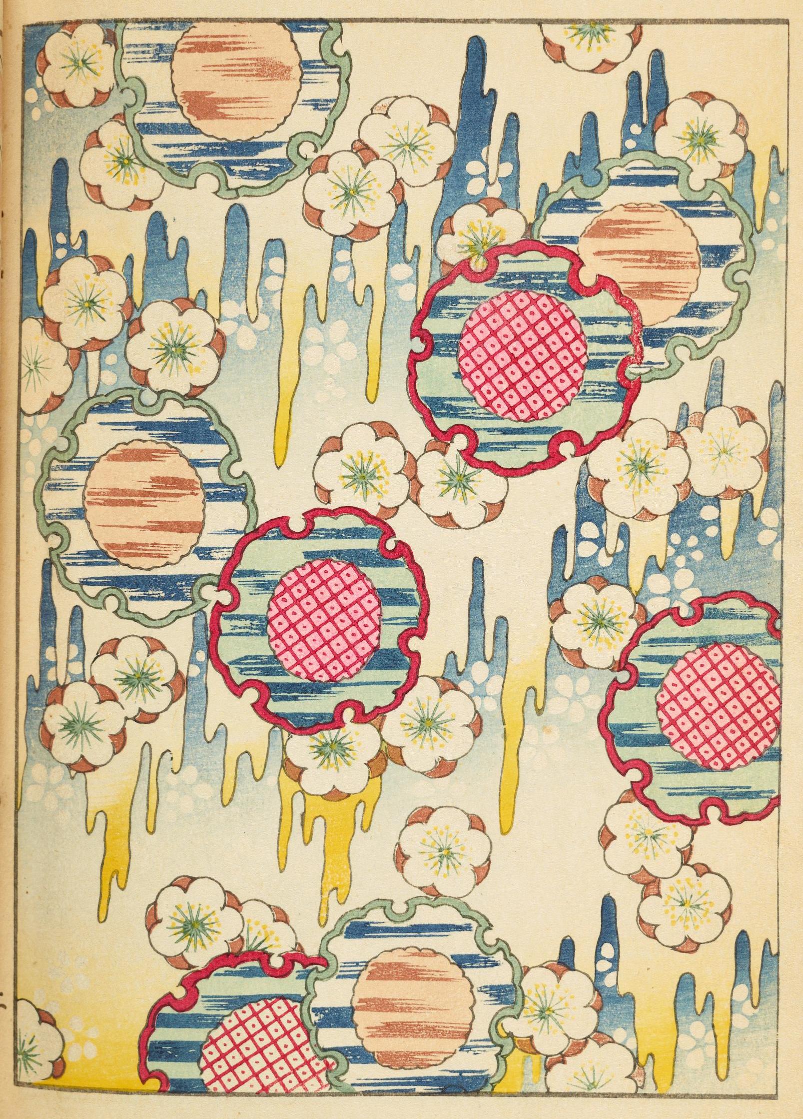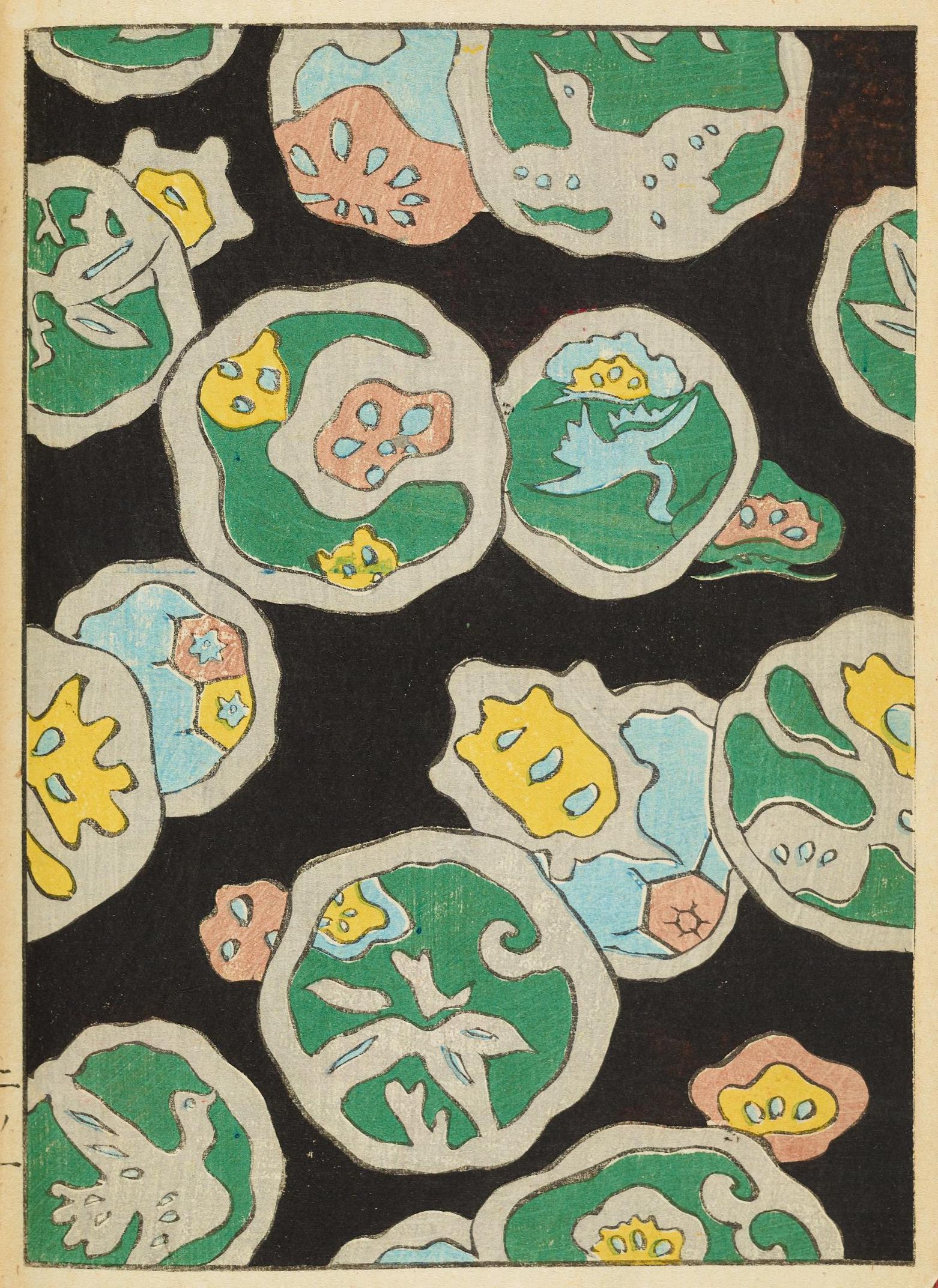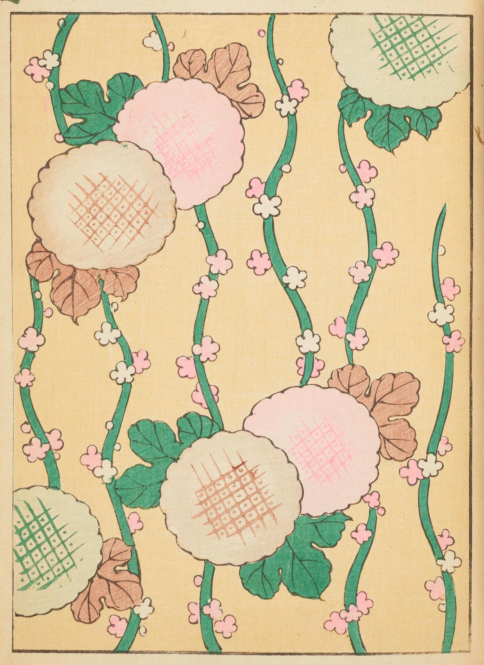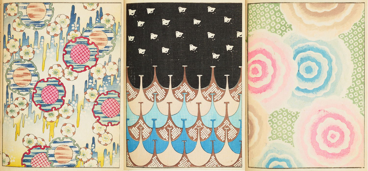 Shin-Bijutsukai (New Oceans of Art) magazine appeared during a watershed in Japanese publishing history: when pattern and design books became standalone works of art. The first Japanese pattern books — colorless woodblock manuals, known as hinagata-bon (雛形本) — were created in the 1660s, when political stability and a bullish economy fostered an expansion in fashion and a desire for voguish textiles. While growing out of this genre, the colorful and abstract designs in Shin-Bijutsukai magazine (1902–1906) reflect a convergence of historical and technological shifts in turn-of-the-century Japanese society. Notably, artists traveling abroad on government grants encountered Art Nouveau and Japonisme — the Western European fondness for a mediated, Japanese aesthetic — which they, in turn, folded back into domestic patterns: forging originality through the prism…