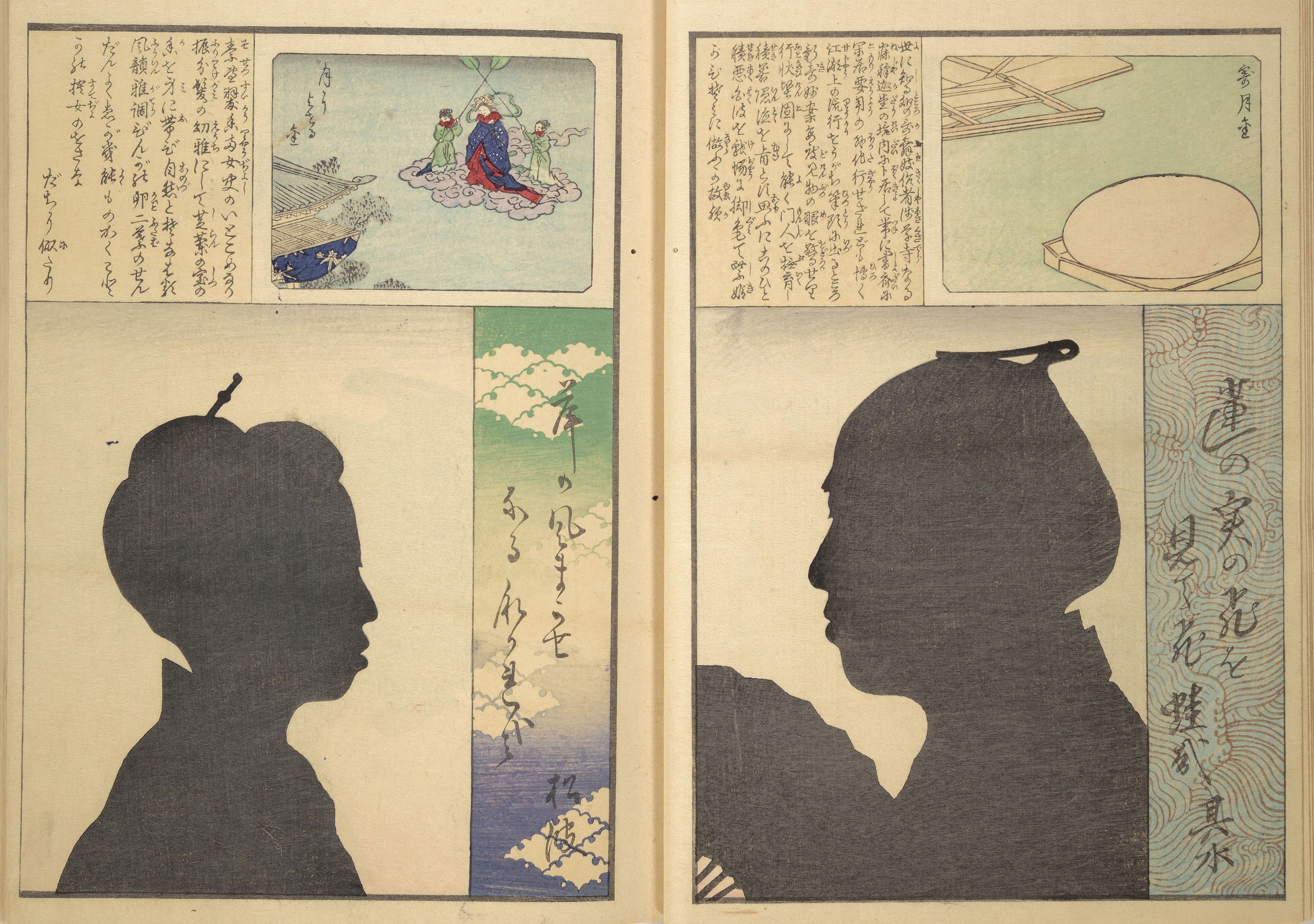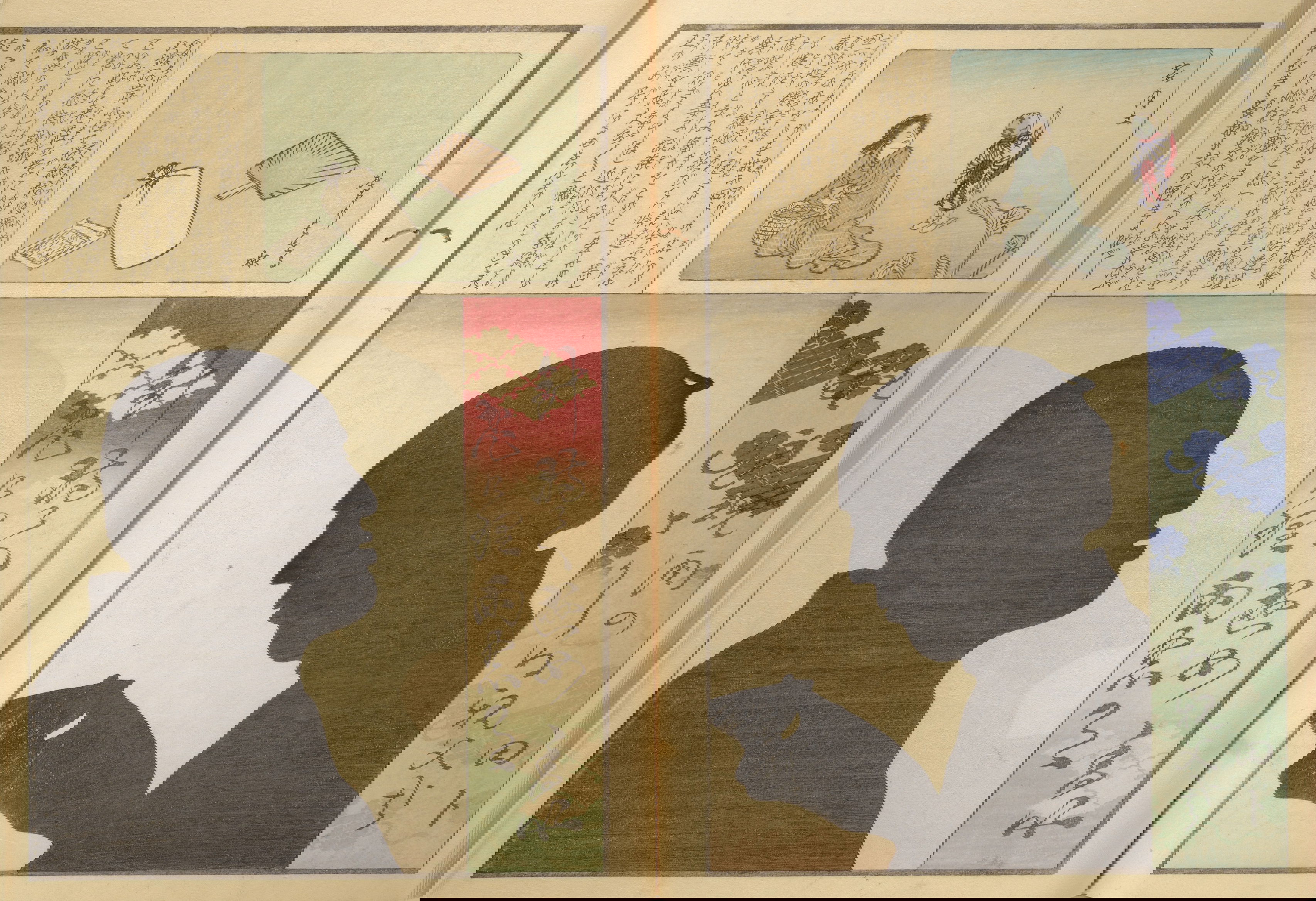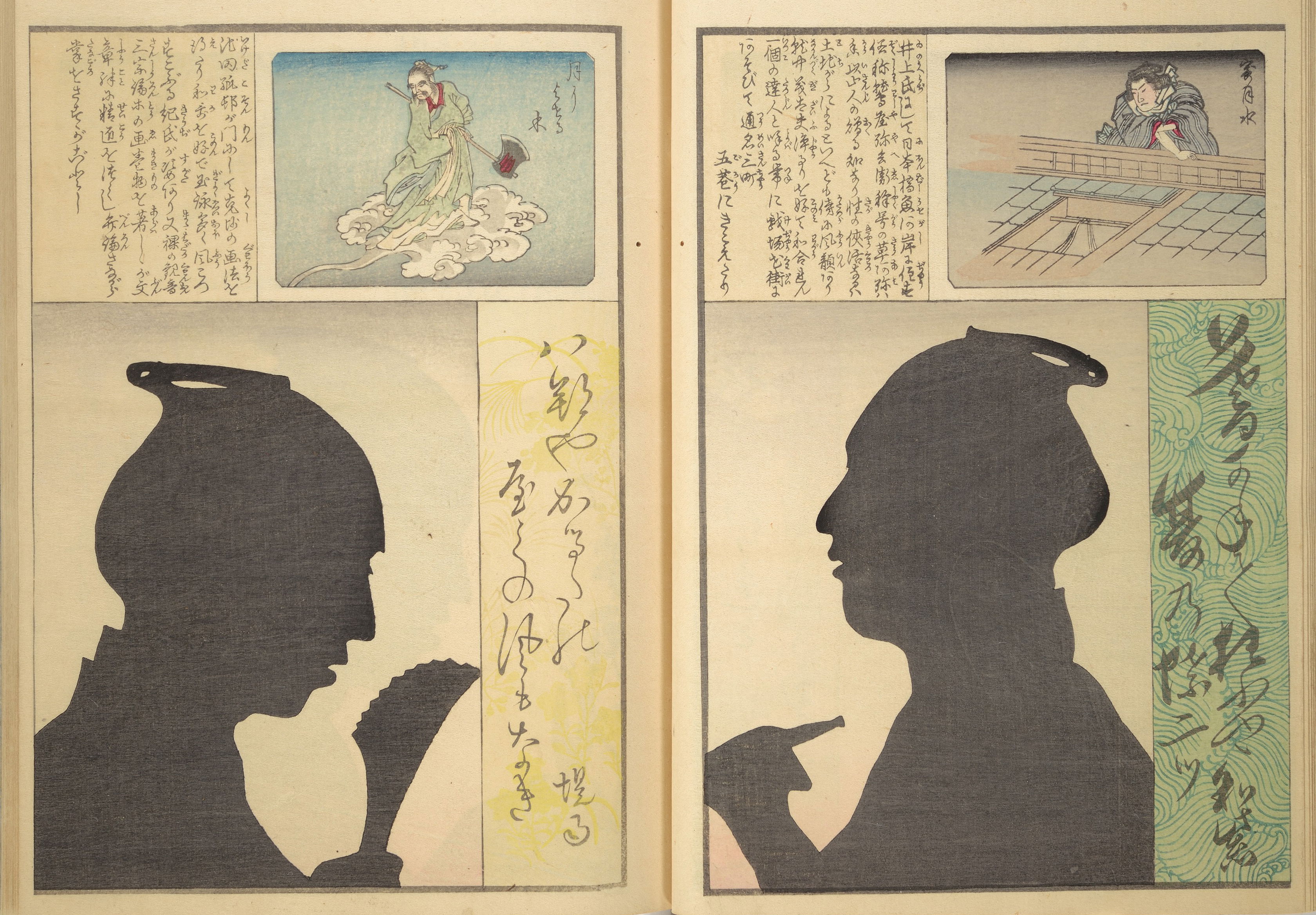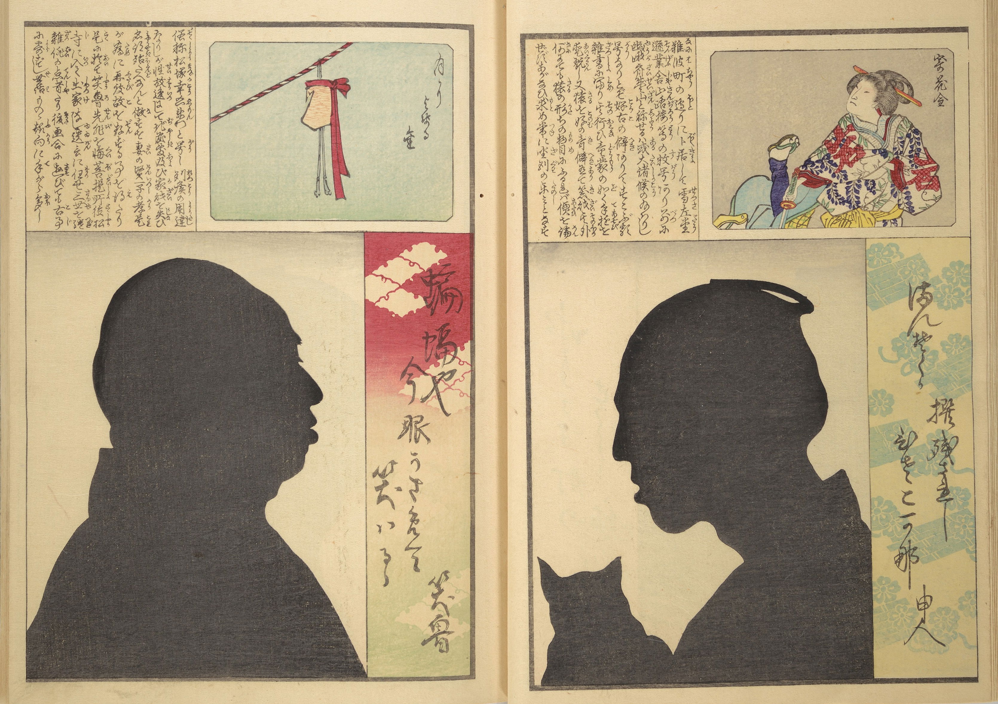 Silhouette portraits came into fashion in late-nineteenth-century Japan following their popularity in Europe and the United States. They were a form of party entertainment. Partygoers would take turns sitting behind a paper sliding door (shōji) while an entertainer captured their backlit silhouettes. A simple leisure activity soon gave way to more complex publications and commemorations. Clear Shadows (Kumanaki kage, 1867), for instance, is a compilation of silhouette portraits depicting members of the kyōga-awase club by the artist Ochiai Yoshiiku (1833–1904), which includes short biographies, picture riddles, and poems. Kyōga-awase (picture-matching for amusement) was played somewhat like Pictionary, where each person was given a subject to illustrate — and could draw anything but the subject itself. Points were awarded on the basis of cleverness.