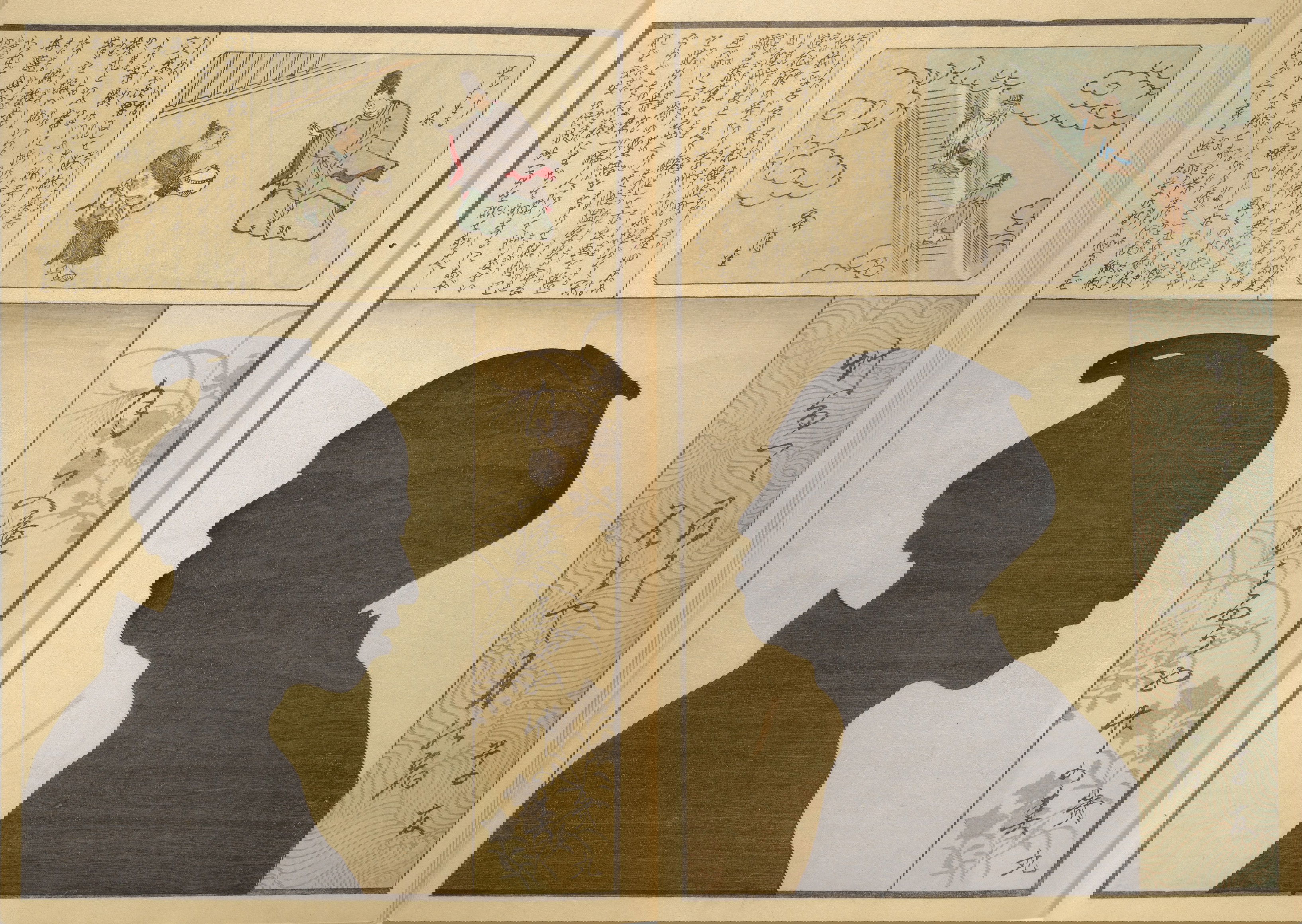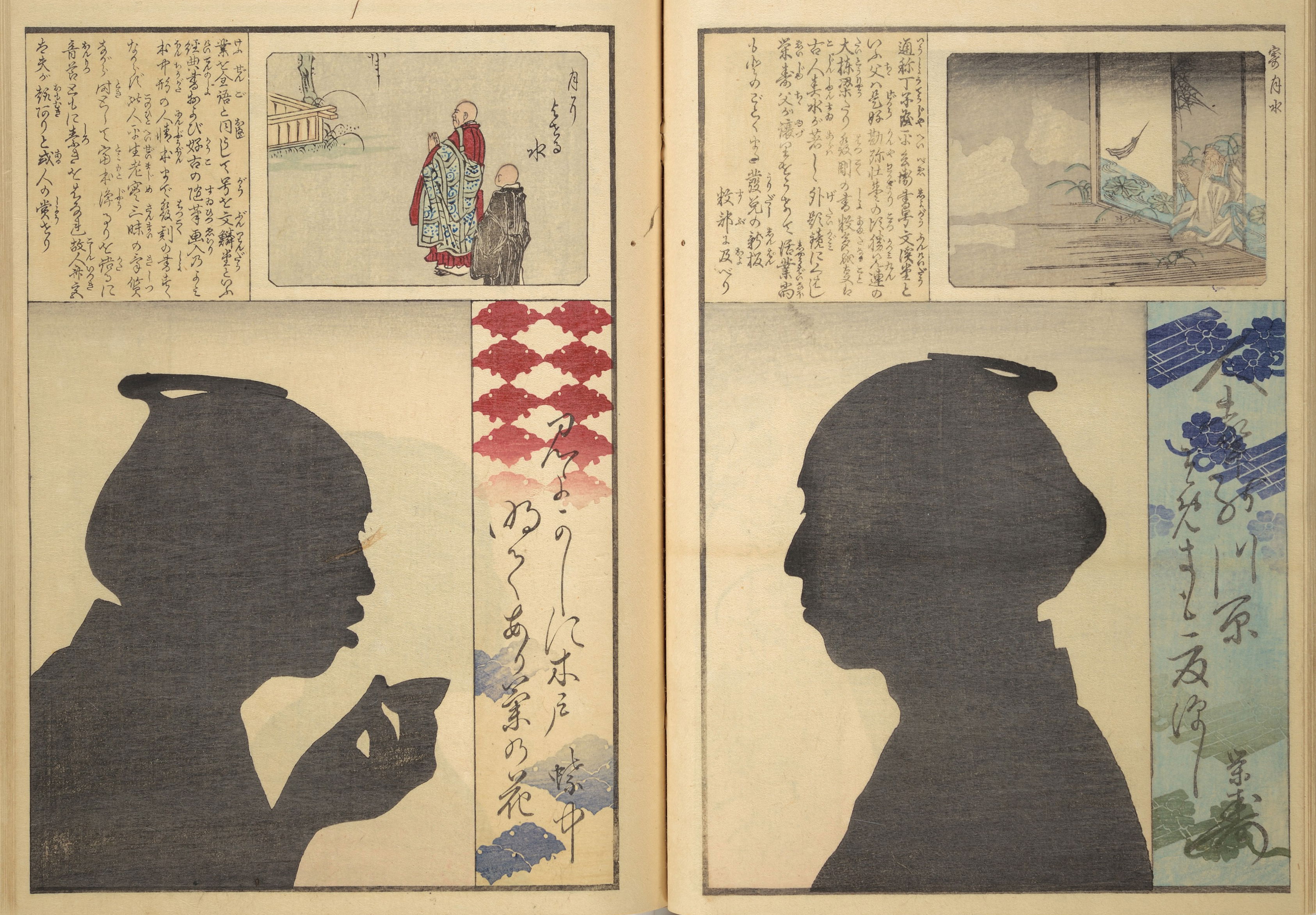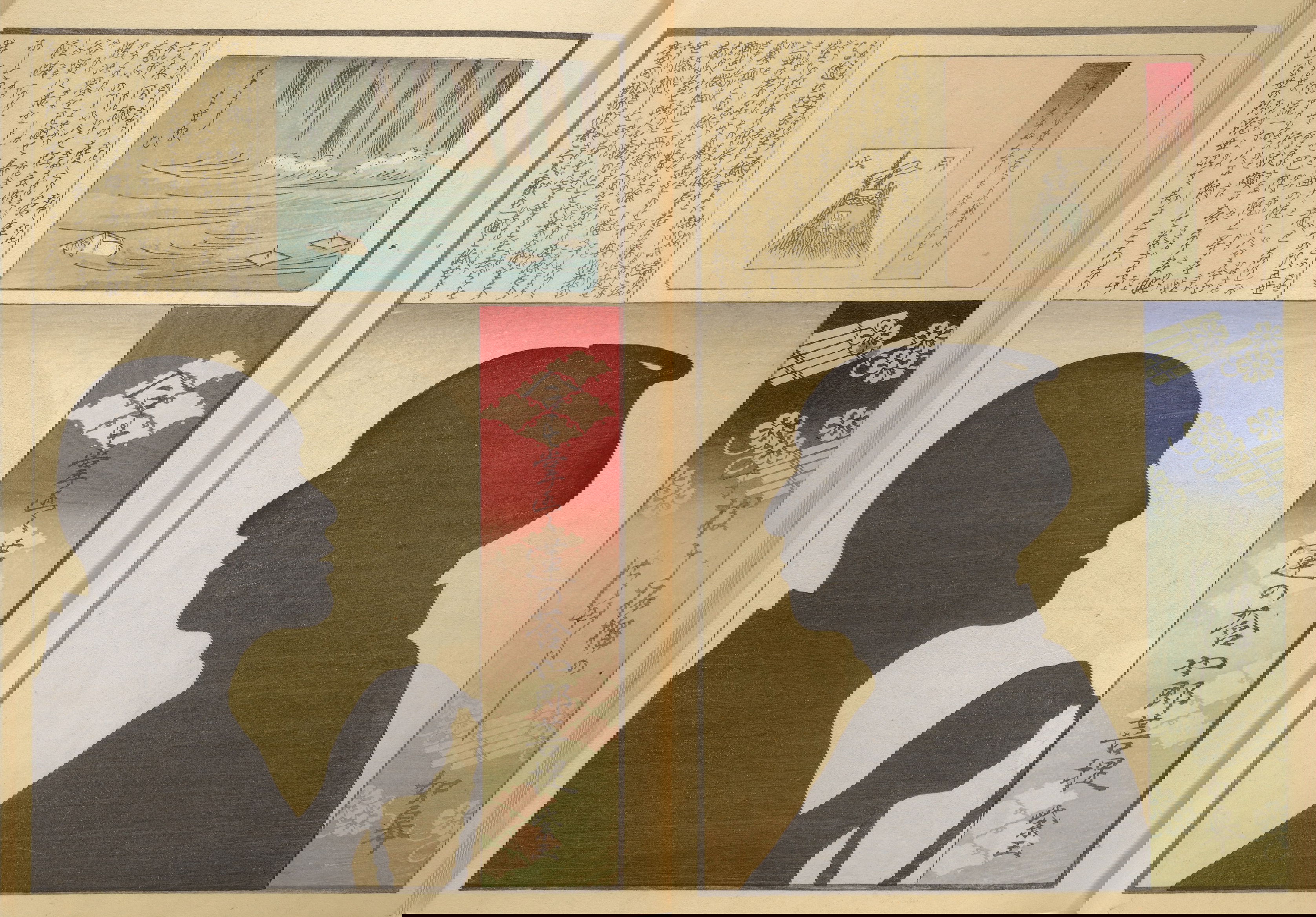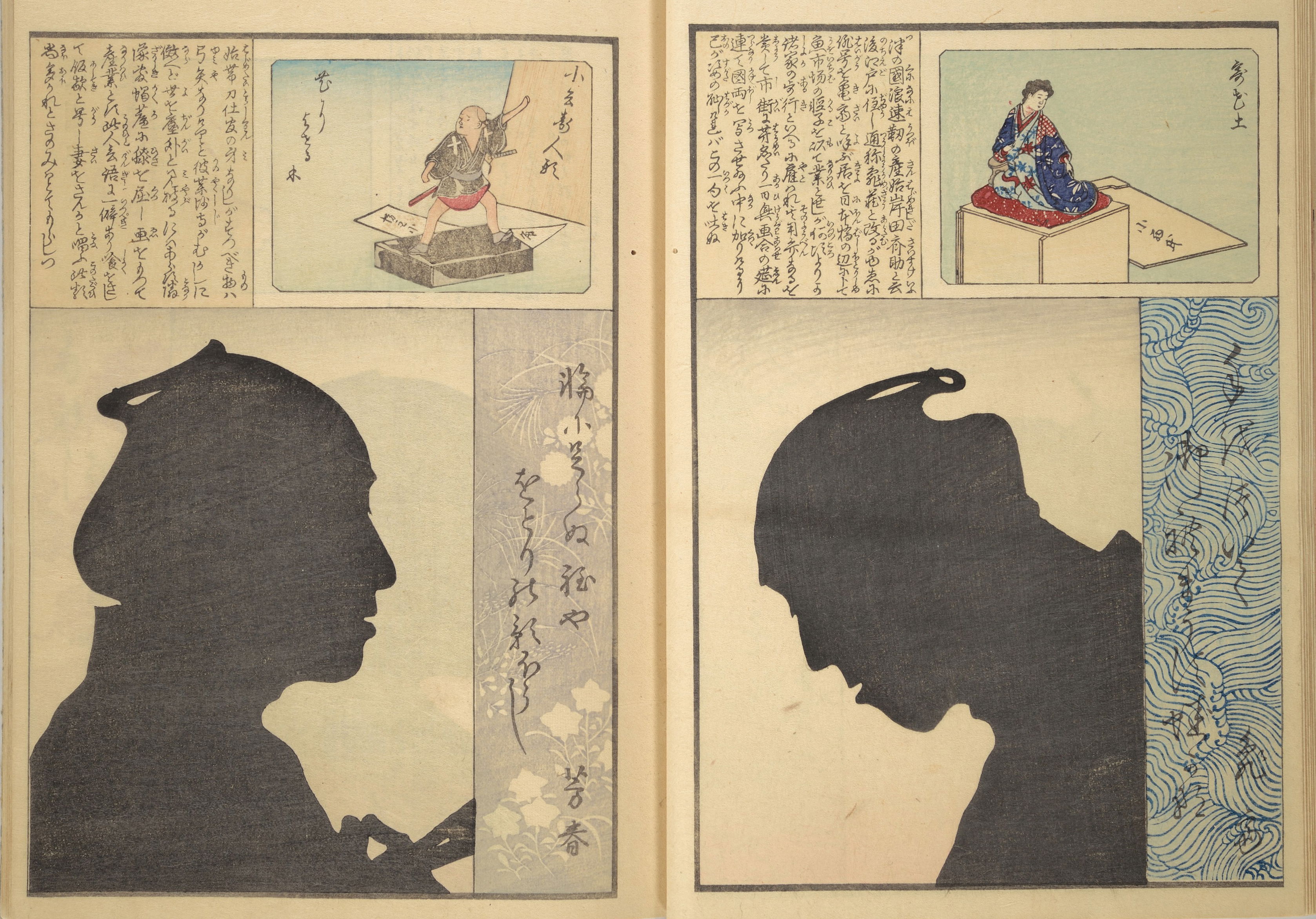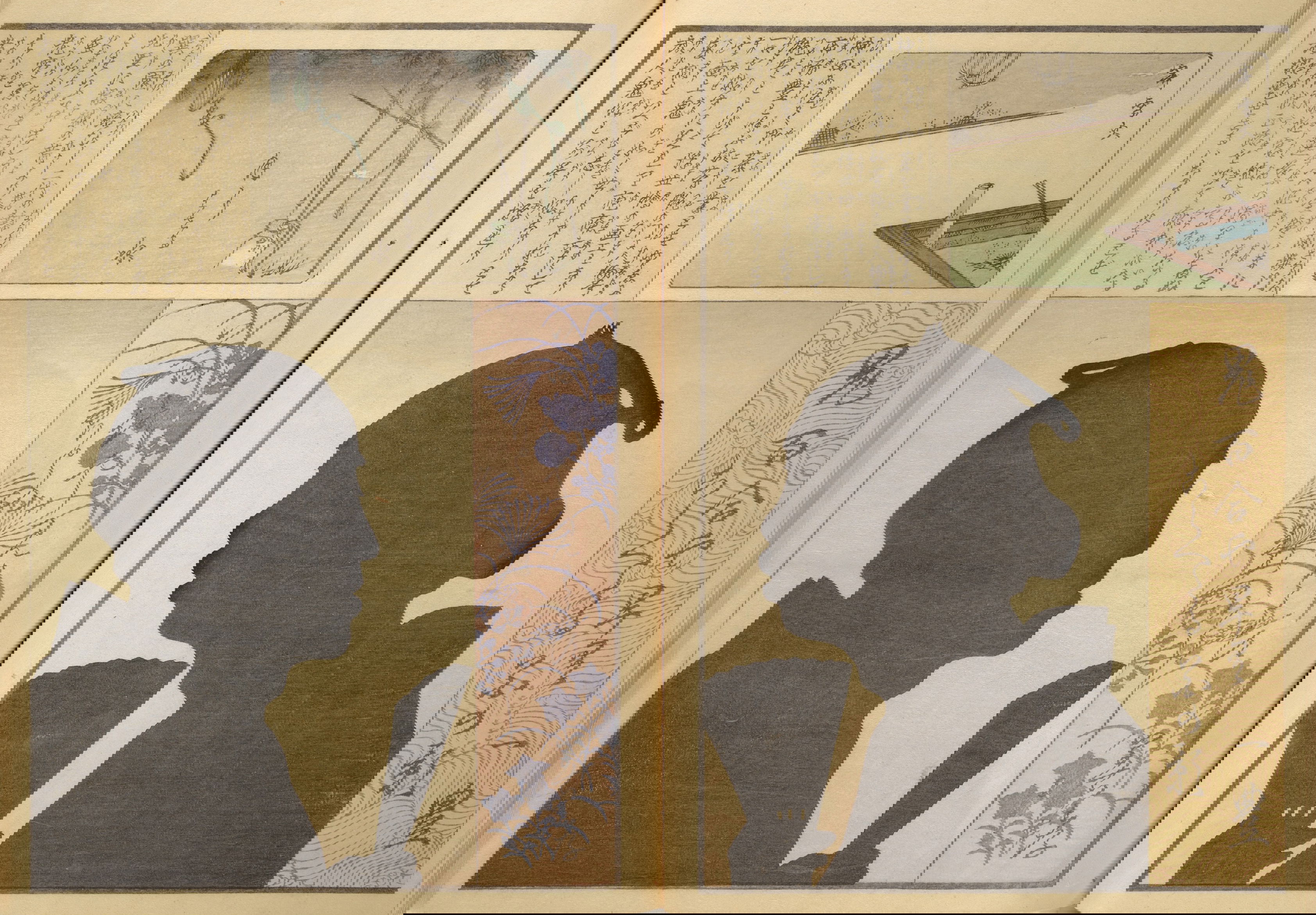 Silhouette portraits came into fashion in late-nineteenth-century Japan following their popularity in Europe and the United States. They were a form of party entertainment. Partygoers would take turns sitting behind a paper sliding door (shōji) while an entertainer captured their backlit silhouettes. A simple leisure activity soon gave way to more complex publications and commemorations. Clear Shadows (Kumanaki kage, 1867), for instance, is a compilation of silhouette portraits depicting members of the kyōga-awase club by the artist Ochiai Yoshiiku (1833–1904), which includes short biographies, picture riddles, and poems. Kyōga-awase (picture-matching for amusement) was played somewhat like Pictionary, where each person was given a subject to illustrate — and could draw anything but the subject itself. Points were awarded on the basis of cleverness.