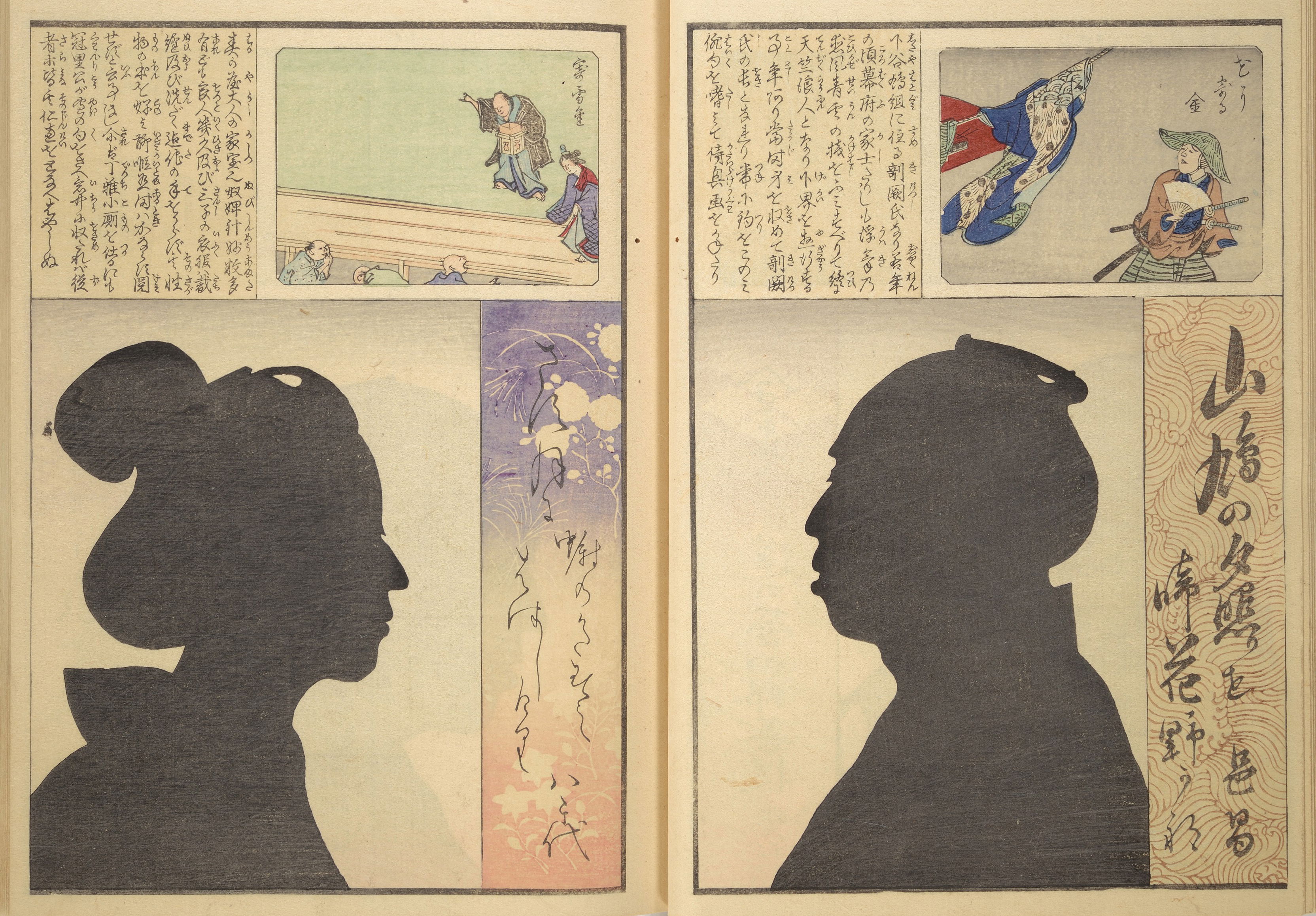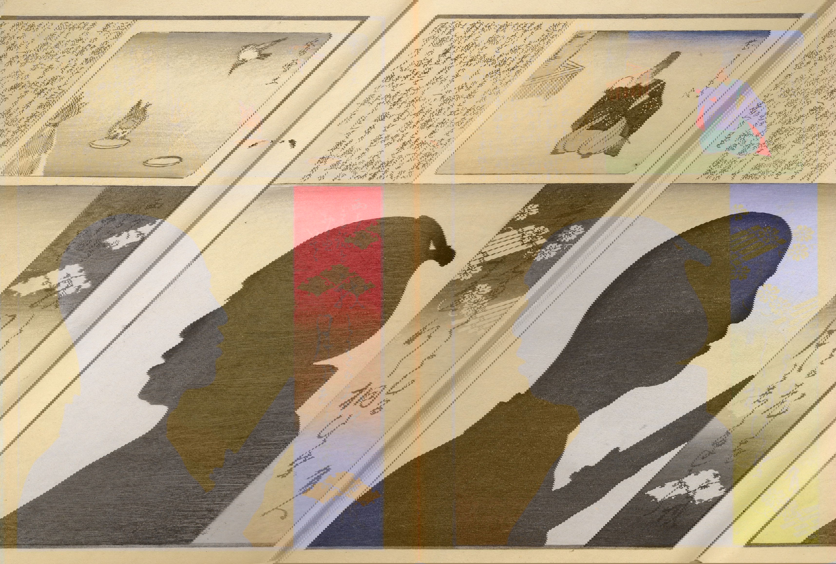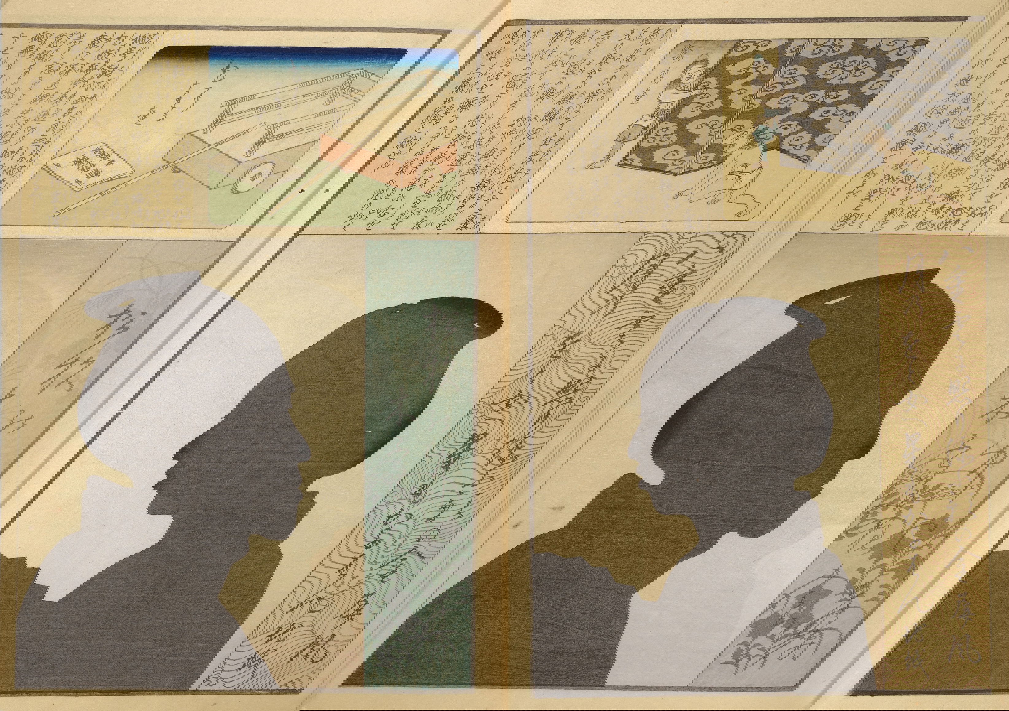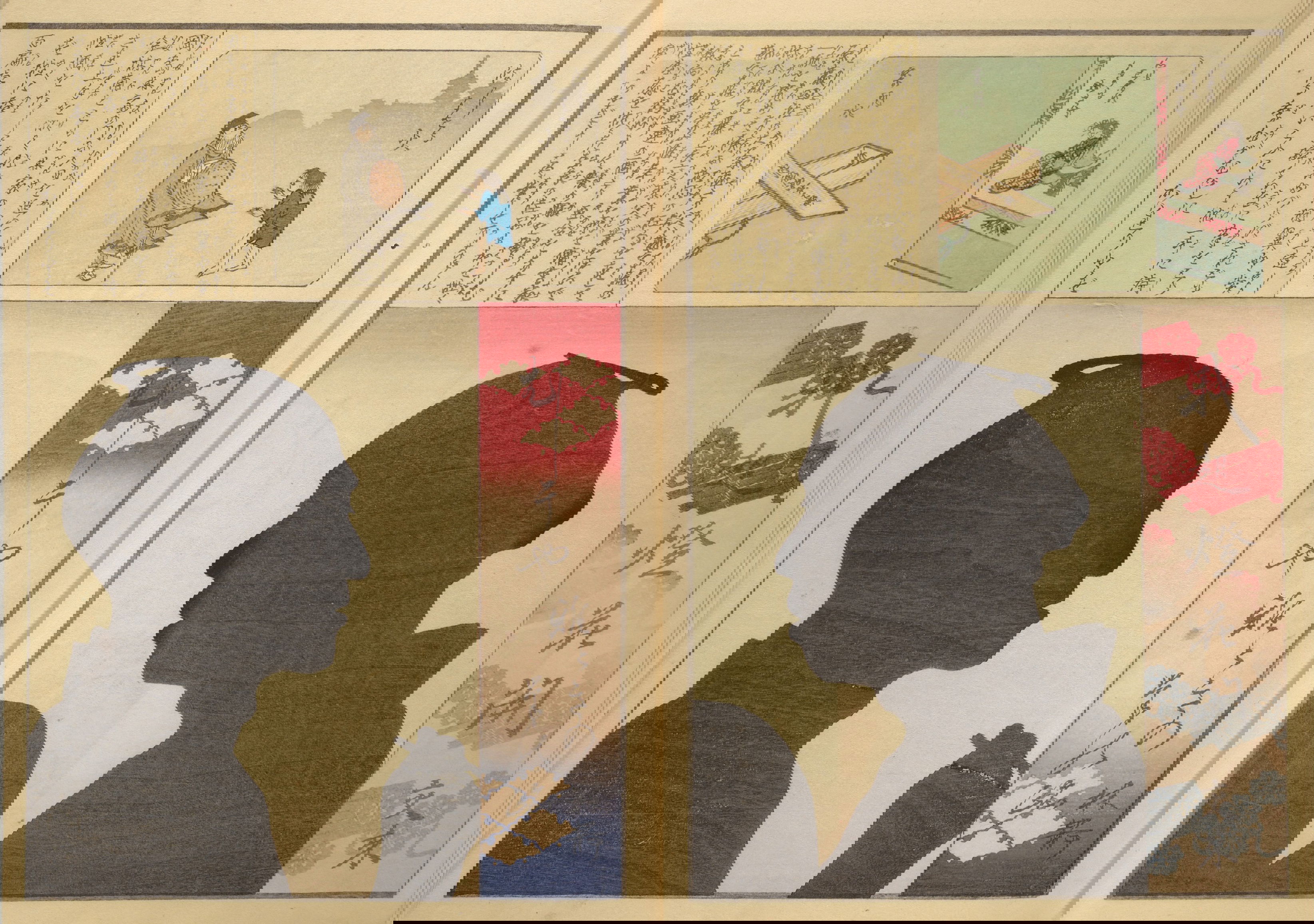 Silhouette portraits came into fashion in late-nineteenth-century Japan following their popularity in Europe and the United States. They were a form of party entertainment. Partygoers would take turns sitting behind a paper sliding door (shōji) while an entertainer captured their backlit silhouettes. A simple leisure activity soon gave way to more complex publications and commemorations. Clear Shadows (Kumanaki kage, 1867), for instance, is a compilation of silhouette portraits depicting members of the kyōga-awase club by the artist Ochiai Yoshiiku (1833–1904), which includes short biographies, picture riddles, and poems. Kyōga-awase (picture-matching for amusement) was played somewhat like Pictionary, where each person was given a subject to illustrate — and could draw anything but the subject itself. Points were awarded on the basis of cleverness.