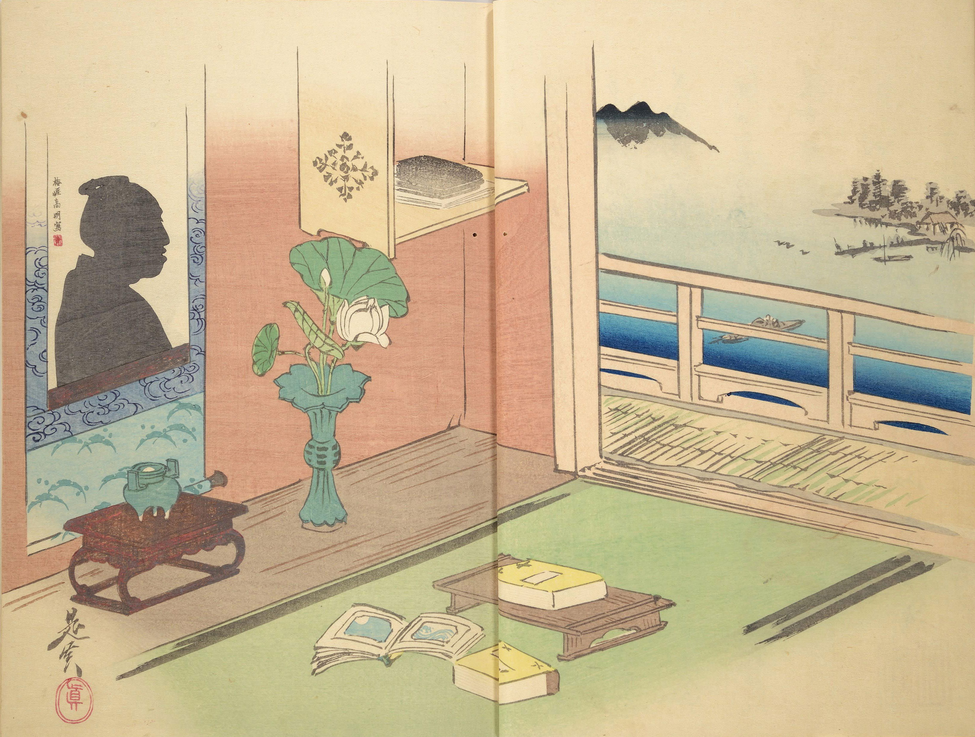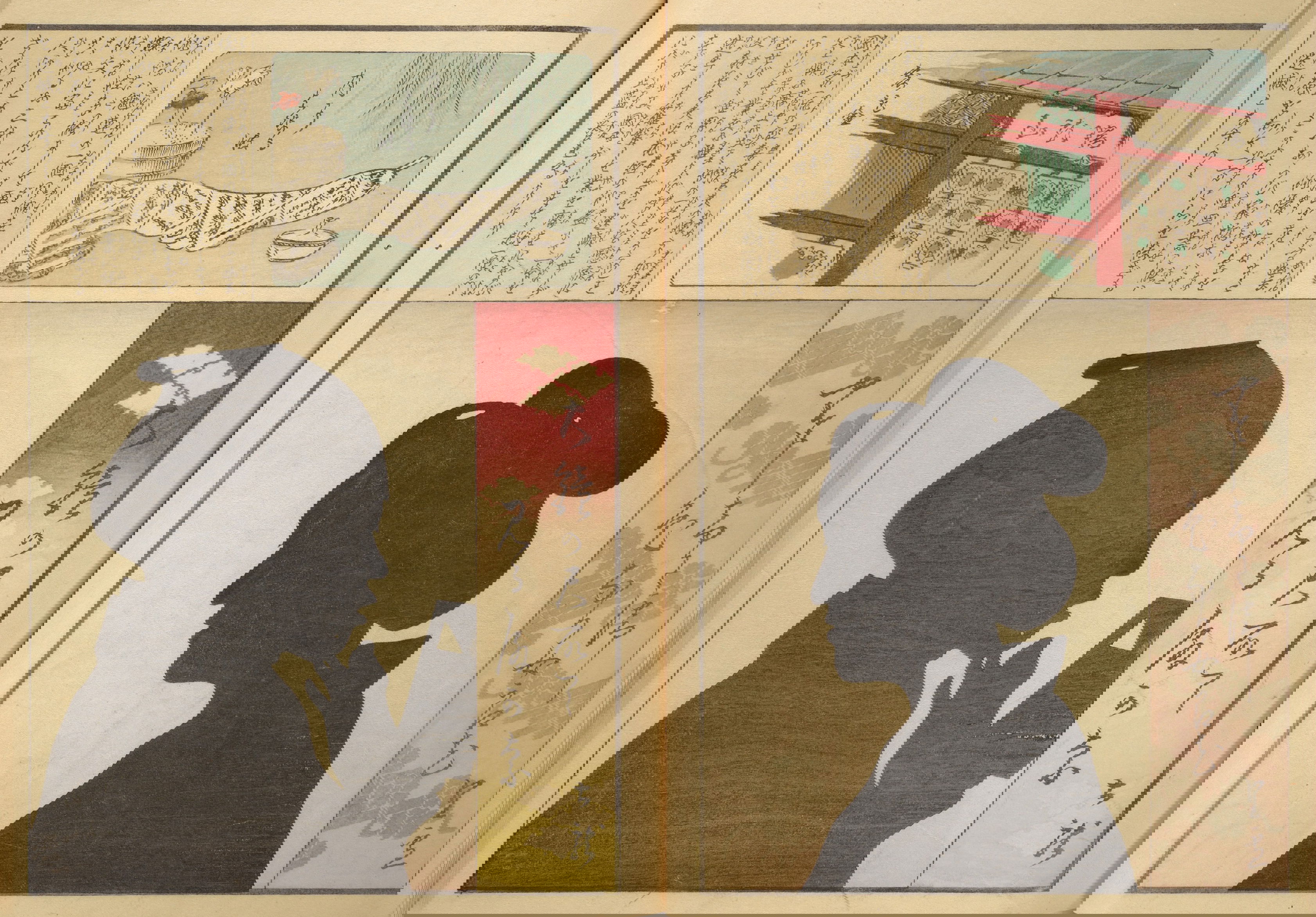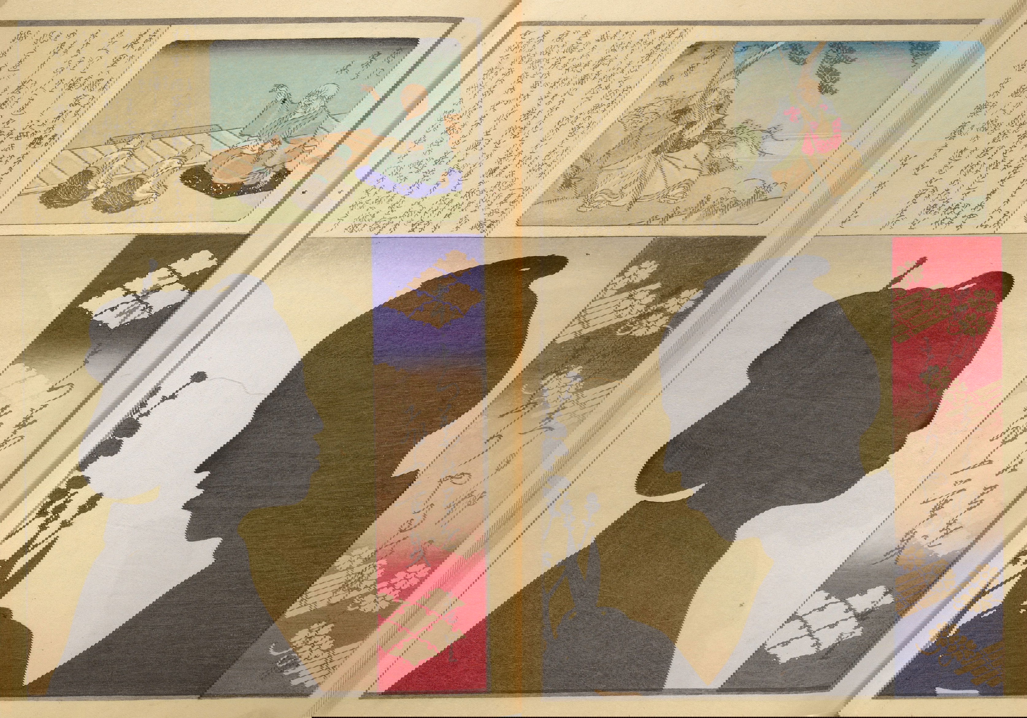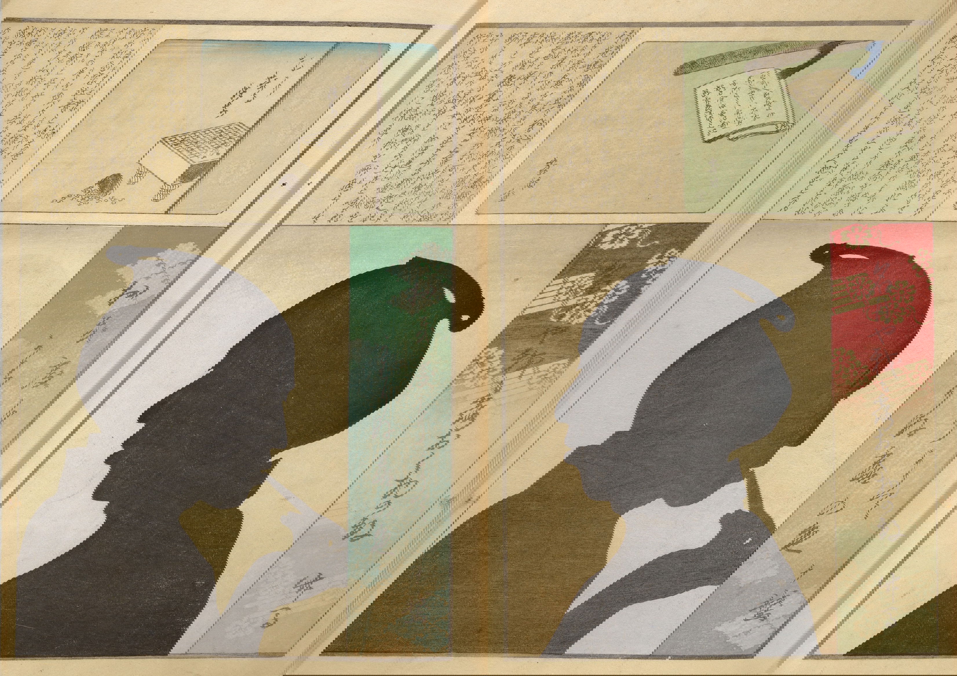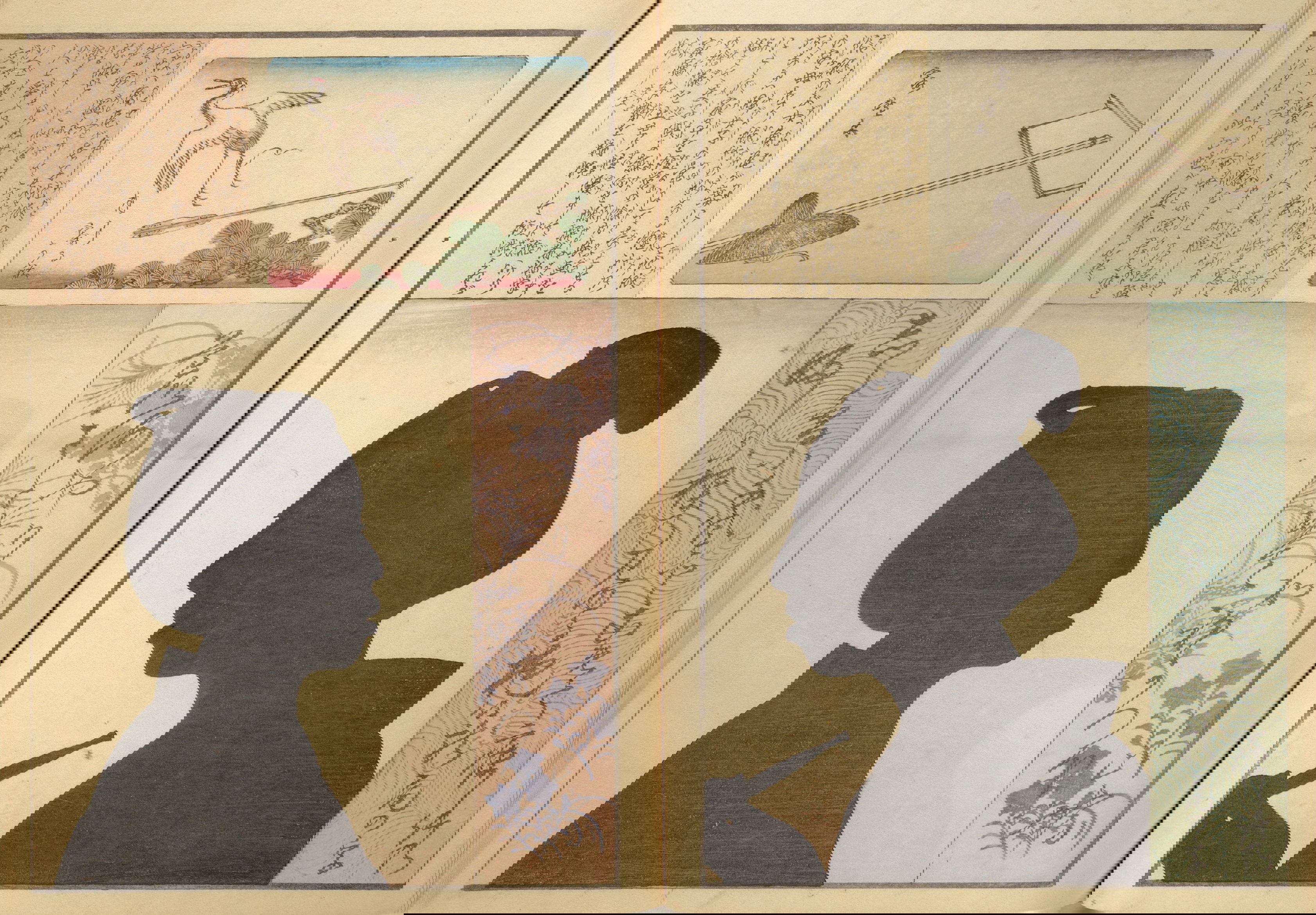 Silhouette portraits came into fashion in late-nineteenth-century Japan following their popularity in Europe and the United States. They were a form of party entertainment. Partygoers would take turns sitting behind a paper sliding door (shōji) while an entertainer captured their backlit silhouettes. A simple leisure activity soon gave way to more complex publications and commemorations. Clear Shadows (Kumanaki kage, 1867), for instance, is a compilation of silhouette portraits depicting members of the kyōga-awase club by the artist Ochiai Yoshiiku (1833–1904), which includes short biographies, picture riddles, and poems. Kyōga-awase (picture-matching for amusement) was played somewhat like Pictionary, where each person was given a subject to illustrate — and could draw anything but the subject itself. Points were awarded on the basis of cleverness.