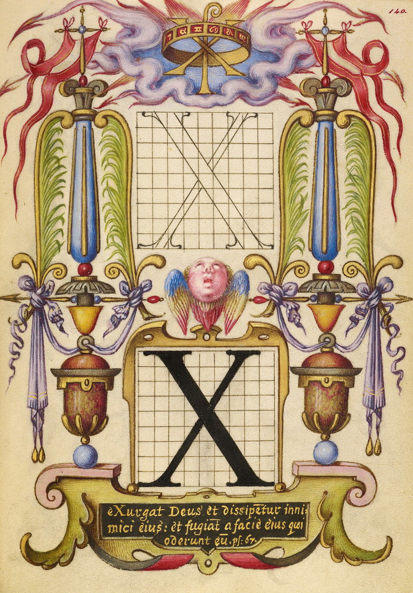 Joris Hoefnagel (1542 - 1601) was a pivotal figure in the history of Dutch art, playing an important role both in the latter stages of the Flemish illumination tradition and the birth of the new genre of still life. In the last decade of his life Hoefnagel was appointed court artist to Holy Roman Emperor Rudolf II, and it was in this time that he appended Georg Bocskay's Model Book of Calligraphy, of thirty years previous, with his own beautifully exquisite "Guide to the Construction of Letters", examples from which are shown below. In each he surrounds the typographic diagram with a colourful array of symbolically charged motifs and, for some, an excerpt from the Bible which begins with the letter of focus.