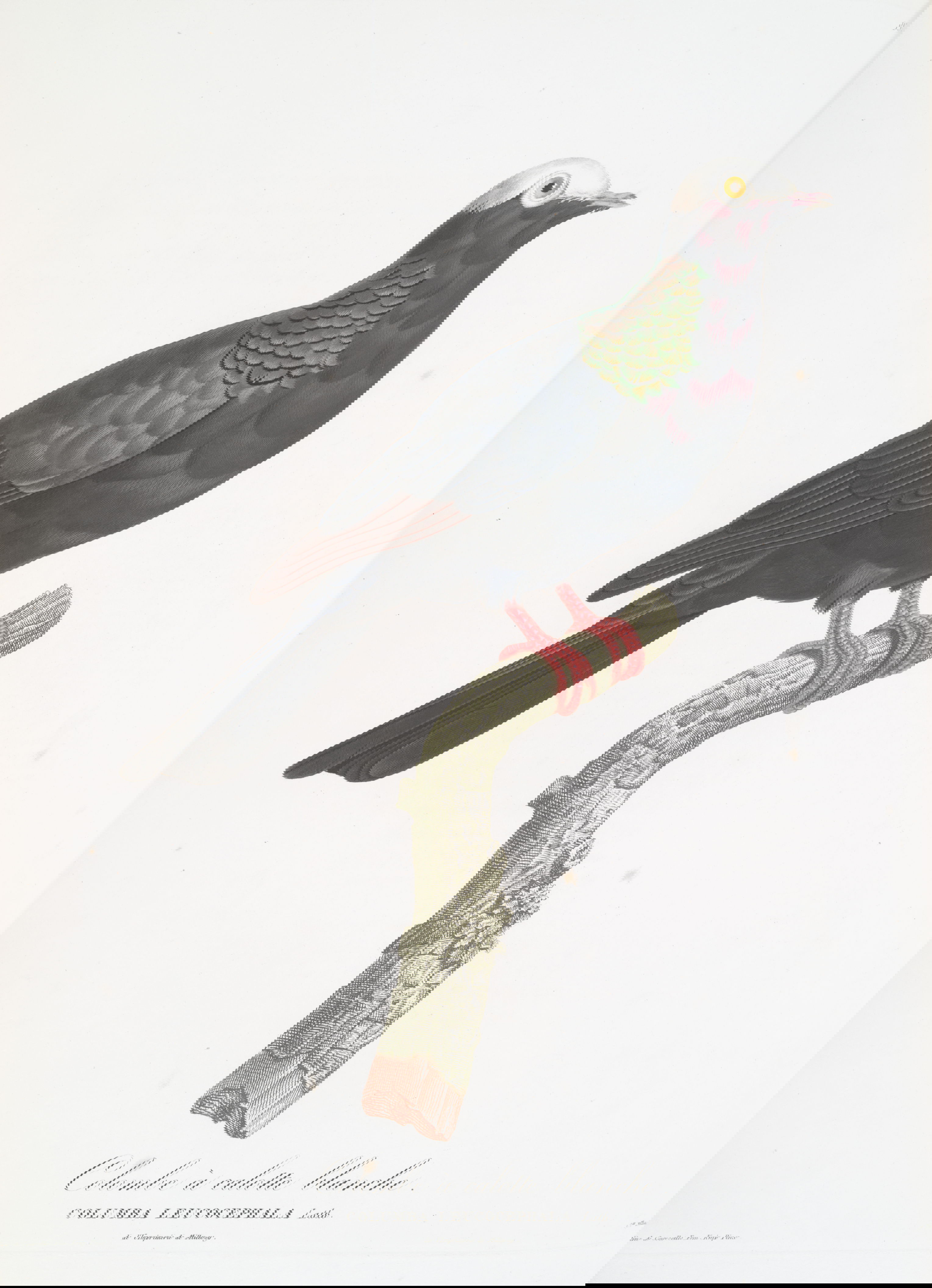 Illustrations after watercolours by Pauline Knip, who credited herself as the author of Dutch naturalist Coenraad Jacob Temminck’s study of columbids.
