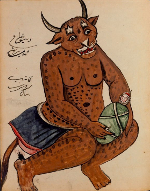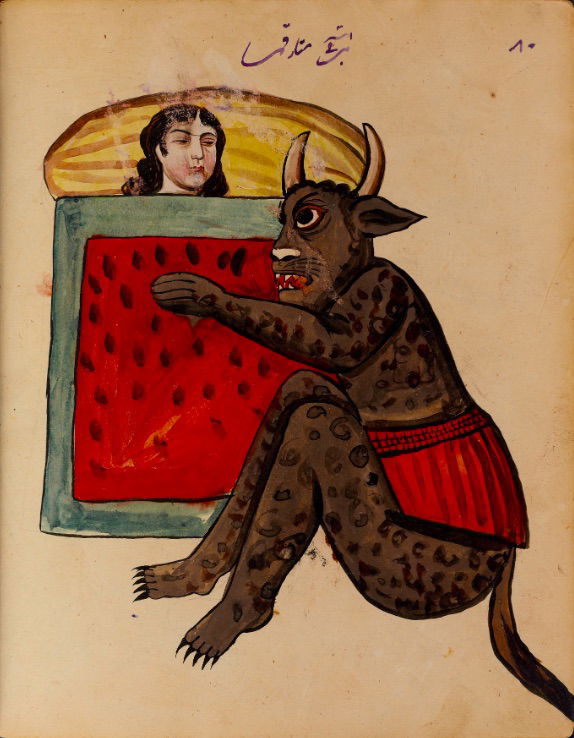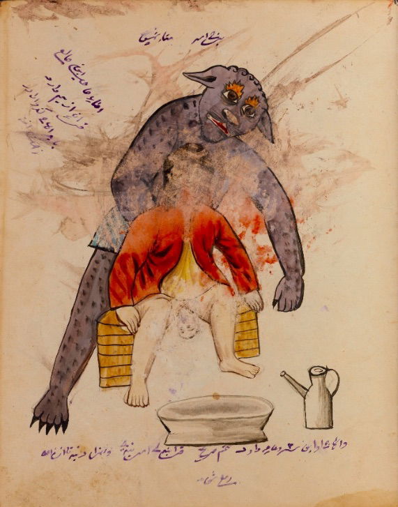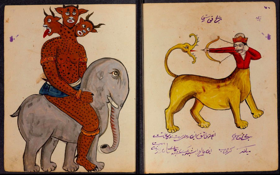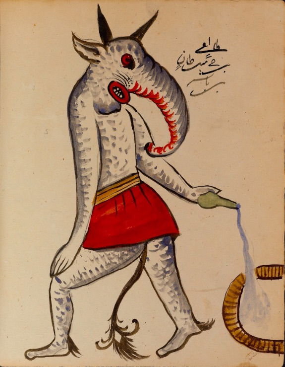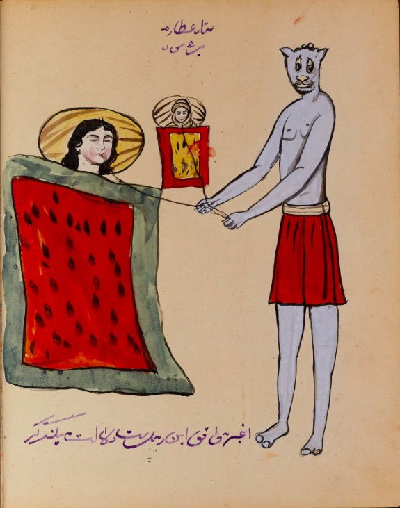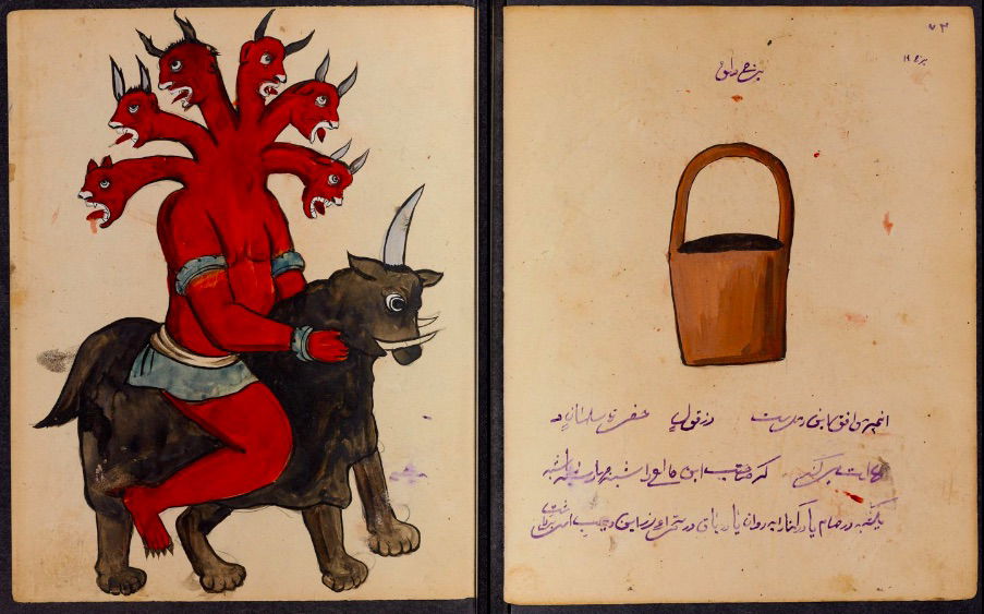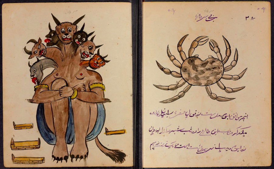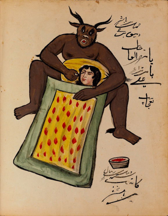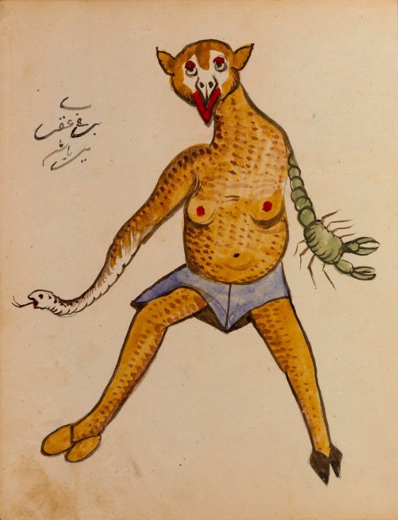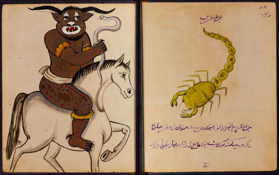 These watercolours come from a bound manuscript written by a rammal — or soothsayer — in Isfahan, Iran. According to Ali Karjoo-Ravary, the paintings were added one or two decades after the composition of the text — a treatise on spells and demons, “among other creatures, that are associated with each sign of the zodiac.” The pictures, Karjoo-Ravary continues: