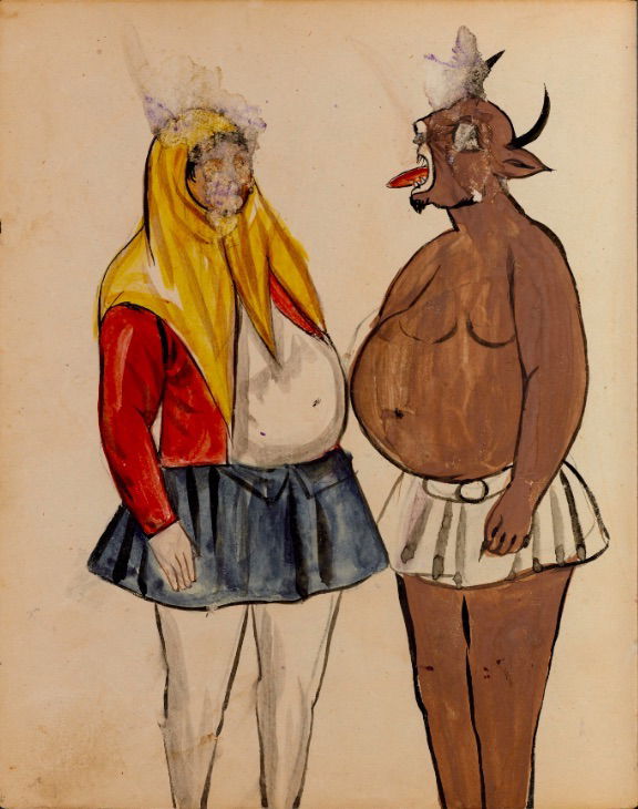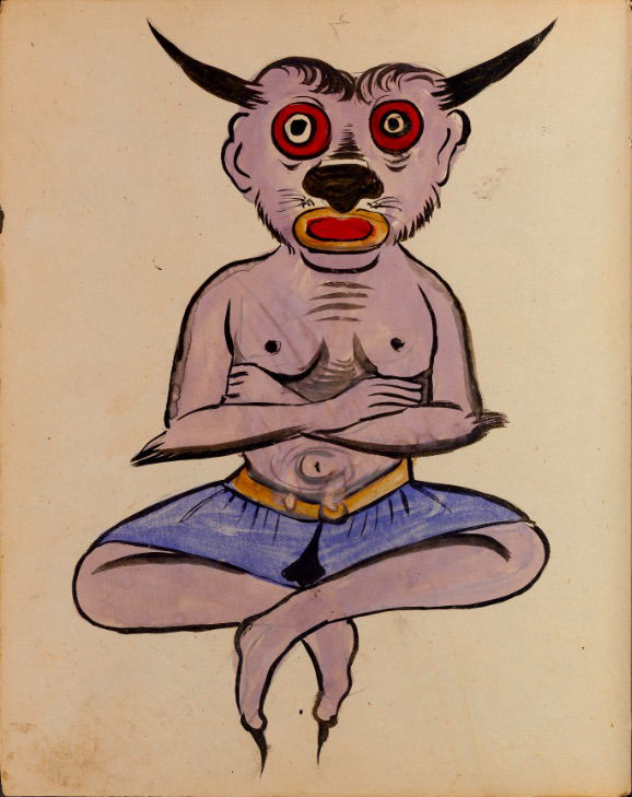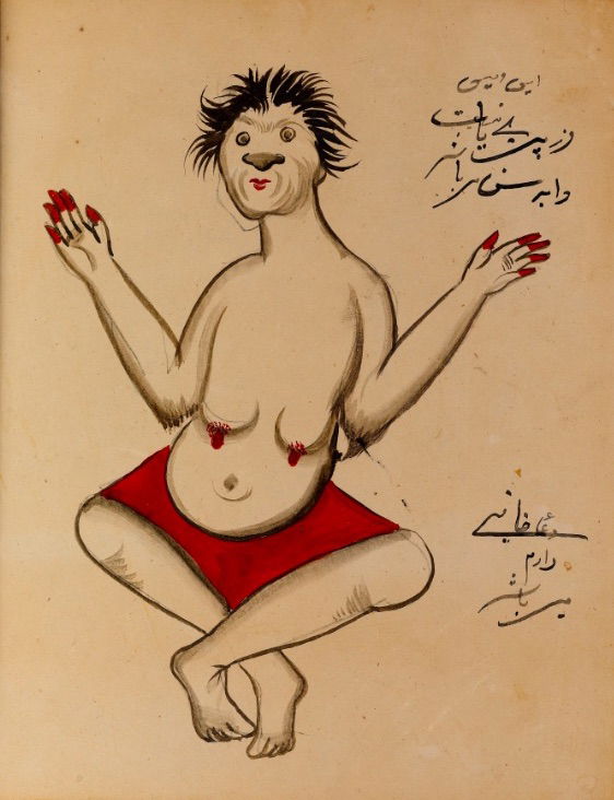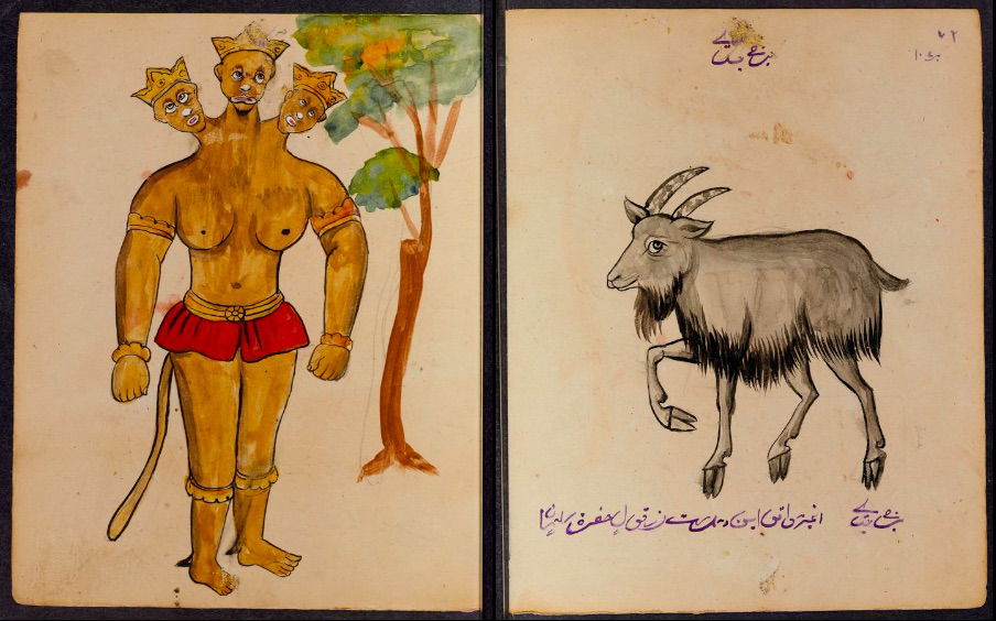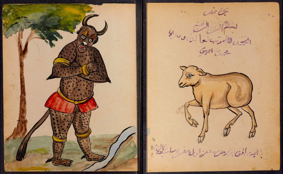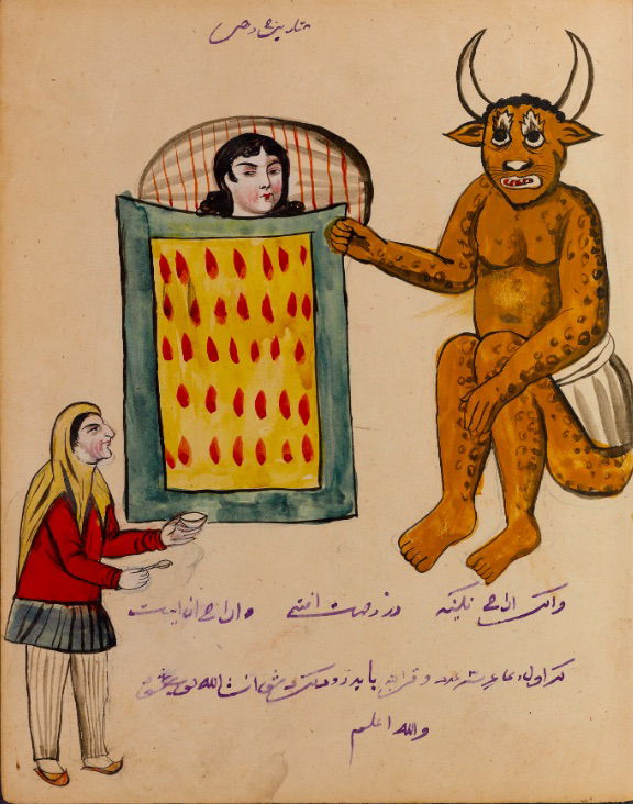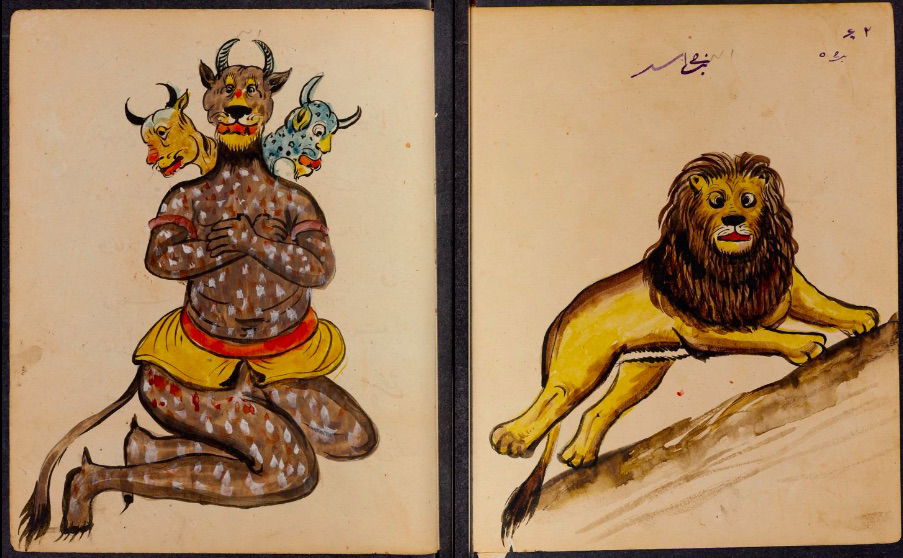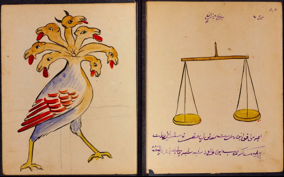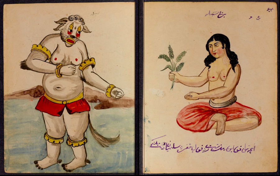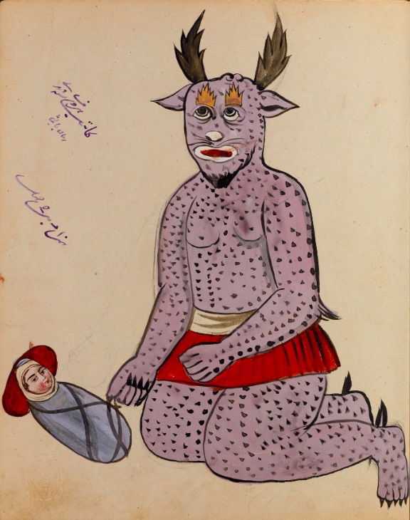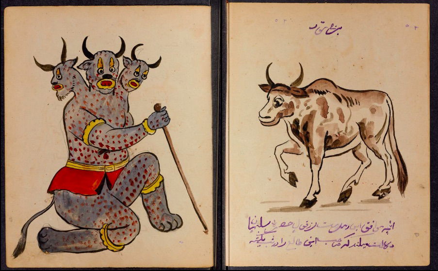 These watercolours come from a bound manuscript written by a rammal — or soothsayer — in Isfahan, Iran. According to Ali Karjoo-Ravary, the paintings were added one or two decades after the composition of the text — a treatise on spells and demons, “among other creatures, that are associated with each sign of the zodiac.” The pictures, Karjoo-Ravary continues: