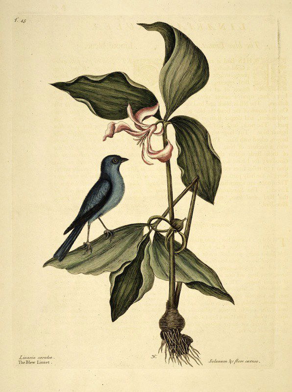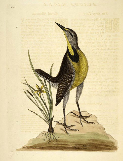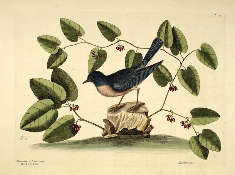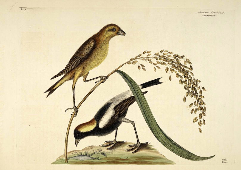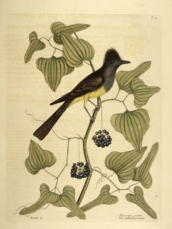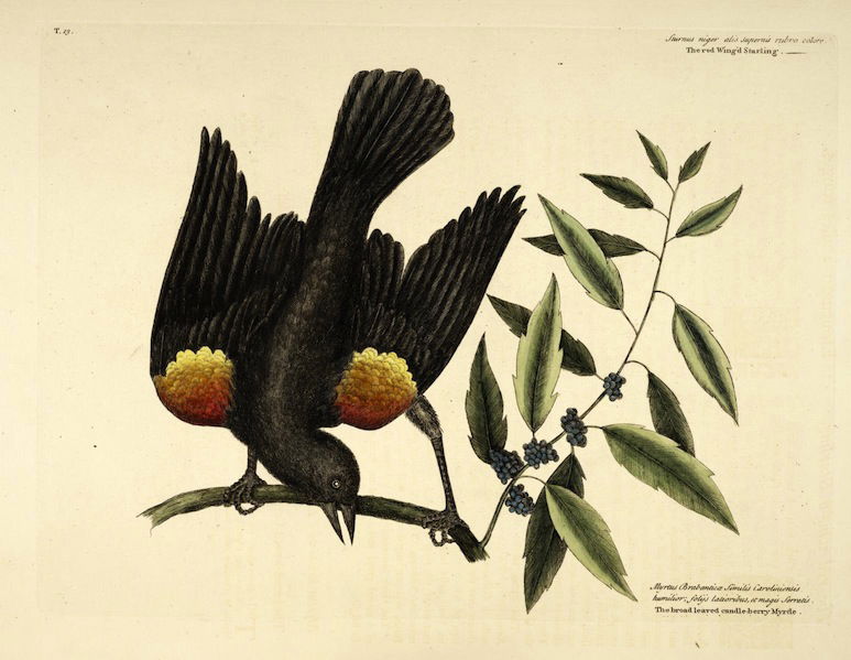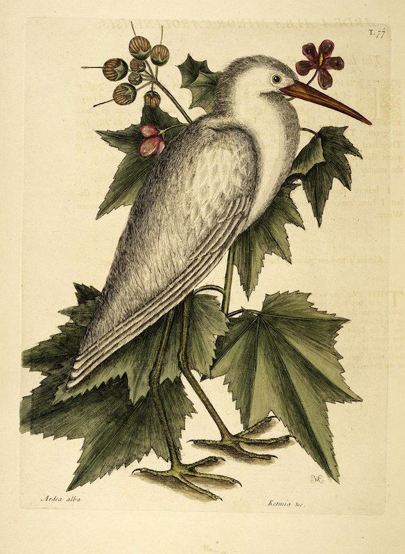 A selection of birds as featured in Volume 1 of (the magnificently titled) Natural History of Carolina, Florida, and the Bahama Islands: containing the figures of birds, beasts, fishes, serpents, insects, and plants: particulary the forest-trees, shrubs, and other plants, not hitherto described, or very incorrectly figured by authors. Together with their descriptions in English and French. To which are added, observations on the air, soil, and waters: with remarks upon agriculture, grain, pulse, roots, &c., by Mark Catesby and George Edwards.