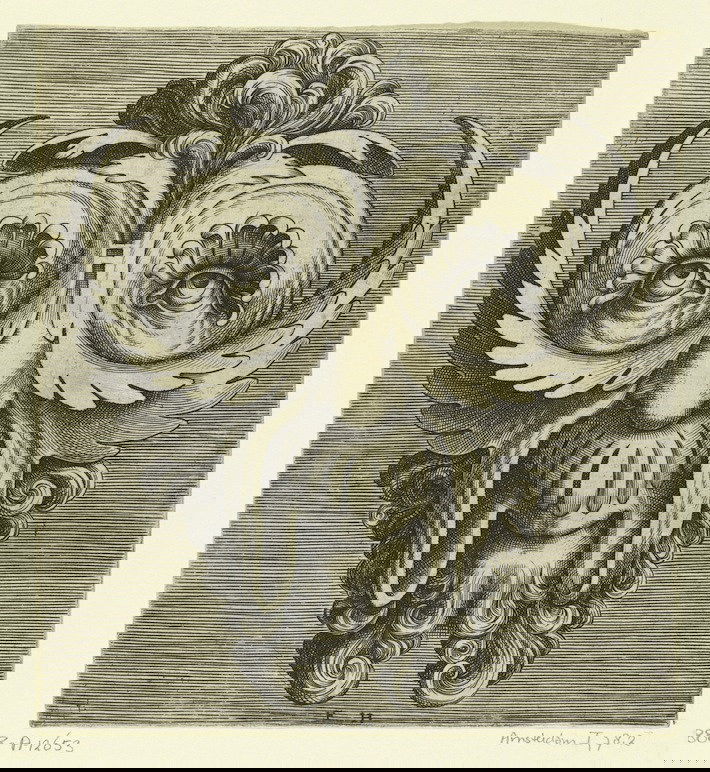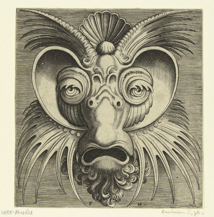 A selection of stunning mask designs from the hand of Flemish engraver Frans Huys, rooted in the "grotesque" style and composed of shapes inspired from creaturely and vegetative forms (forming a style that would later become known as "auricular"). Huys apparently based these prints on original designs by the sculptor and architect Cornelis Floris (1514-1575), who is credited with inventing this particular Flemish version of the grotesque style in about 1541. The prints come from a set published in 1555 by Hans Liefrinck (about 1518-1573), an important Antwerp publisher and print-seller. The volume - bearing the full title of "Pourtraicture ingenieuse de plusieurs façons de masques, forts utile aulx painctres, orseures, taillieurs de pierres, voirriers, & tailleurs d'images" - is thought to have contained at…