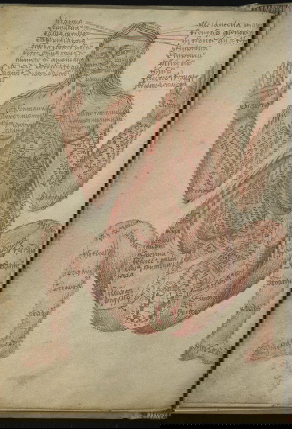 Anatomical illustrations from an English medical treatise dating from the mid 15th century. Amongst the images — which show both the outer as well as the inner structure of the body — is the striking "wound man" illustration, depicting a man who has been stabbed, bitten, and wounded by arrows, as well as bludgeoned in the arm and head. Although the exact purpose of these "wound man" images — which appear in numerous other 15th and 16th-century works — is not known, they appear to be some attempt to communicate all the different injuries to which the body can be subjected, in some cases offering up accompanying treatments. The author of this particular treatise is unknown, though it is attributed to Pseudo-Galen, meaning that the…