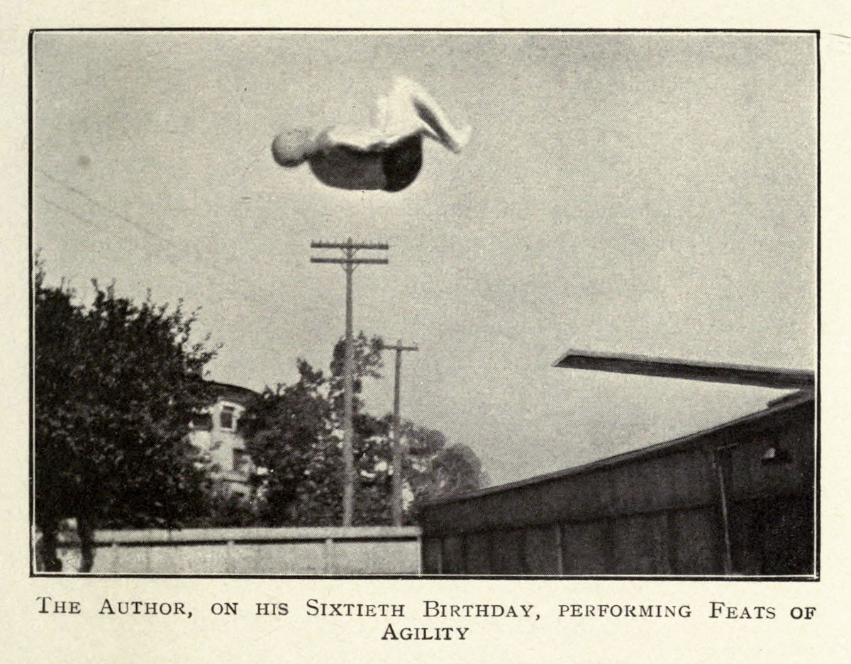 Photograph of Horace Fletcher mid-acrobatic somersault from his Fletcherism, What It Is; or, How I Became Young at Sixty (1913).